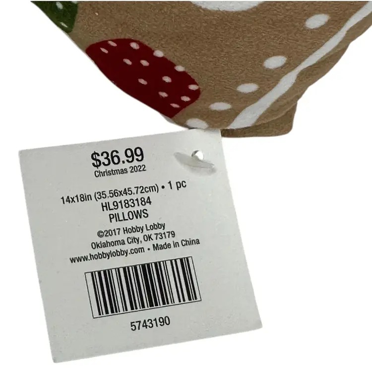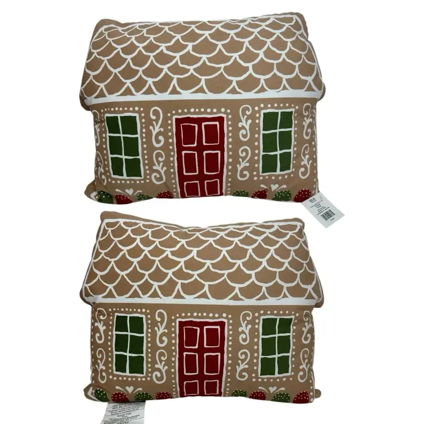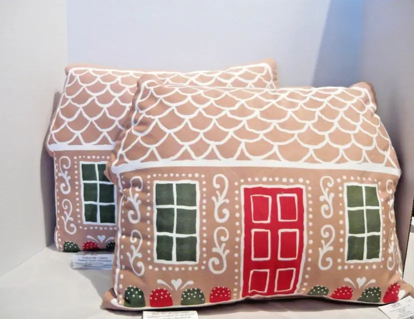 This product is a set of two 14" x 18" Gingerbread House Christmas soft velvet throw pillows from Hobby Lobby. The pillows feature a rectangular shape with a brown color and are filled with 100% polyester. They are designed for the holiday season, specifically Christmas, and are decorated with a gingerbread character theme. The plush and soft velvet material adds a cozy and festive touch to any room in the house. Perfect for adding a touch of holiday cheer to your home décor, these decorative pillows are easy to care for with spot cleaning instructions.