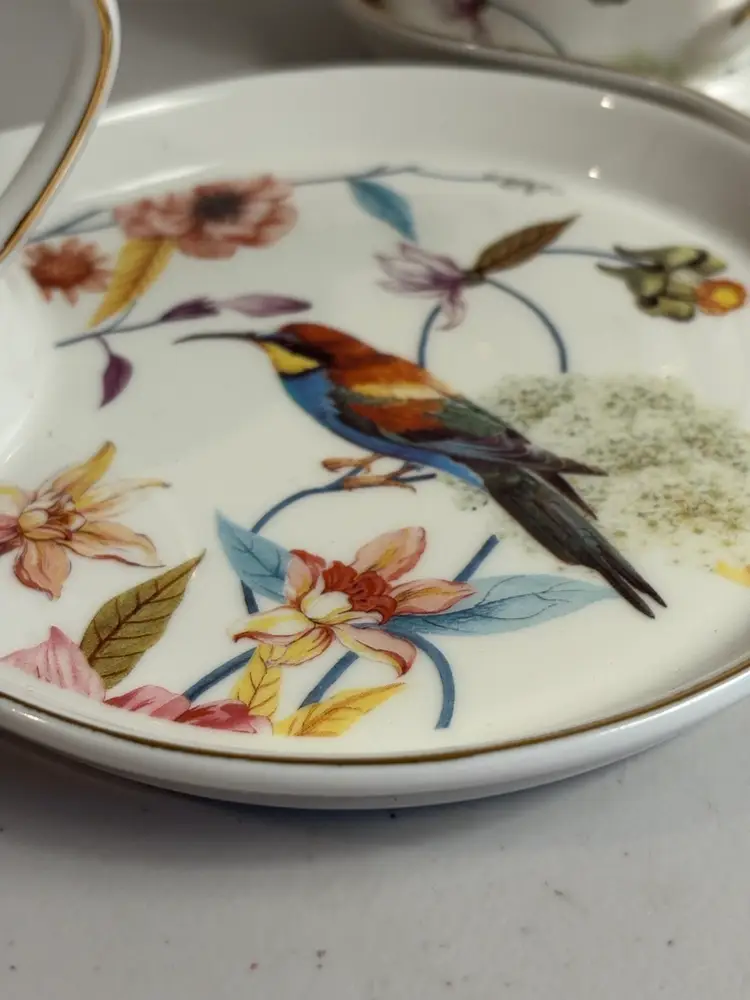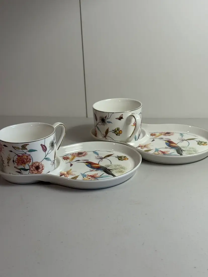 The Two Grace Teaware Fine China Teacups and Matching Snack Plate set includes two round teacups with a capacity of 12 ounces each. The cups feature a painted design of floral and hummingbirds, adding a contemporary and elegant touch to your tea-drinking experience. Made of high-quality porcelain, this set is dishwasher safe for easy cleaning. Perfect for all occasions, this teacup and snack plate set from Grace Teaware is a lovely addition to any dinnerware collection.