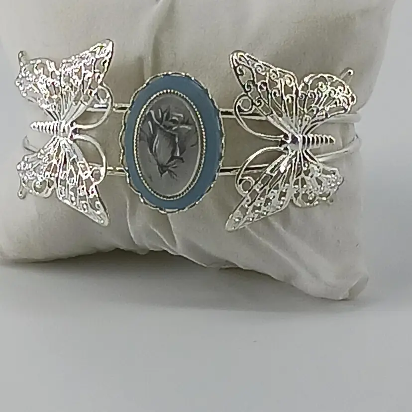 BM719 – Silver plated cuff bracelet with two filigree butterflies attached holds a 1 x ¾ inch blue glass cabochon with silver rose transferred to glass setting that is made in Germany in a cabochon setting in the center.