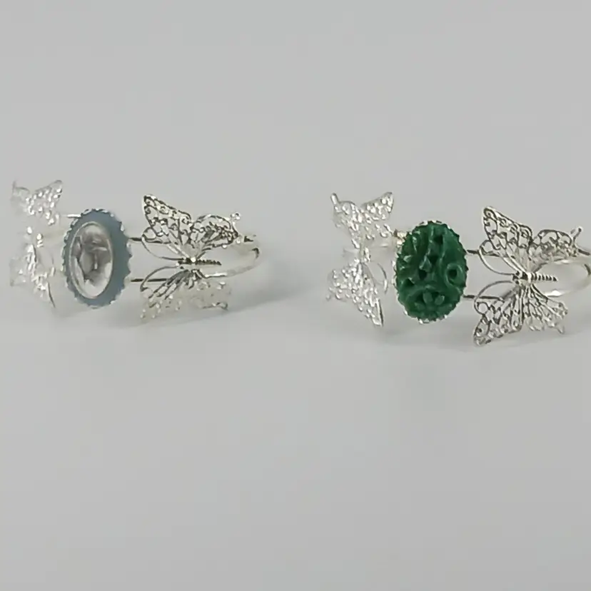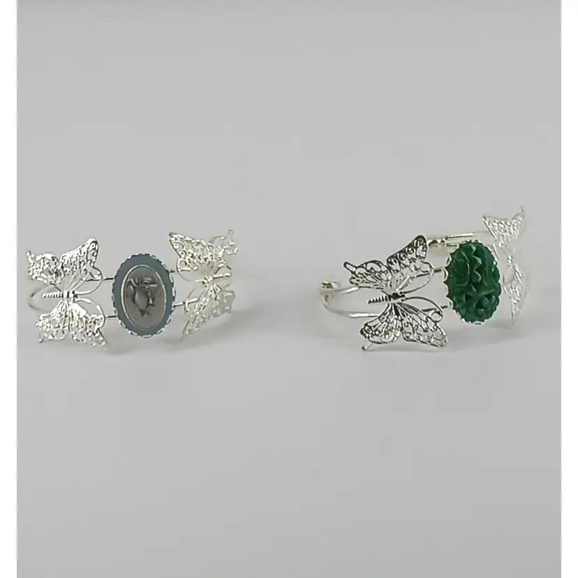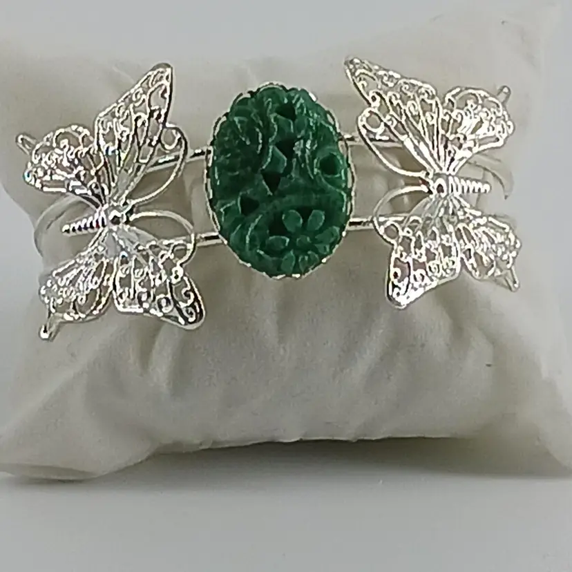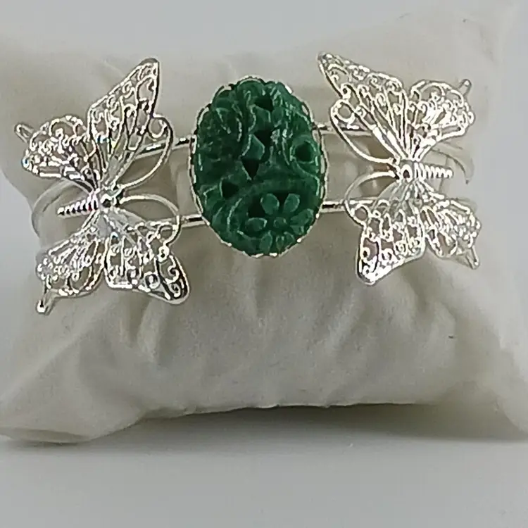 BM-716 – Silver plated cuff bracelet with two filigree butterflies attached holds a 1" x 3/4" carved green jade stone in a cabochon setting in the center.