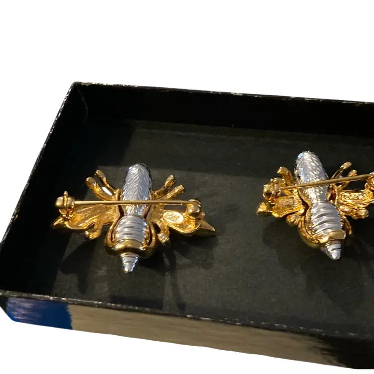 Two small gold tone bee brooches with interchangeable stones. Signed Joan Rivers.