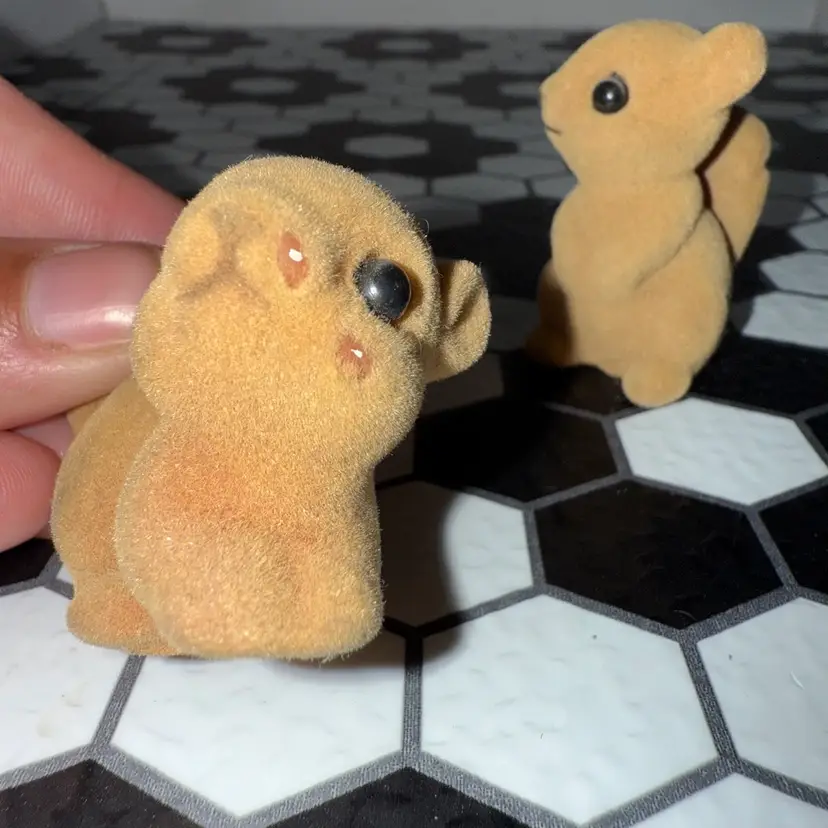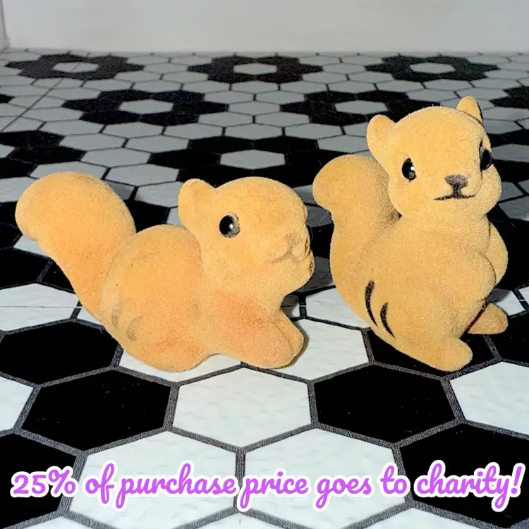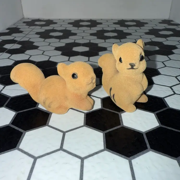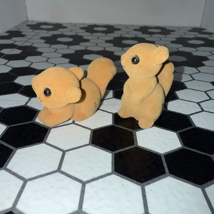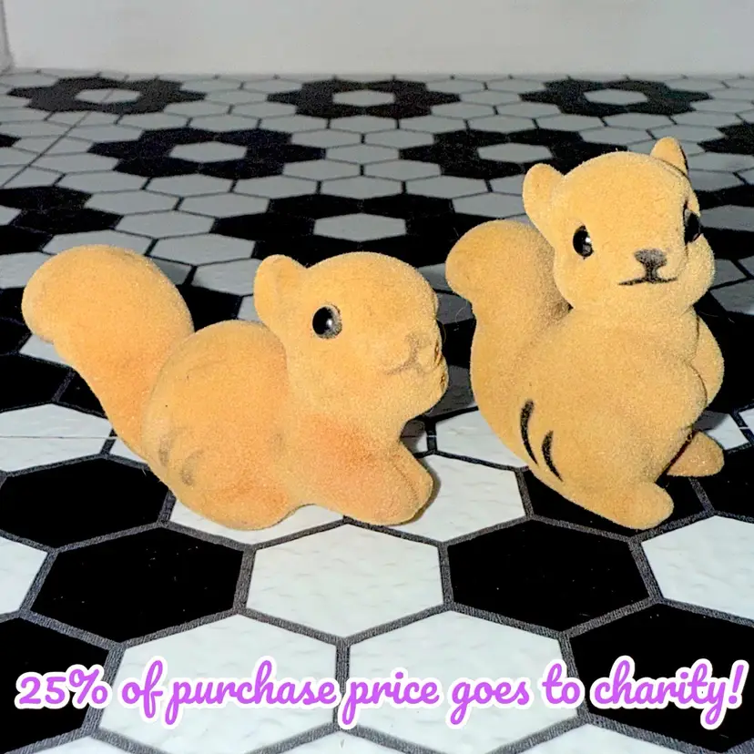 Two lil flocked squirrels doing squirrels doing squirrel poses; one has “scarring” on its cheek