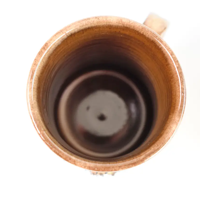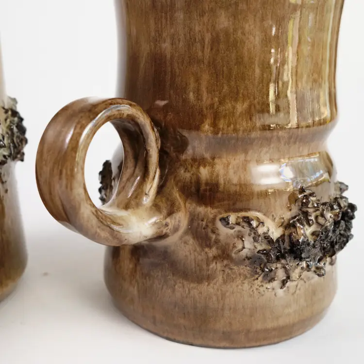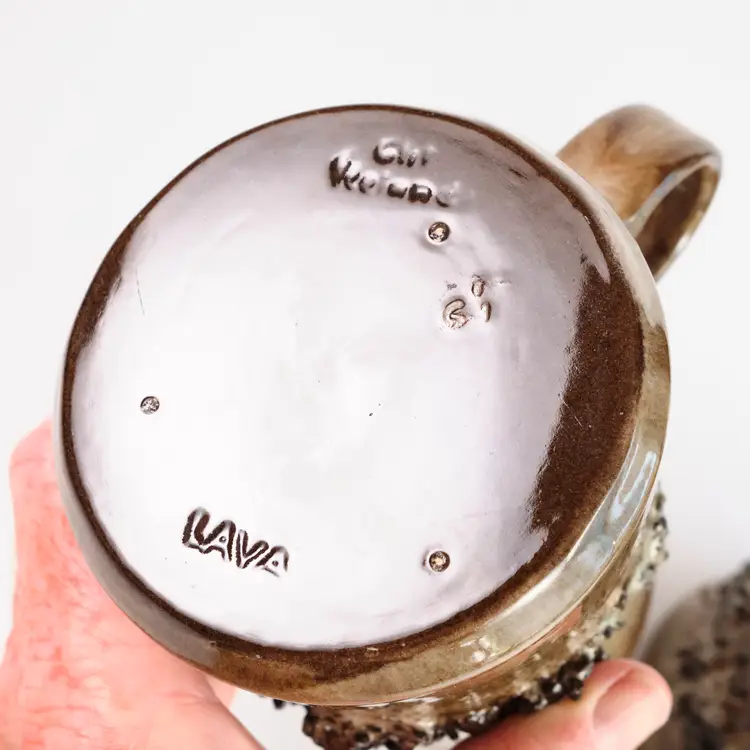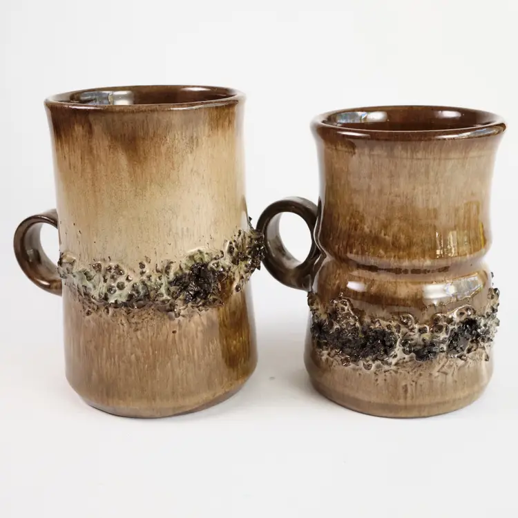Two 1970s studio pottery mugs from Glit Pottery in Reykjavík, Iceland. They feature hardened lava rock fired on the surface with glazes. Made from native Icelandic clay. One is slightly larger than the other. Impressed mark on the base.