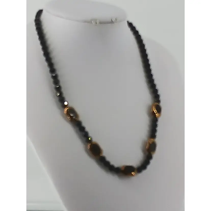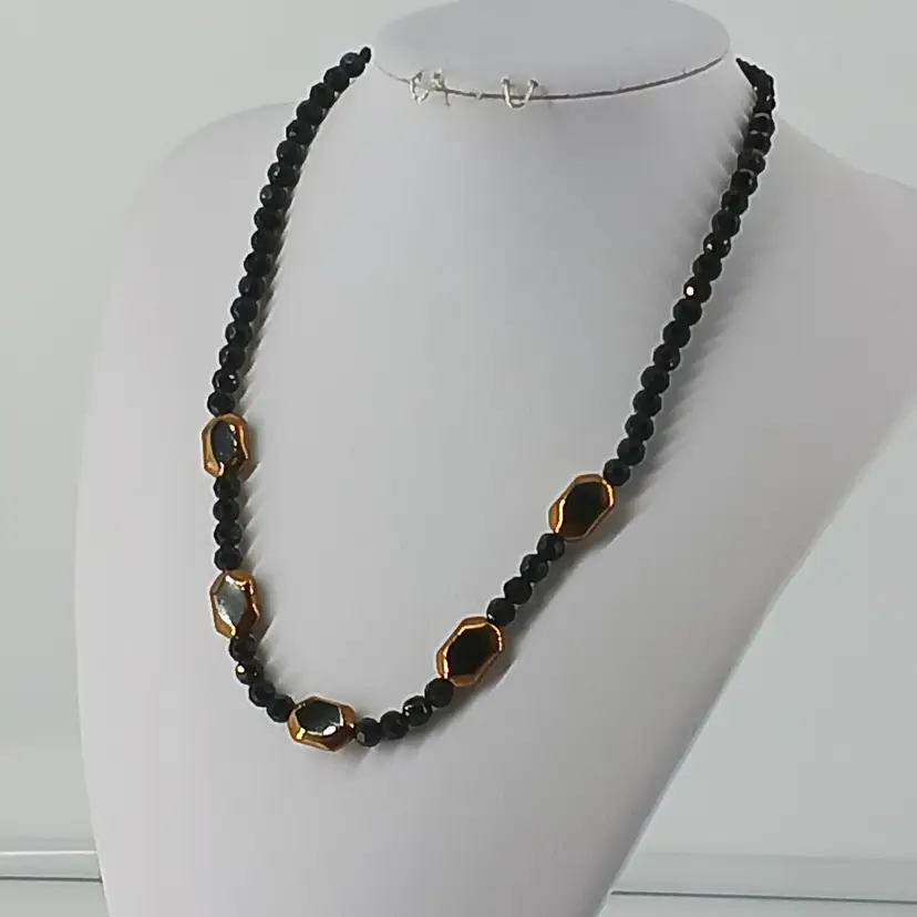 NM-2463 – Five Vintage Antique Gold cut to Black glass 7/16 x 5/8 x ¼ inch bead has been spaced between 3/16 inch Black glass bicone beads and then 1/8 inch Black glass bicone beads to finish off this 19 ½ inch necklace.