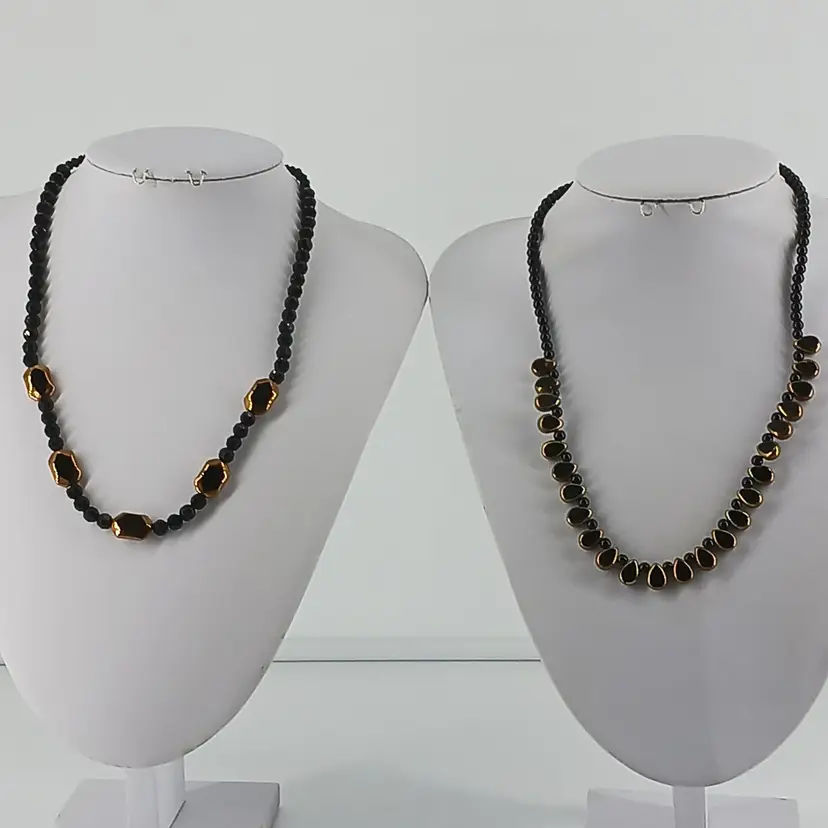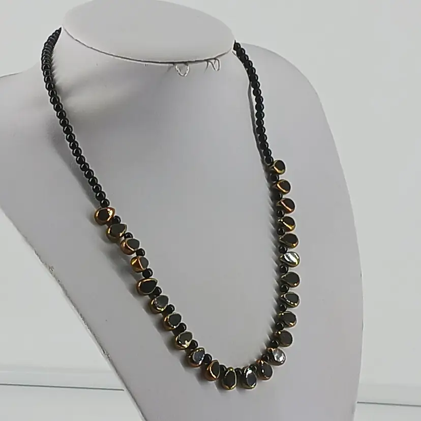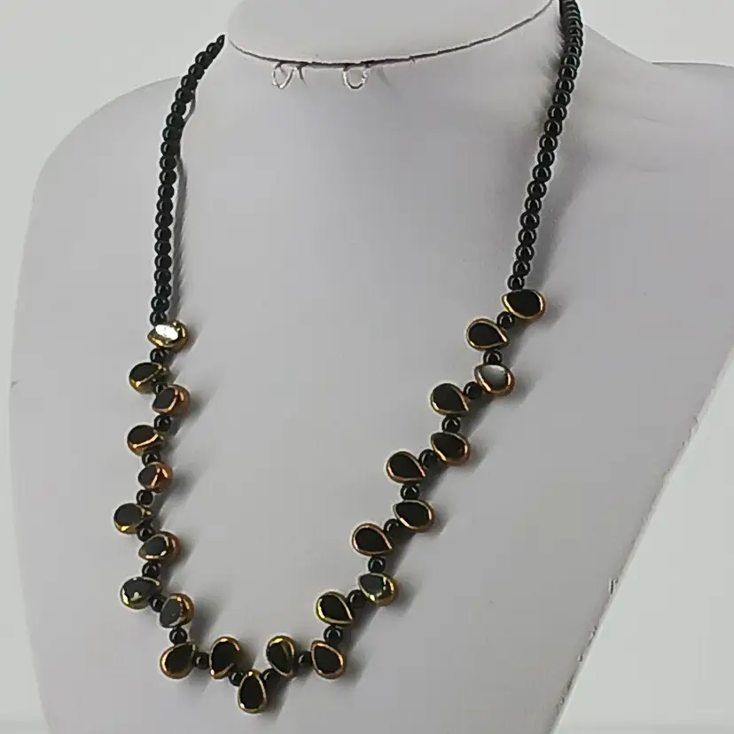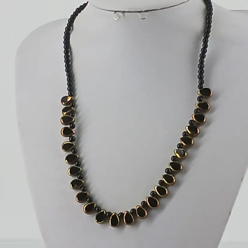 NM2465 – Twenty Four Vintage Antique Gold Cut to Black Glass beads in Drop shape that measure ¼ x 3/8 x 3/16 inches are spaced between ¼ inch Black Glass beads to make this 19 ½ inch necklace. Drop beads can be worn facing the same direction or switch to up and down as shown in picture.
