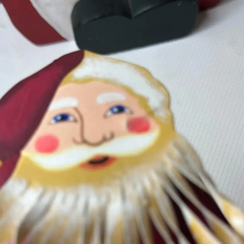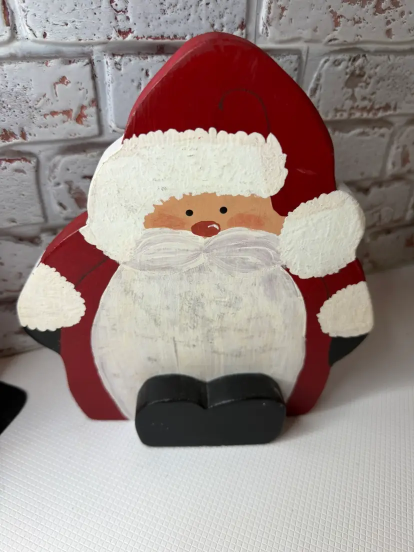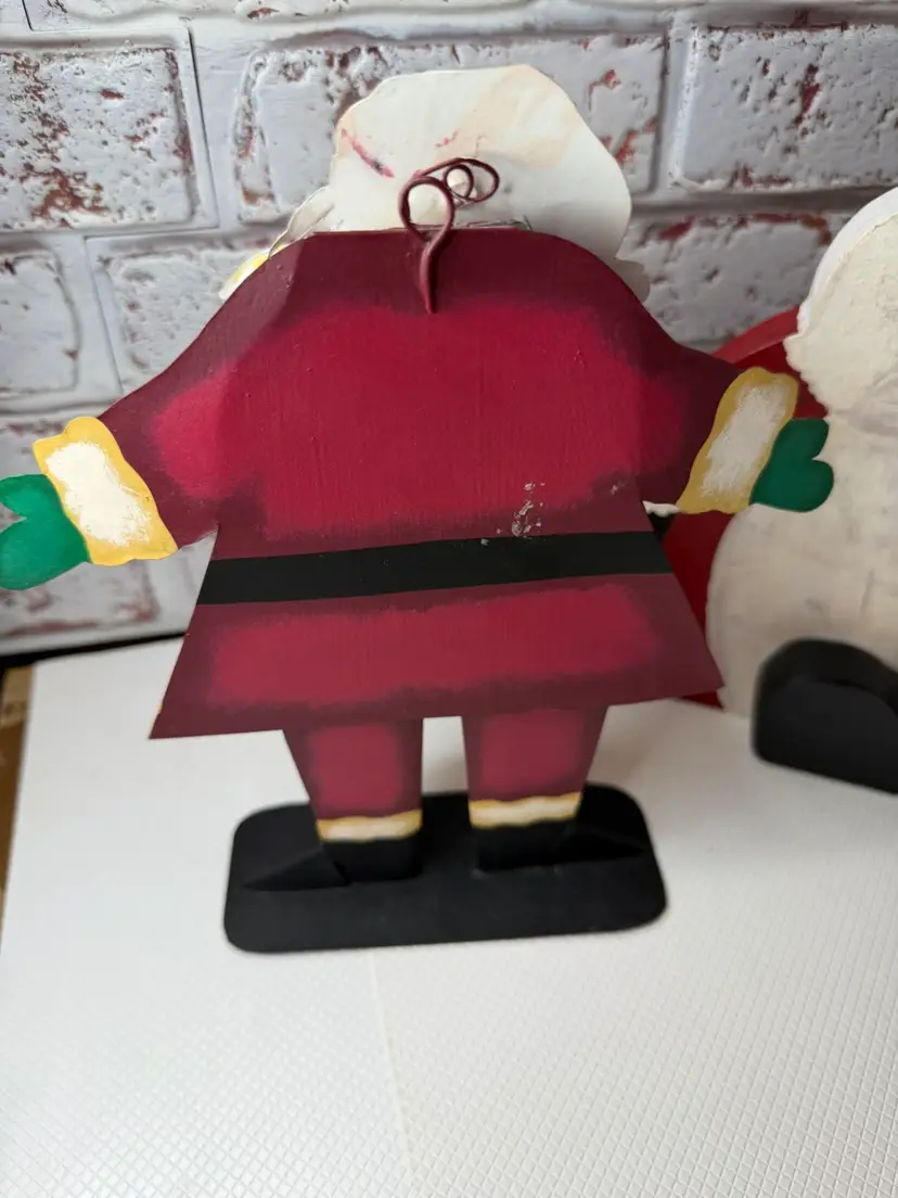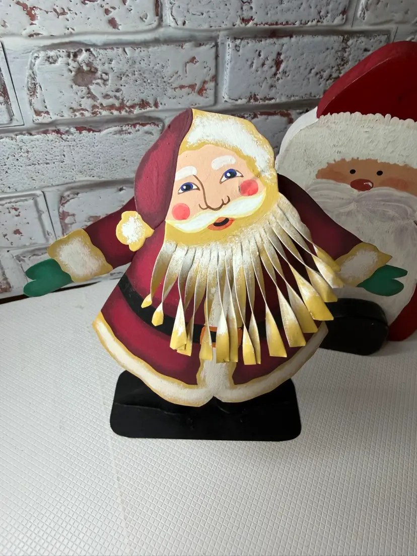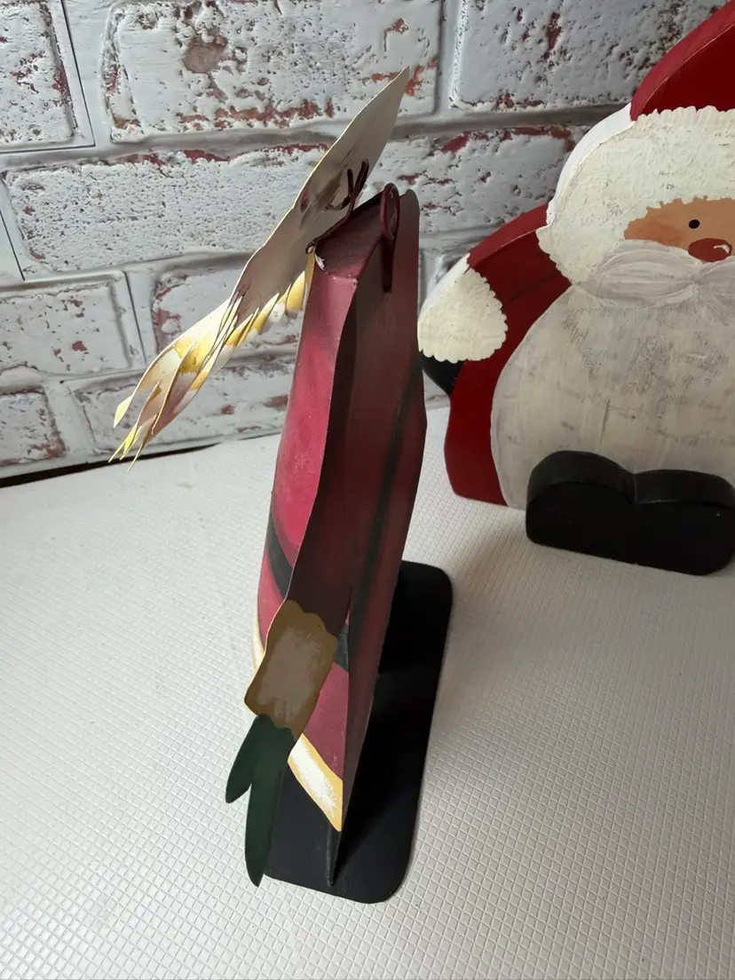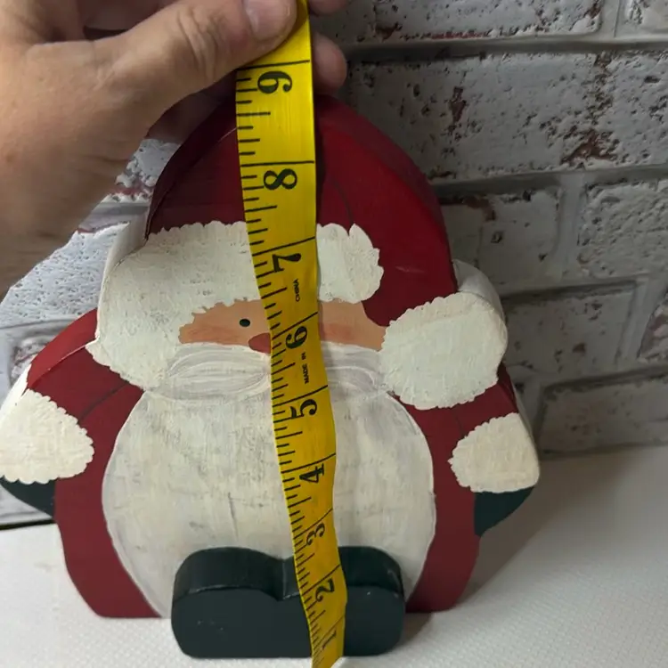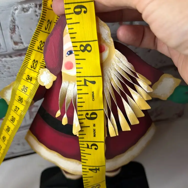 Measures almost 9” tall there is white marks on the wooden Santa and scratch. The metal had dent and a mark on face and something on the back