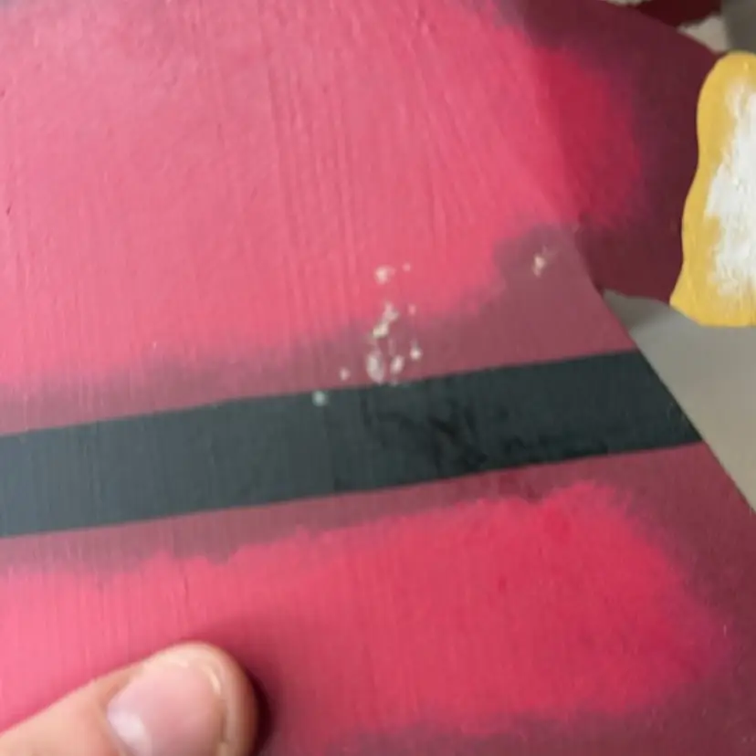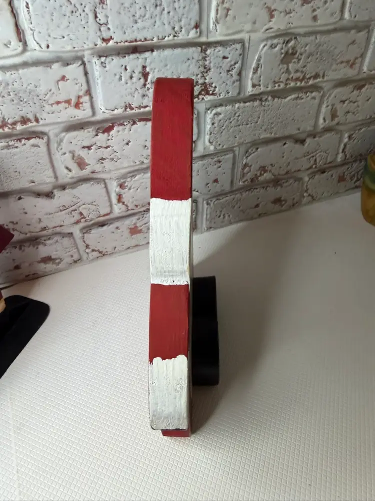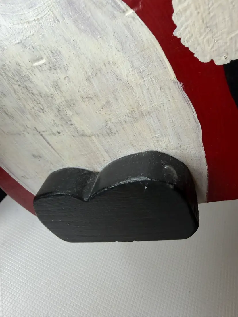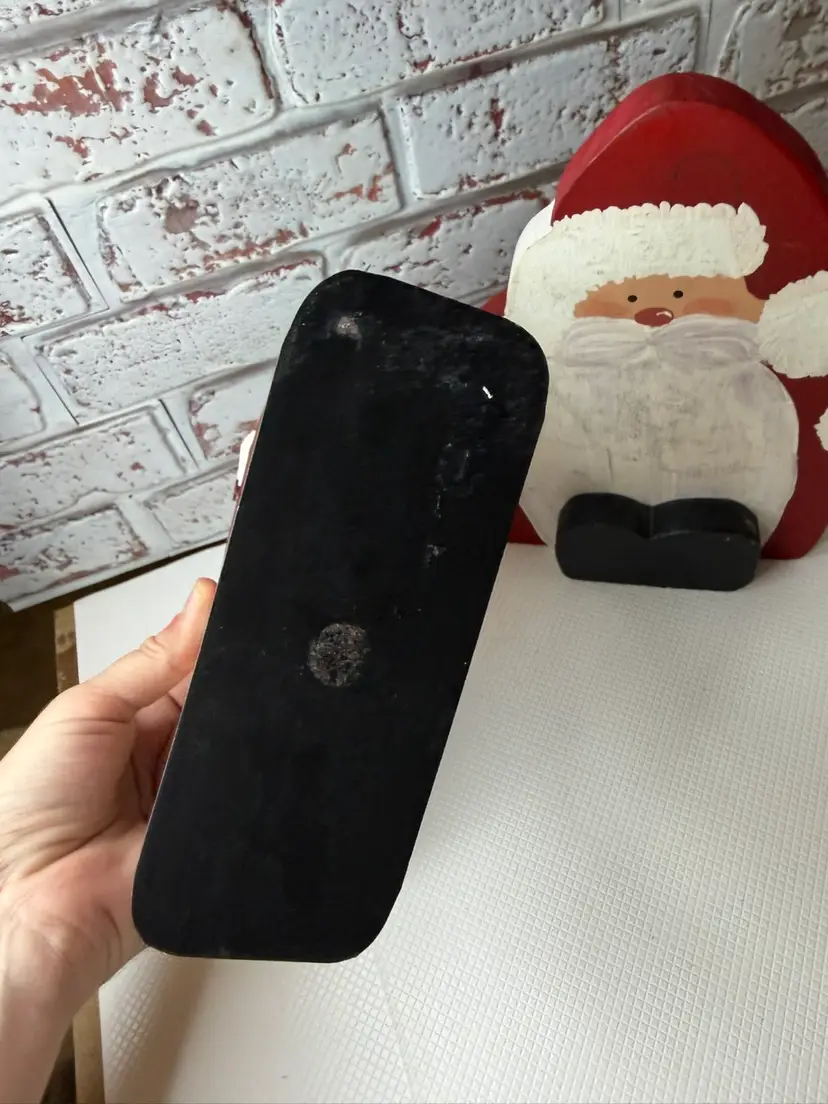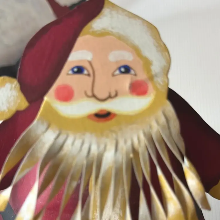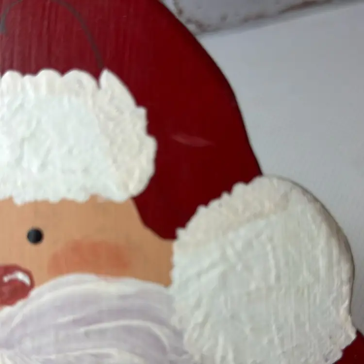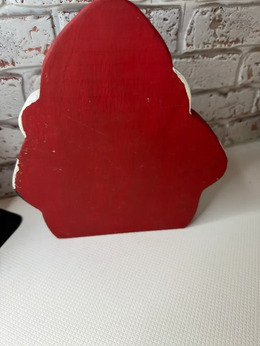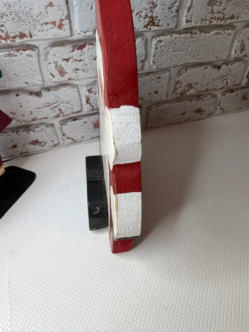 Measures almost 9” tall there is white marks on the wooden Santa and scratch. The metal had dent and a mark on face and something on the back