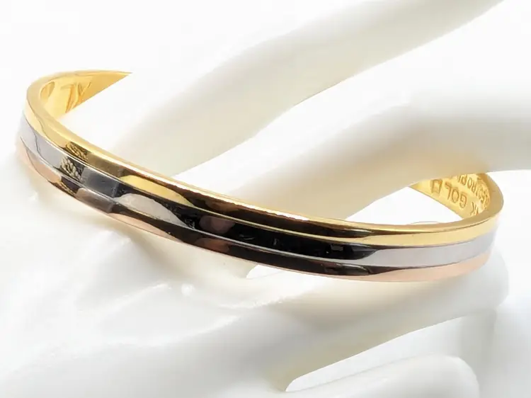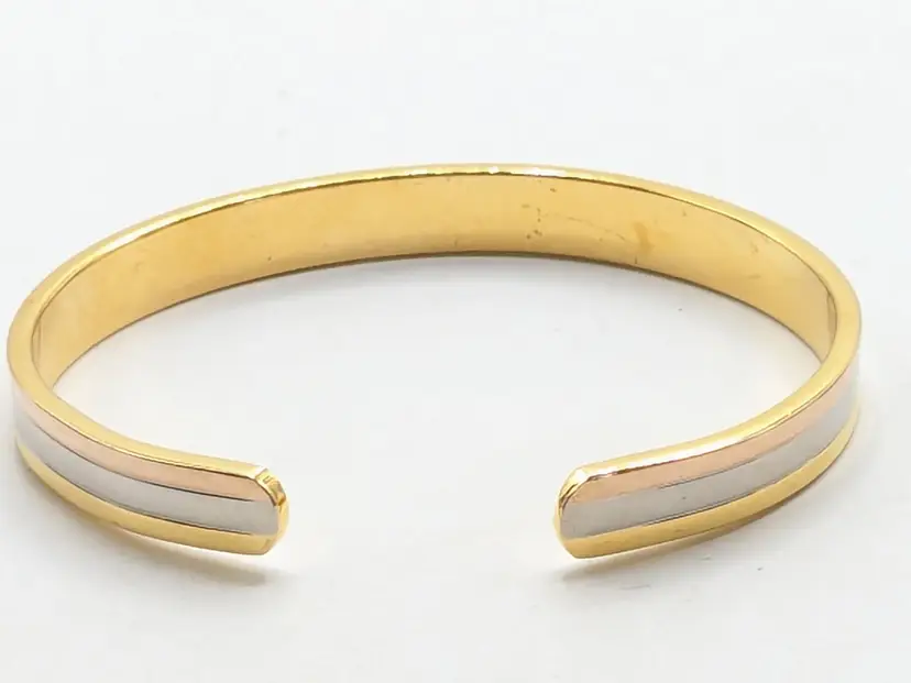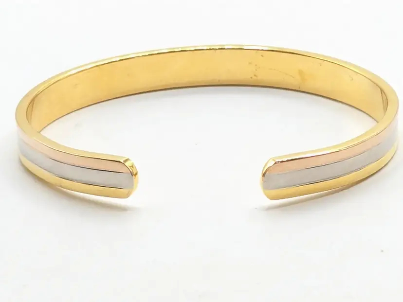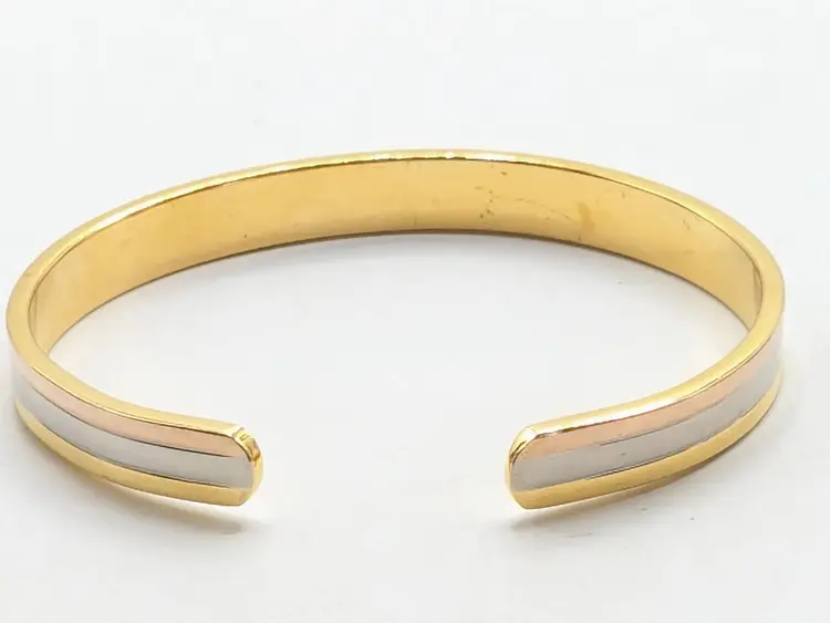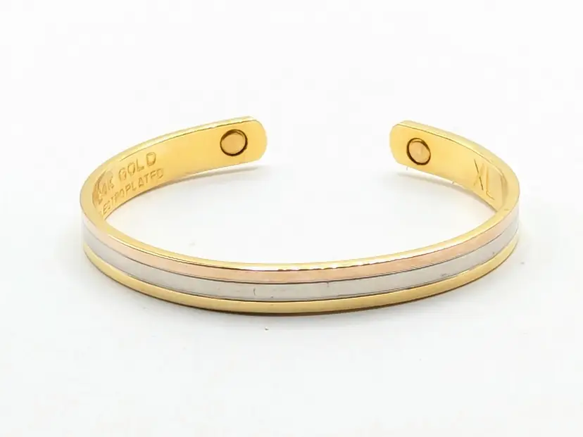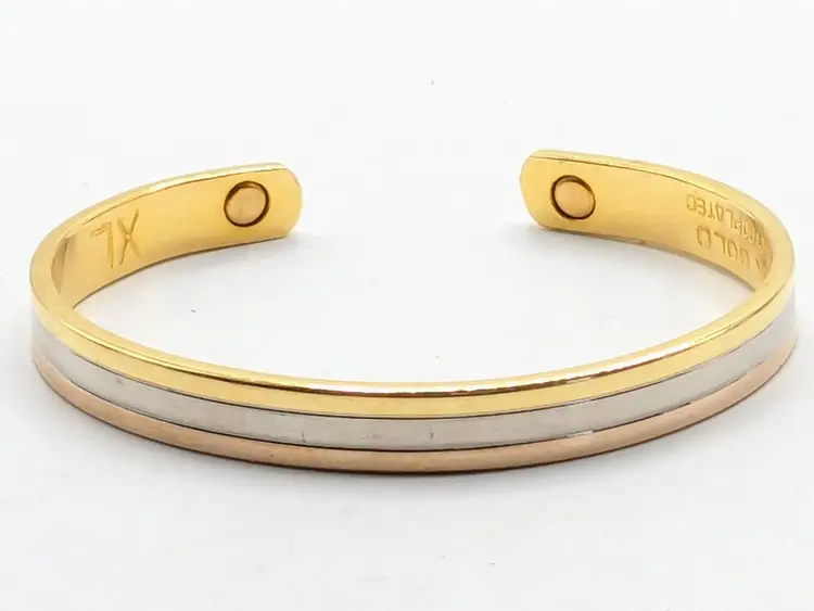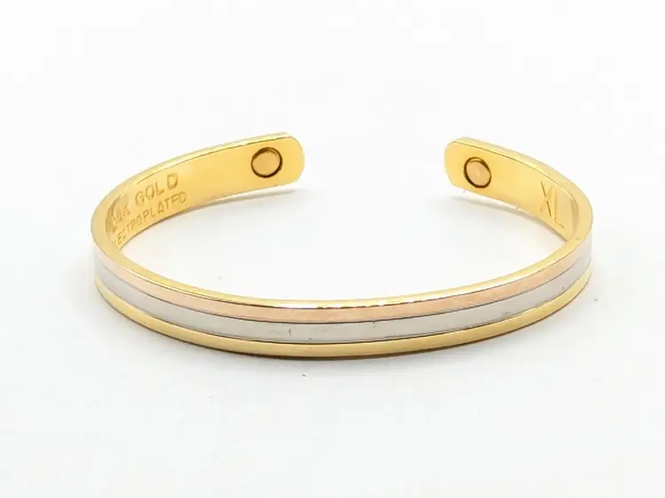 Good condition. This stylish cuff bracelet features a two-tone design with gold and silver bands. Marked 24K Gold Electroplated and XL. Measures 7 1/4". (EN1)