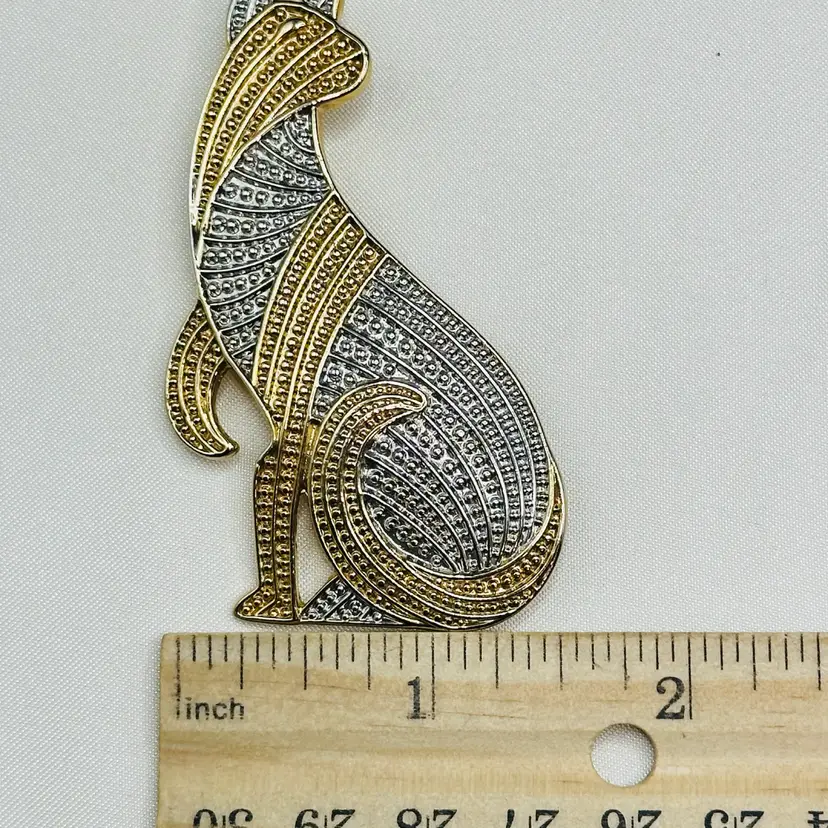 Stunning silver-tone and gold-tone textured cat brooch. Approximately 3 inches by 1.5 inches.