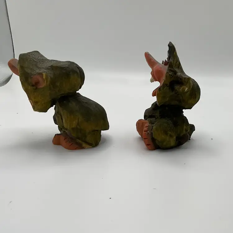 Two vintage folk art trolls by the renowned artist Henning. These whimsical pieces are crafted from high-quality wood and are perfect for collectors of elves, gnomes, and pixies. Each piece is unique and showcases intricate details that make them truly one-of-a-kind.