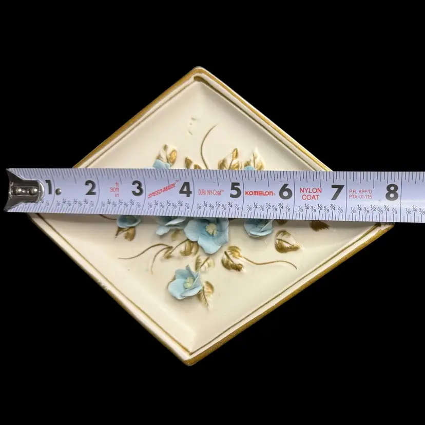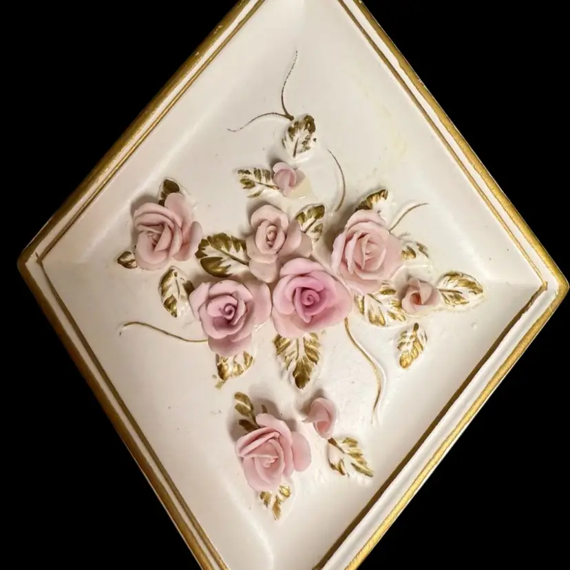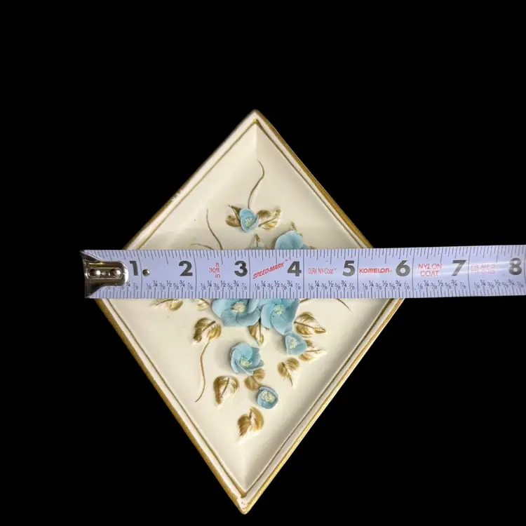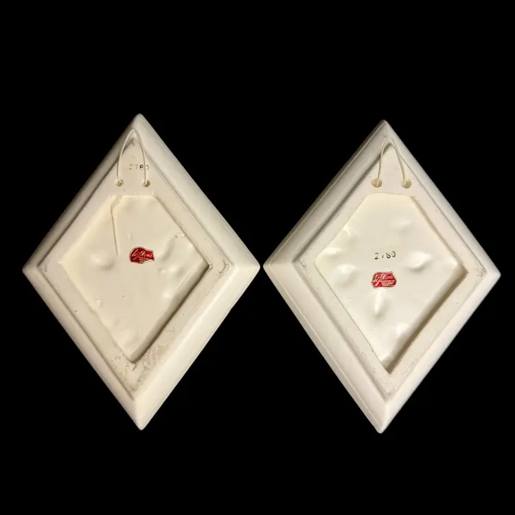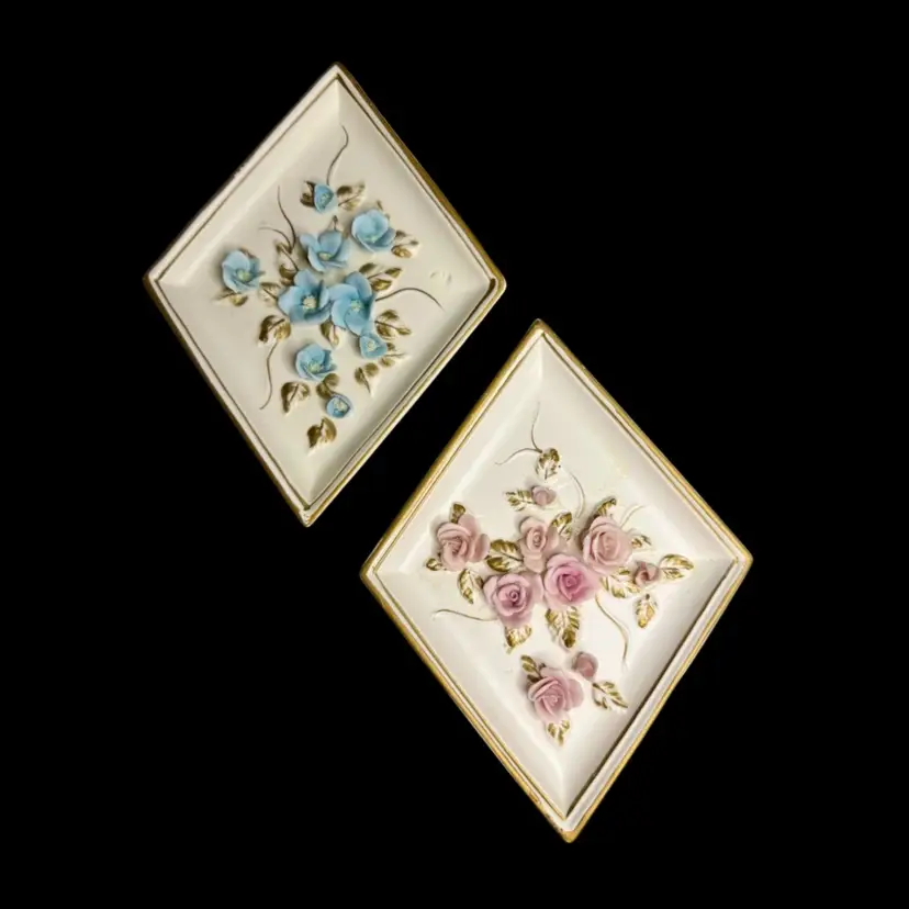 This product is a set of two vintage Lefton ceramic diamond flower wall hangings from the 1950s. These wall hangings feature a 3D effect with a matte finish and hand-painted details, making them a unique and eye-catching addition to any room.
