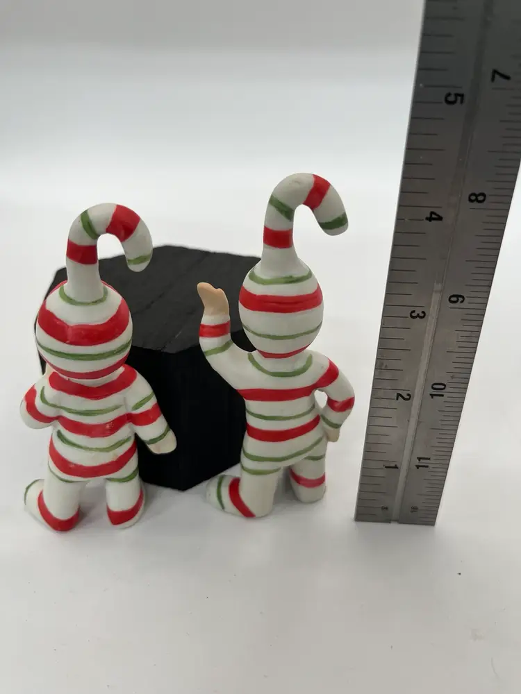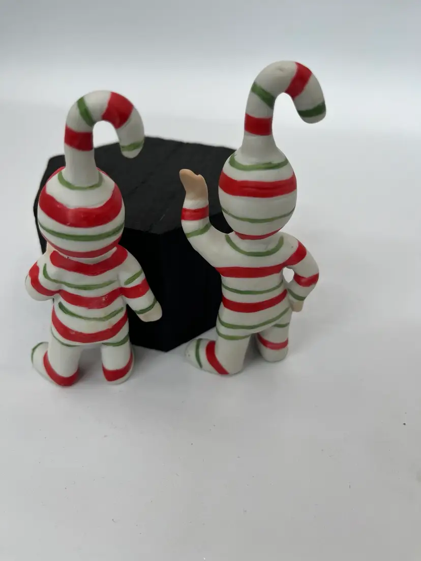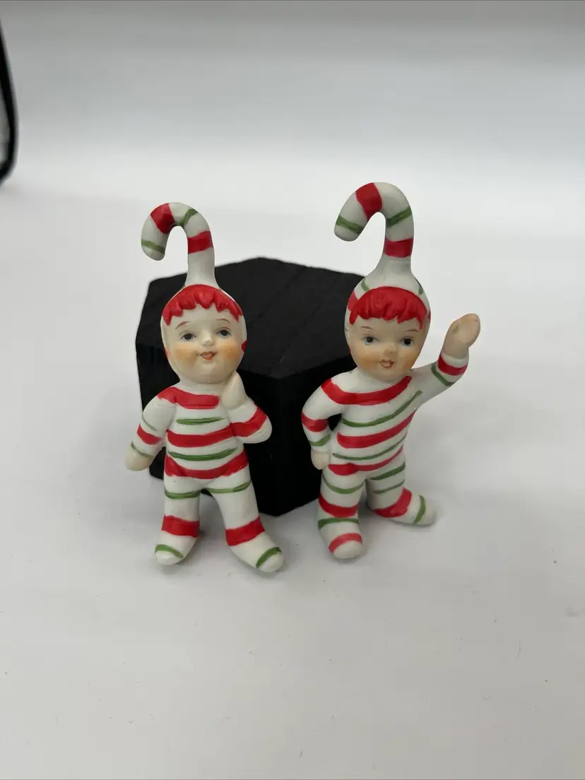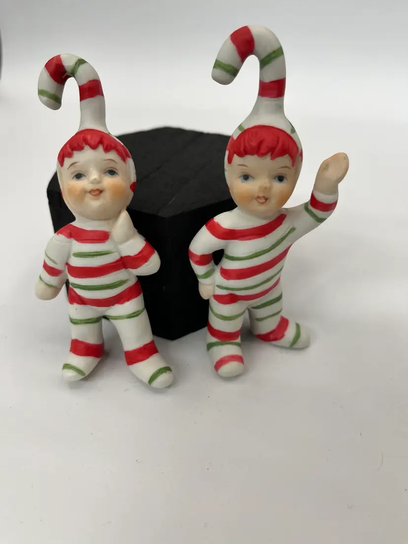 These are fun and festive vintage pixie candycane porcelain figurines in great condition no chips or cracks
