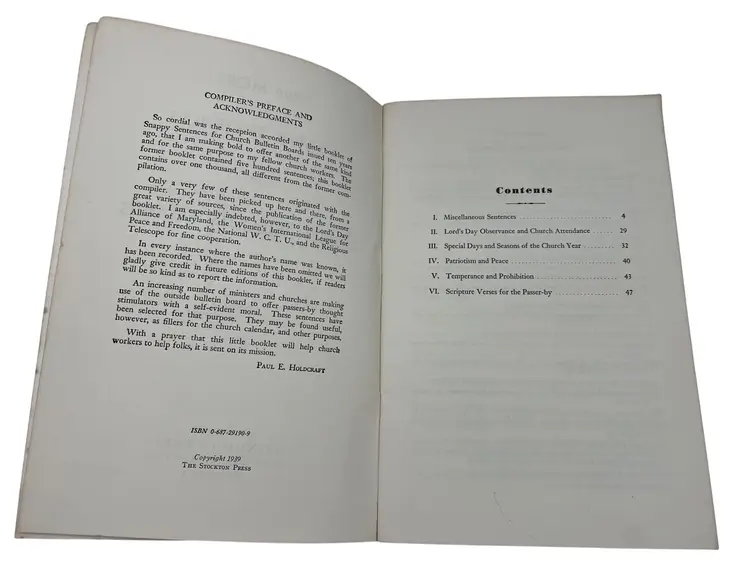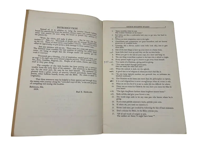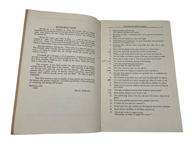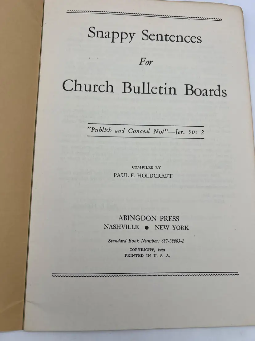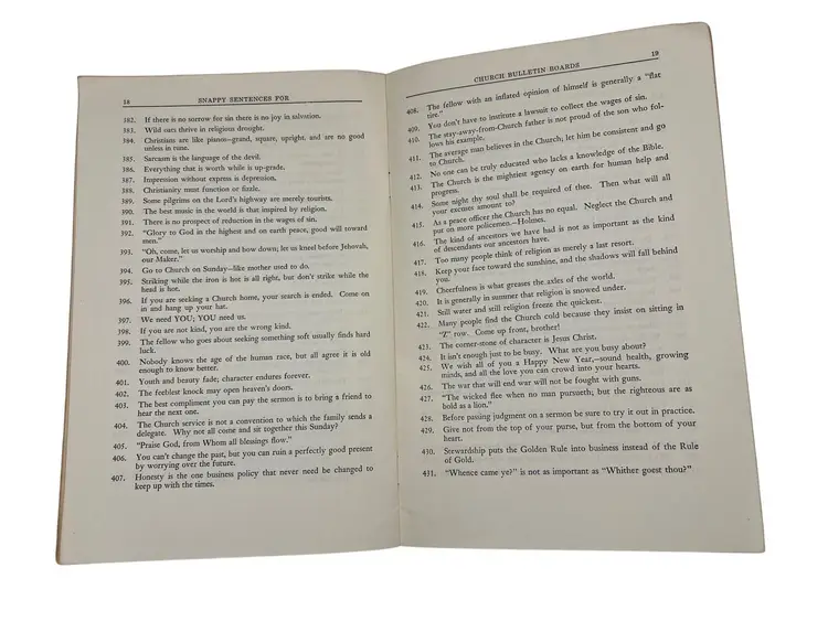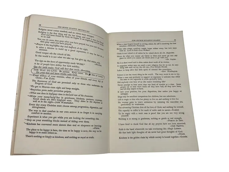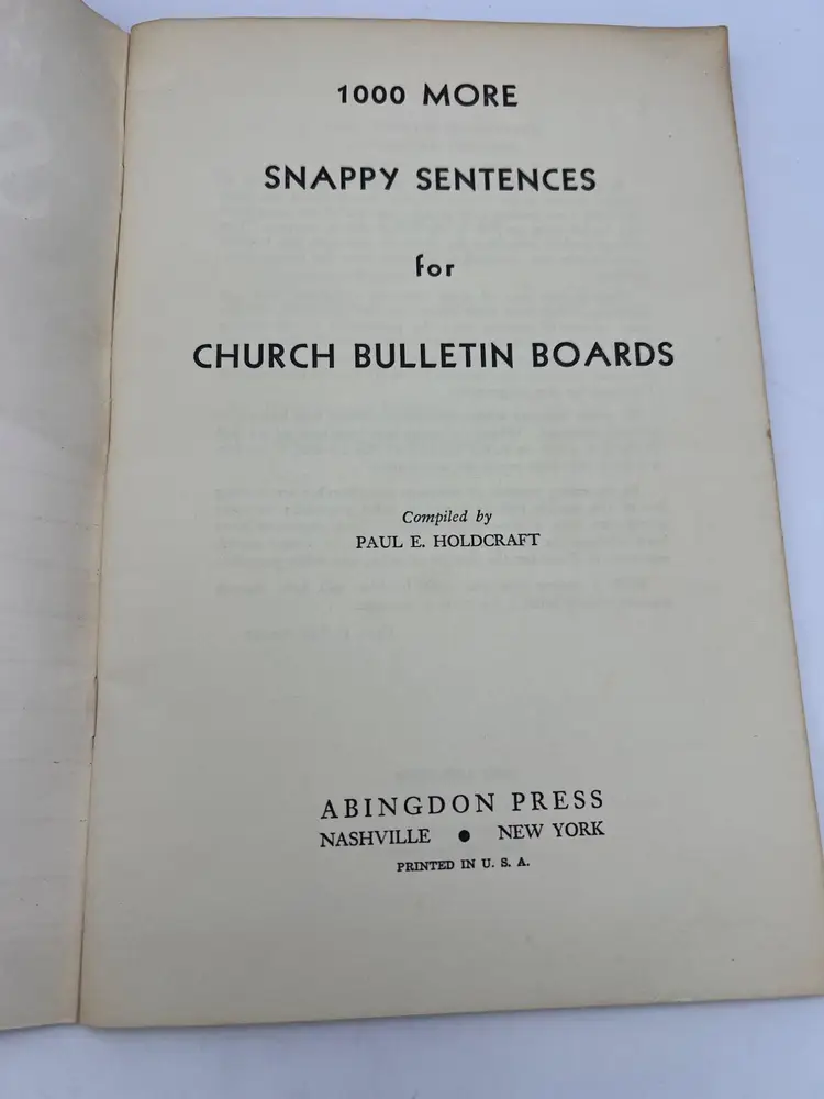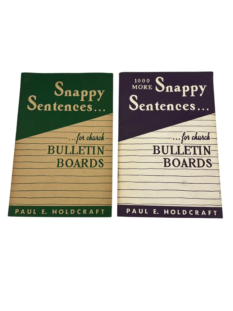 "Snappy Sentences for Church Bulletin Boards" and "1000 More Snappy Sentences for Church Bulletin Boards" are a collection of creative and engaging sayings for church bulletin boards, offering inspirational and witty phrases to enrich church communications. The original copyright on these paperback books were 1929 and 1939 but these appear to be later printings from the late 1960s or 1970s since they both list ISBN numbers. Each book measures 9" x 6".