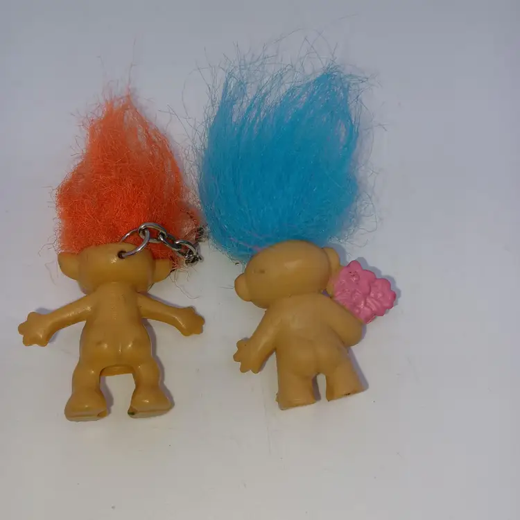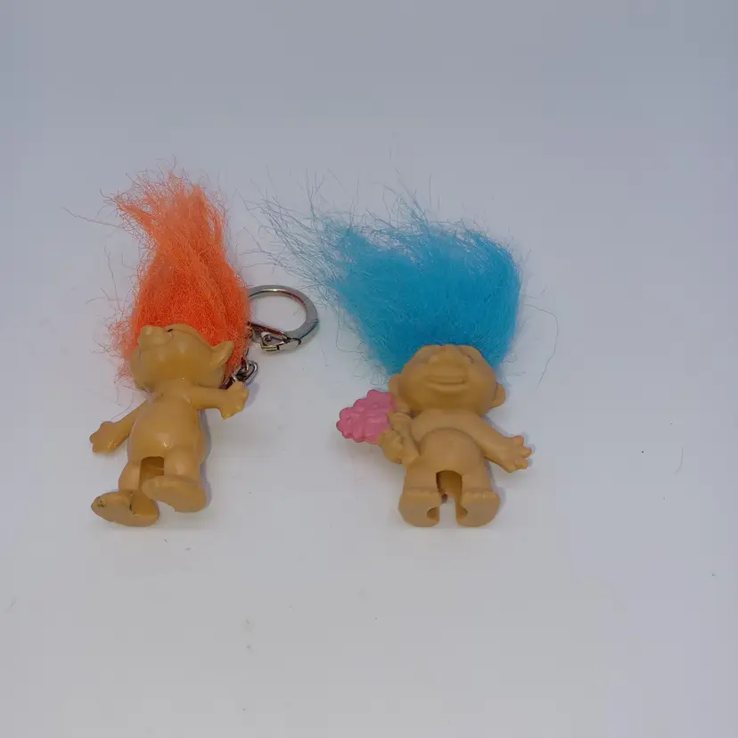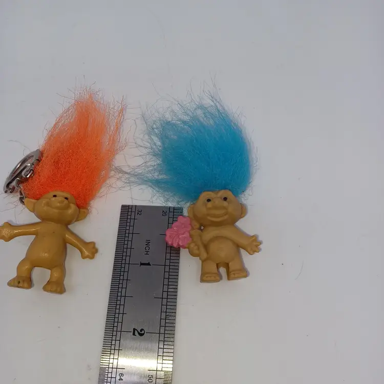 Two vintage troll pencil Toppers a pixie troll with orange hair he also has a keychain marked Acme 1991 and a blue haired troll holding a bunch of flowers both in good vintage condition please see all pictures as they're the best description measures approximately 1 in body 3 in with hair all items from a smoke-free home with pets