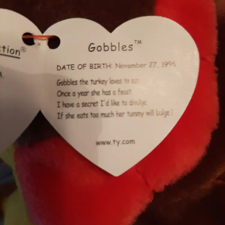 – Brand: Ty – Year: 1996 – Custom Bundle: No – Featured Refinements: Gobbles Turkey Beanie Baby – Age Level: 3-4 Years, 4-7, 8-11 Years, 12-16 Years, 17 Years & Up – Country/Region of Manufacture: China – Character Family: Beanie Baby Bear