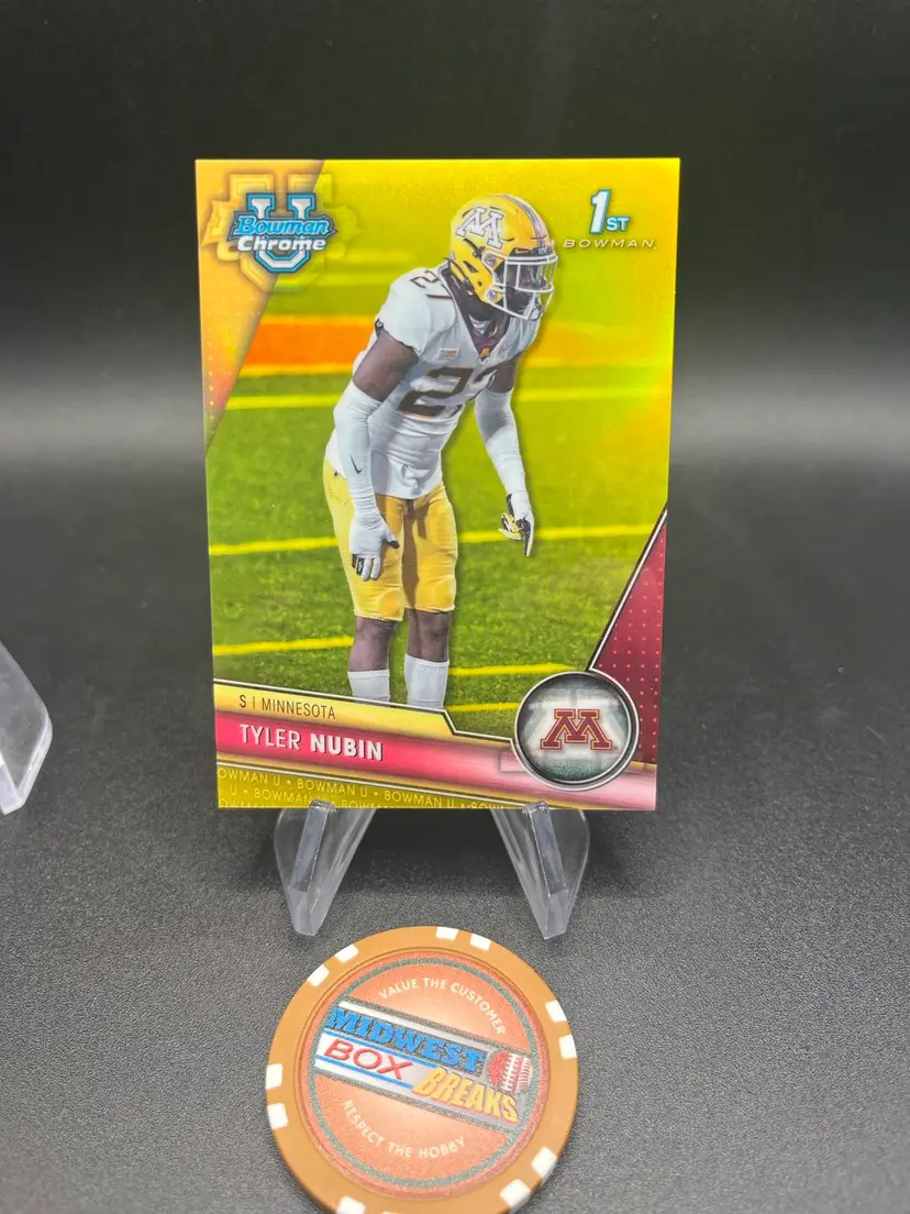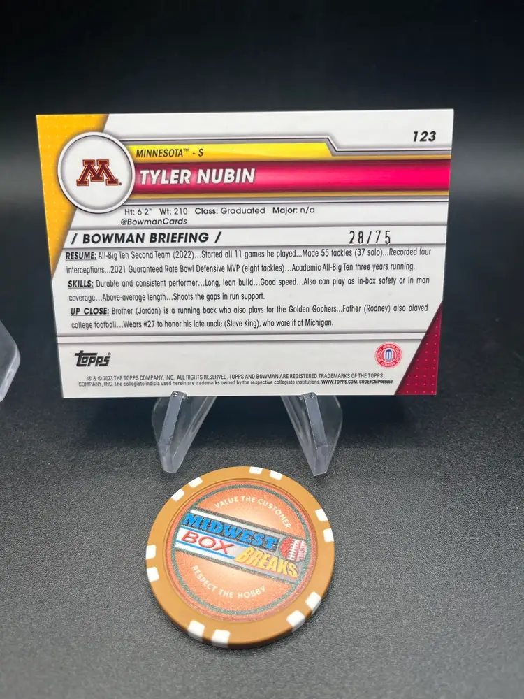 Tyler Nubin #28/75. From Bowman University 2023. Yellow parallel.