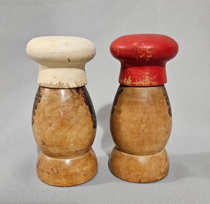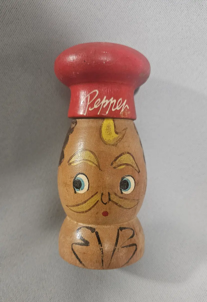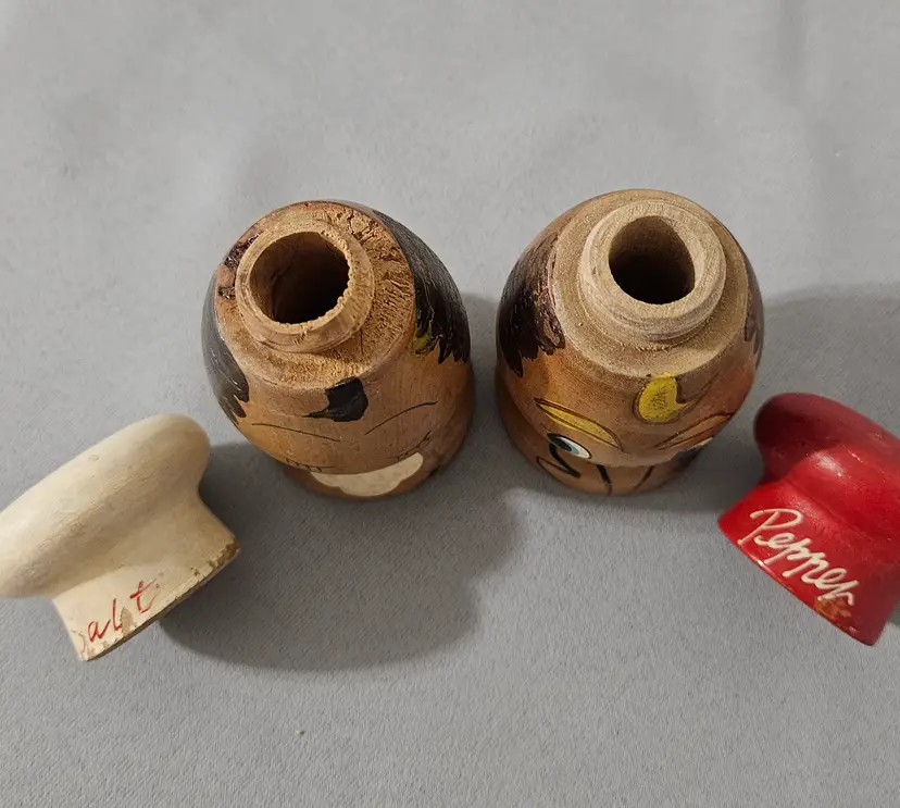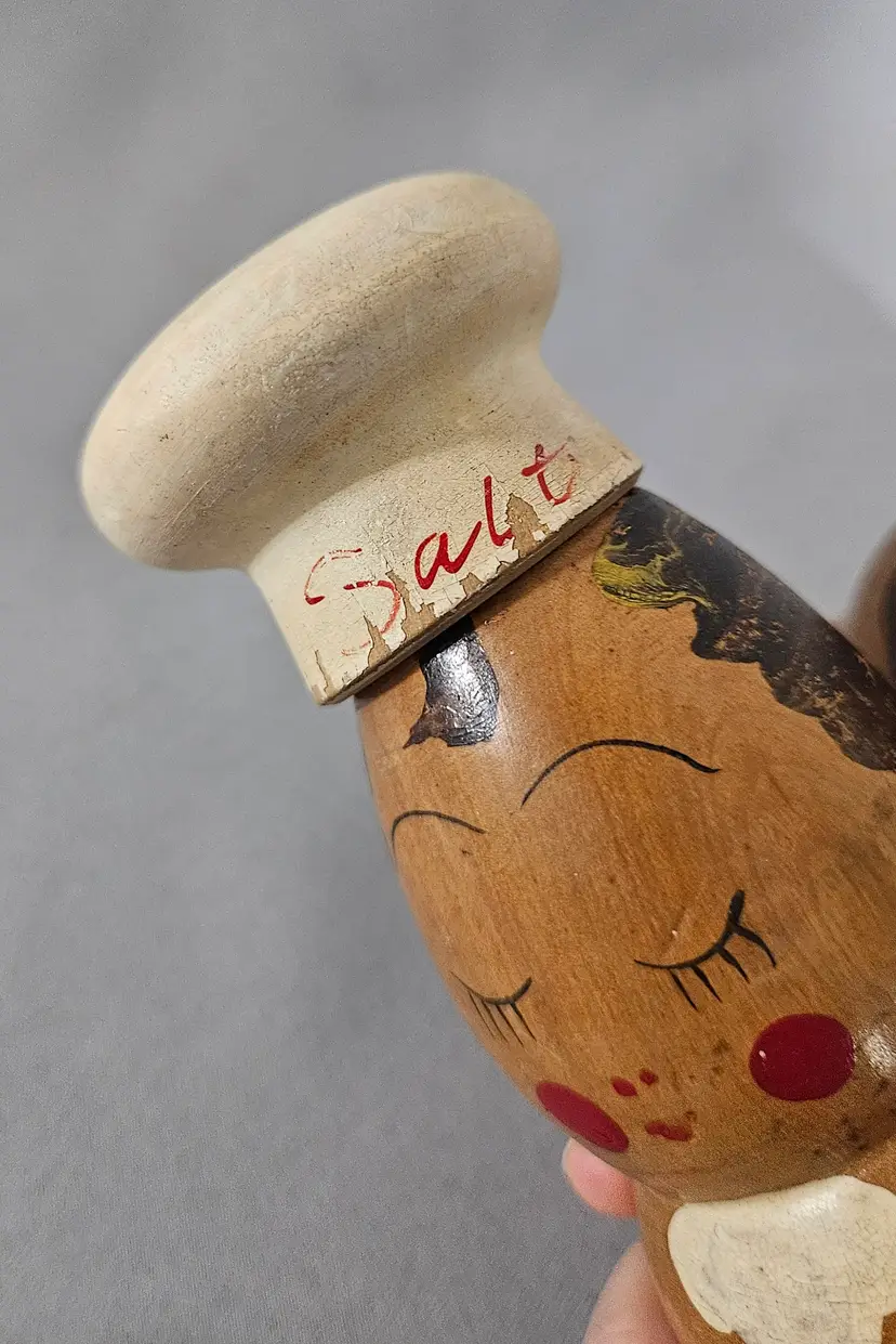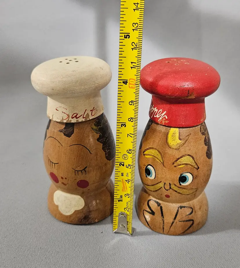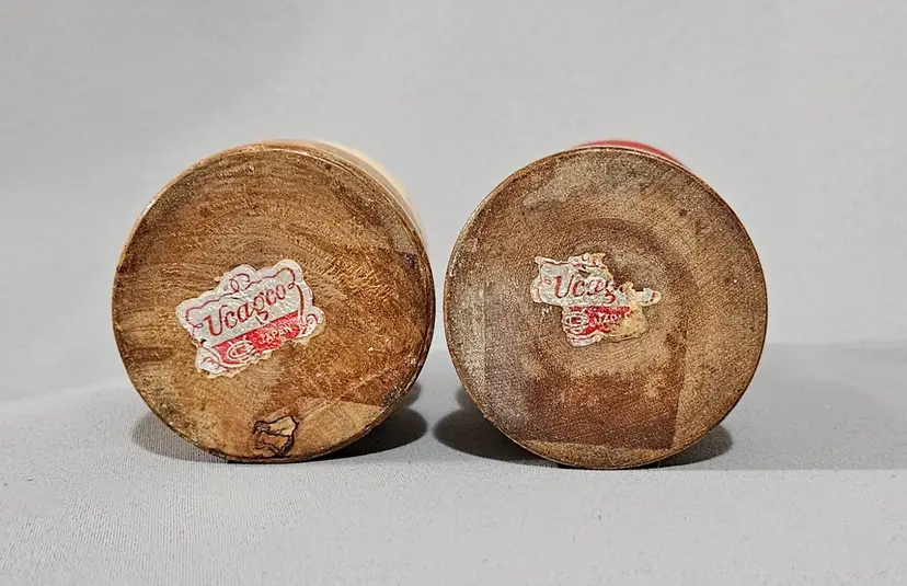This set is in Good, Pre-owned condition, showing some wear from age and previous use. There are areas where the paint has come off (shown in photos). They are approximately 4 1/4" tall. Though worn, the makers foil stickers remain intact on the bottom sides. They are Ucagco, made in Japan. See all photos of description