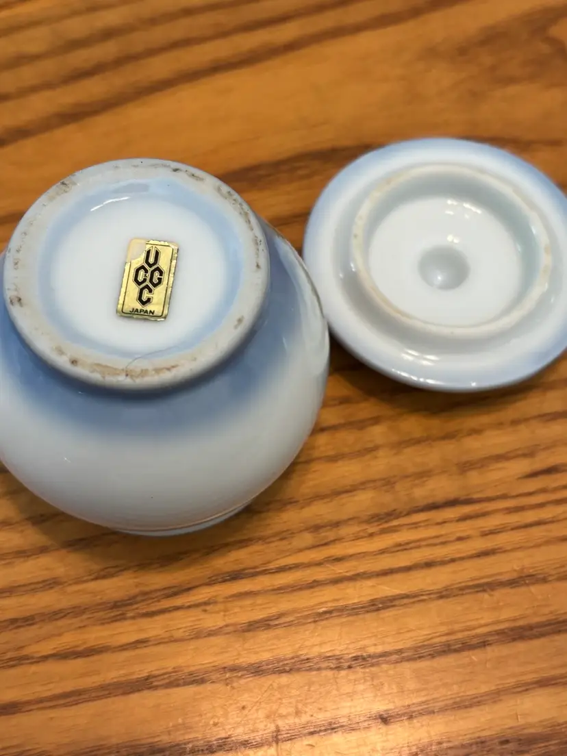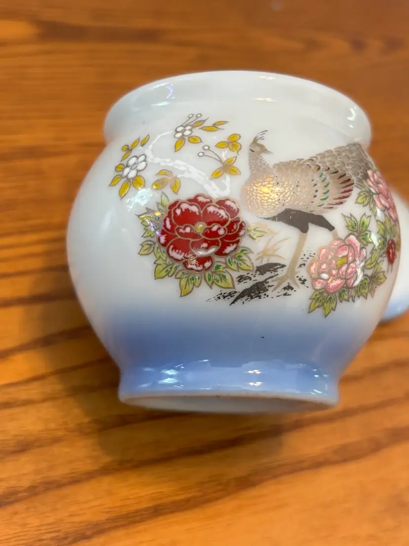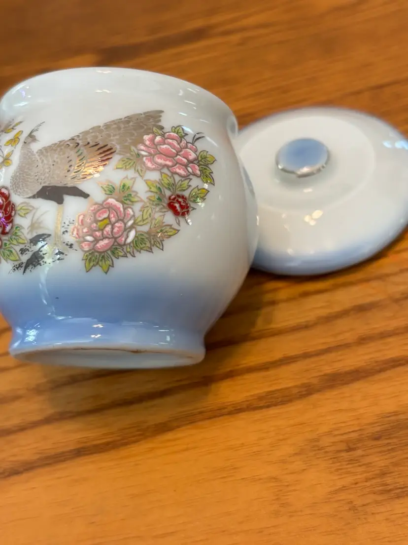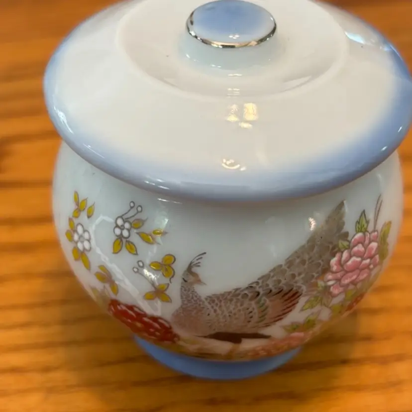 UCGC small trinket box, peacock and florals. Gold outlined. Excellent condition, no chips or cracks. 2 1/4 inches tall, 2 wide.