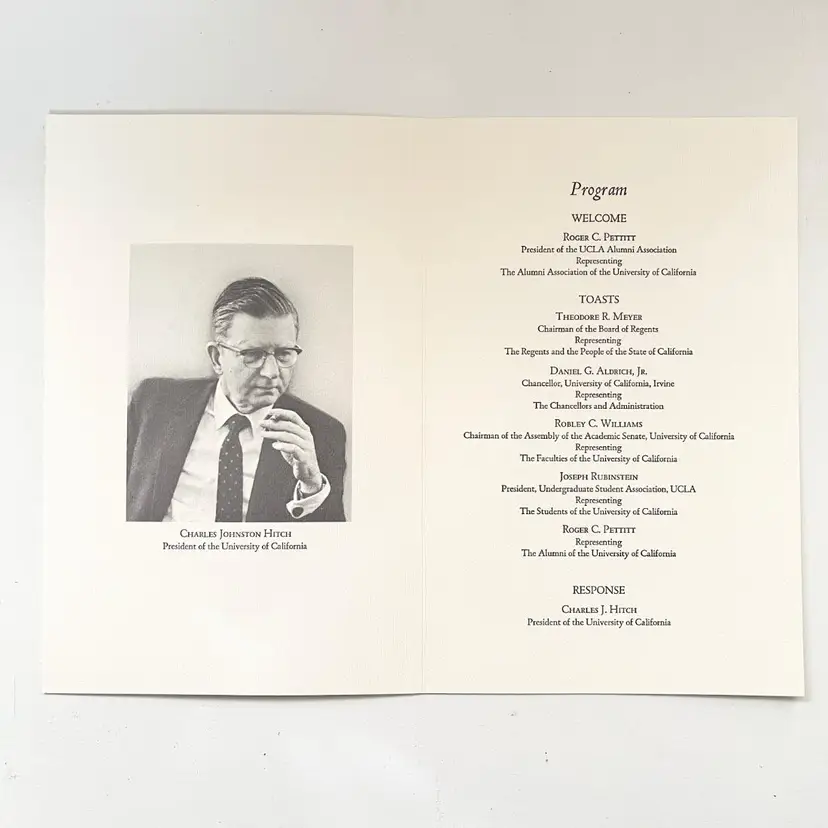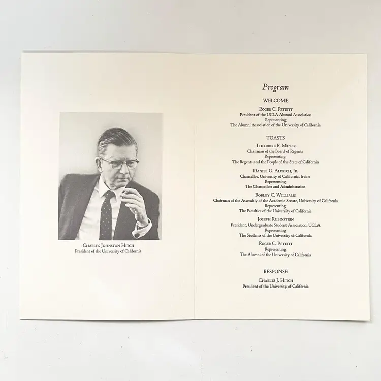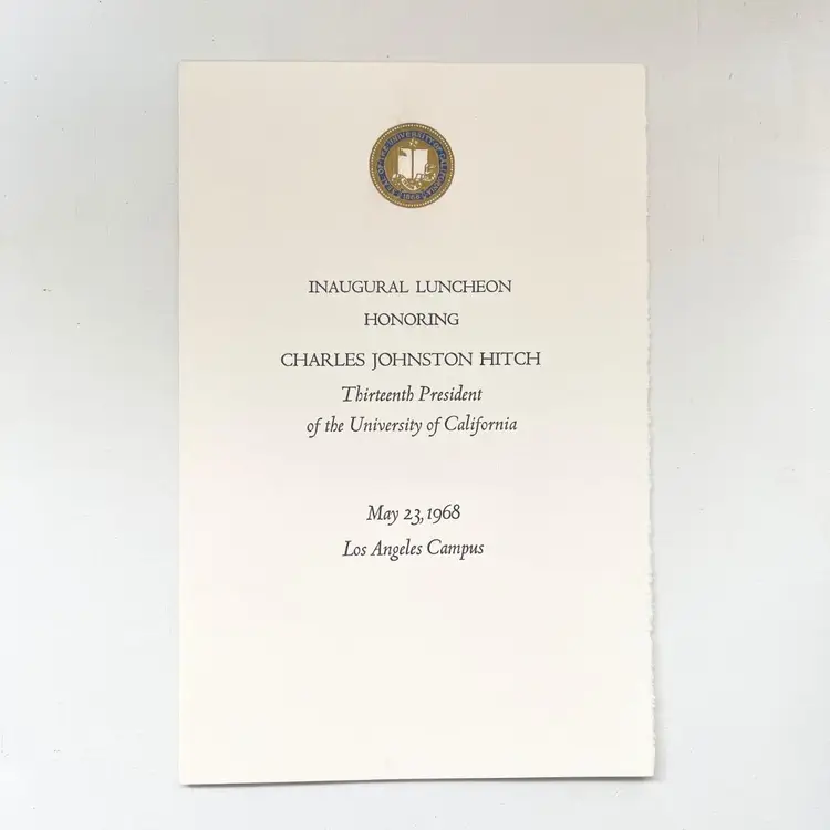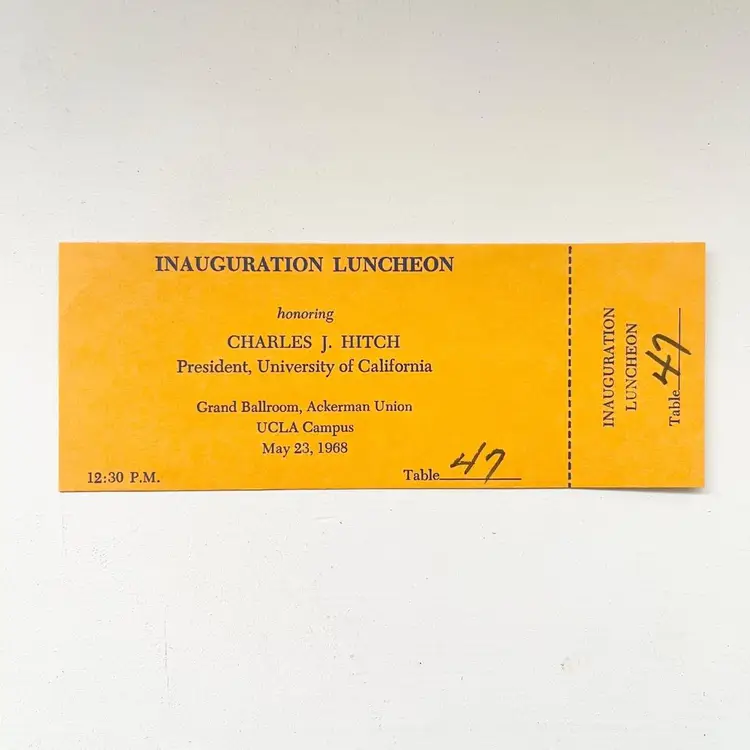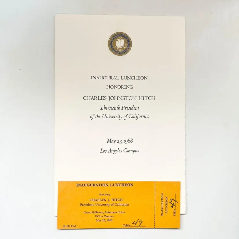 University of California Los Angeles Charles Johnston Hitch President Inaugural Program & Ticket Vintage 1960s UCLA Campus 1968 1 Admission Ticket 5 inches x 2 inches 1 Program 8-1/2 inches x 5-1/2 inches Condition: Good condition. Full Unused Ticket. Packaged in a plastic sleeve inside a rigid envelope Visit my store to see more vintage ephemera, advertising, novelties, gifts, estate sale and yard sale finds https://district.net/u/finderspickerspaper SKU B29