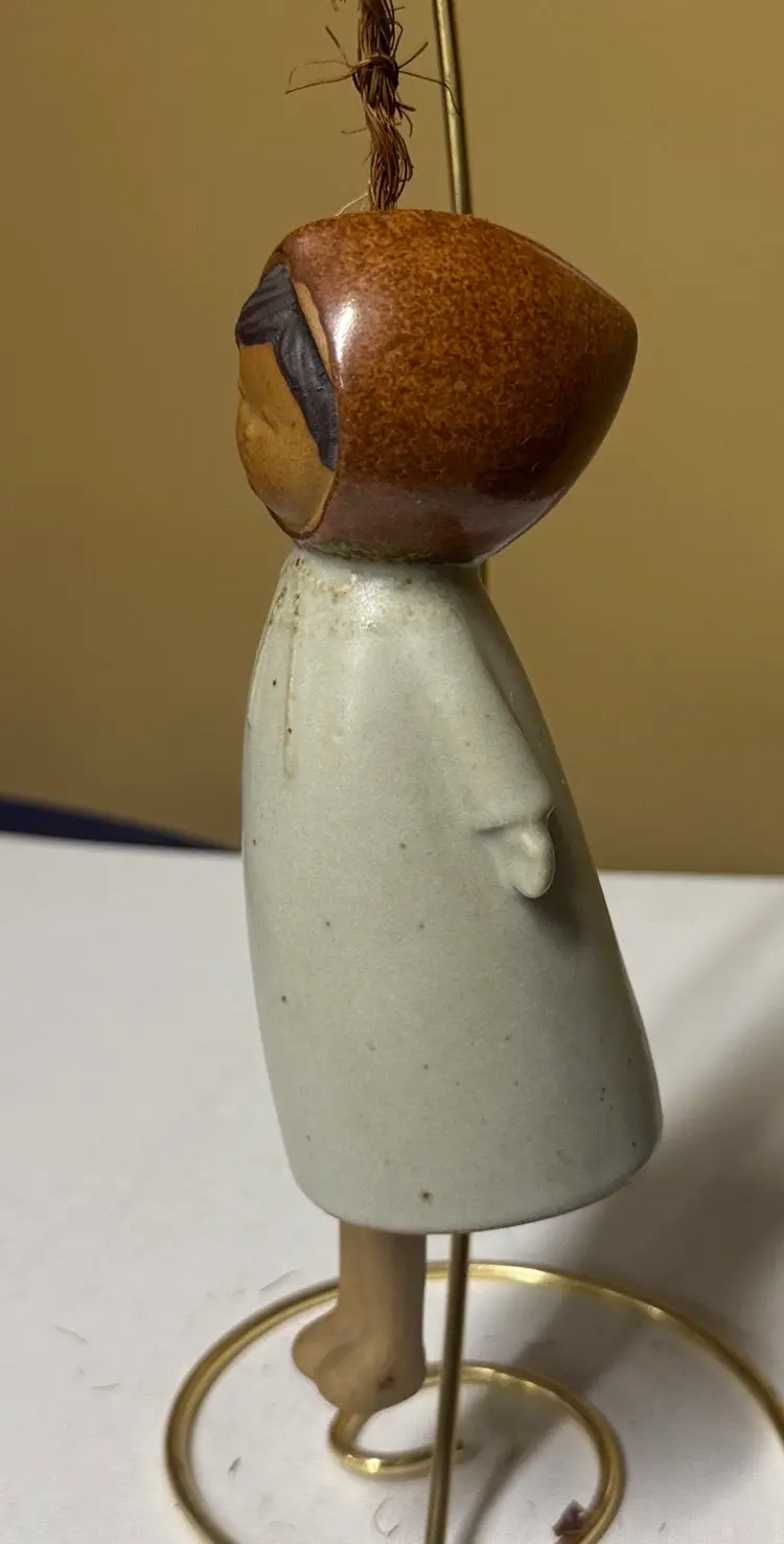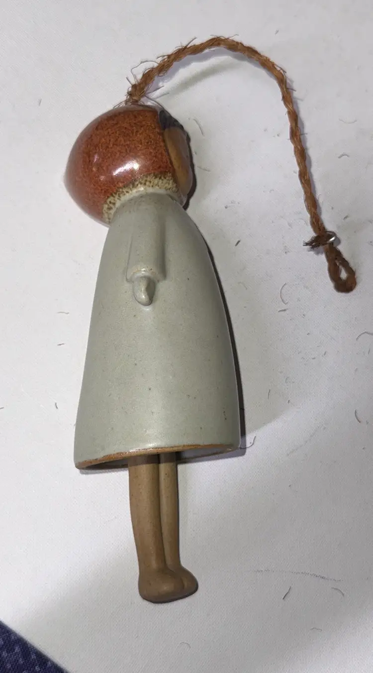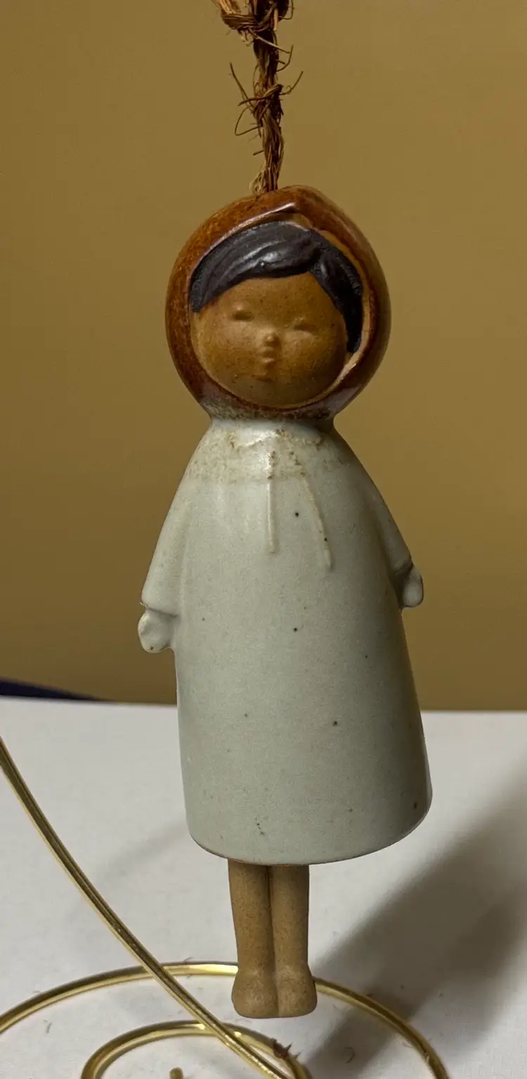 Charming ceramic doll ornament with a brown hood and white dress. Perfect for decoration. UCTCI Hanging Doll Stoneware Art Pottery Scandinavian Girl Doll Bell wind chime Jute hanger 8” tall with legs Excellent condition with no breaks or chips (11431021252)