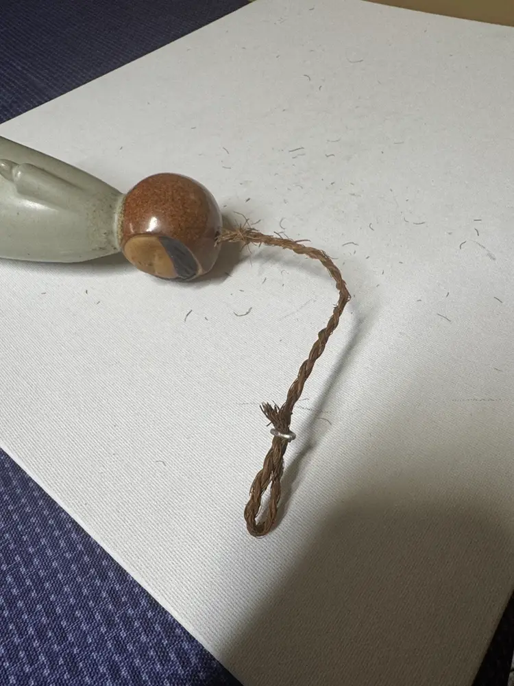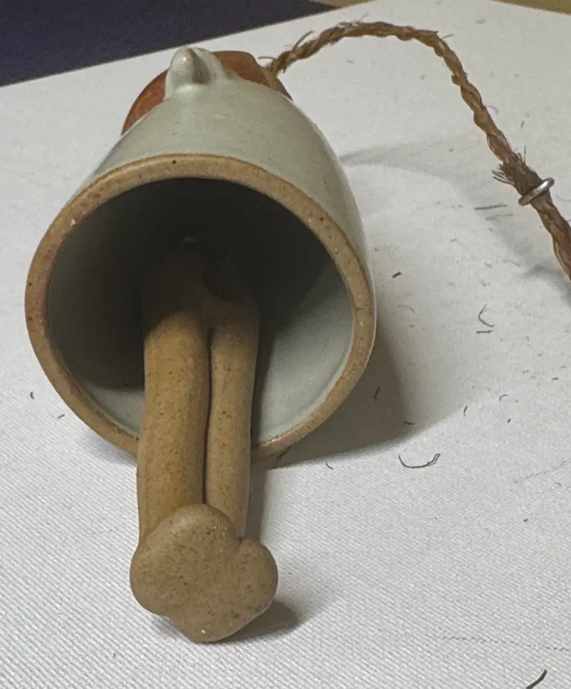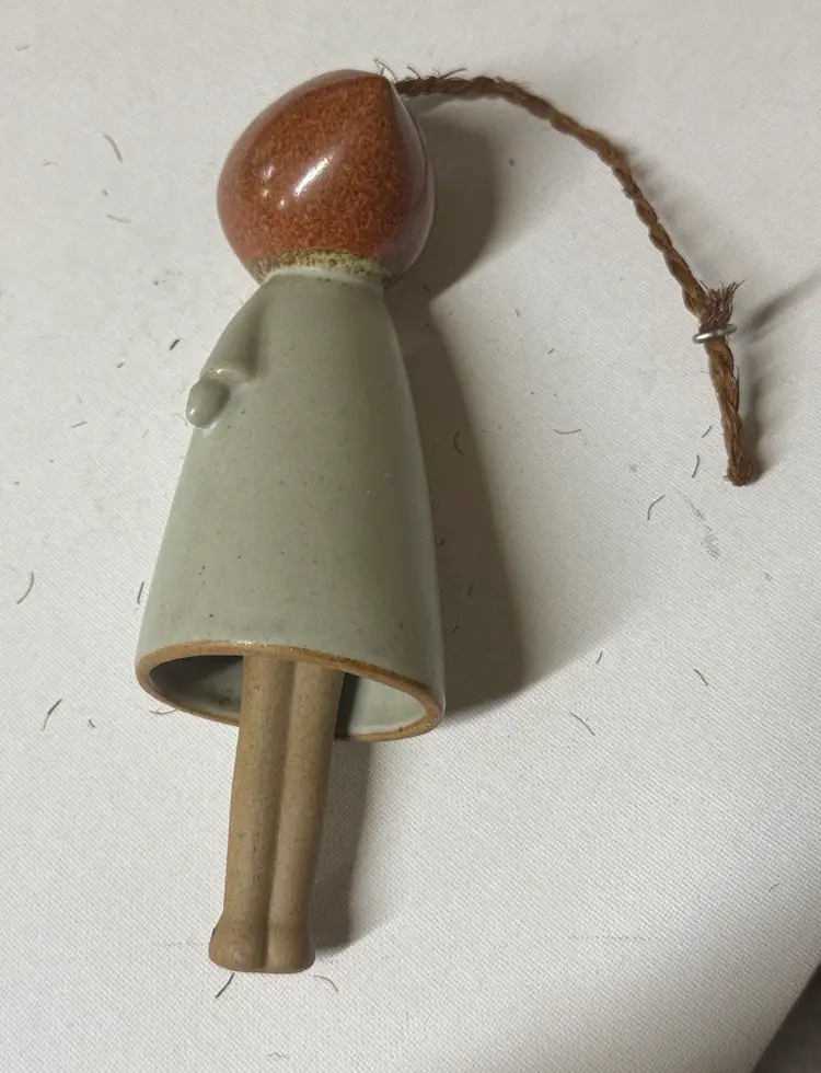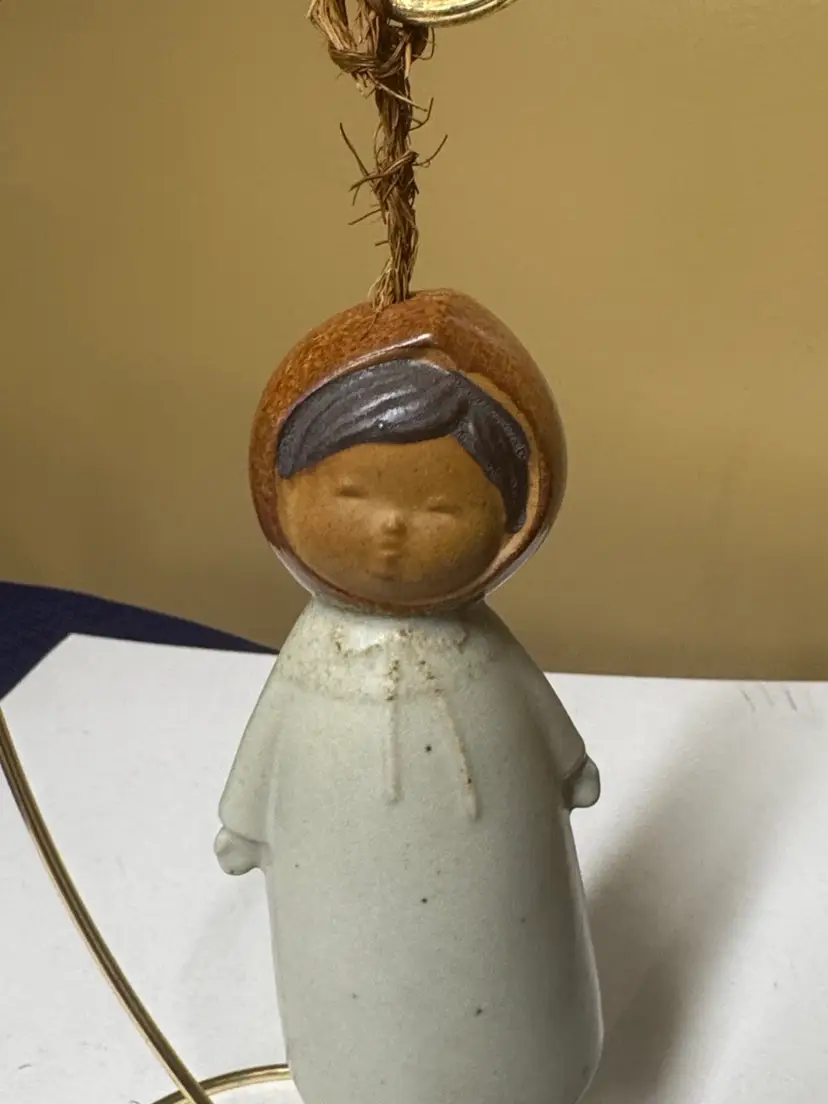Charming ceramic doll ornament with a brown hood and white dress. Perfect for decoration. UCTCI Hanging Doll Stoneware Art Pottery Scandinavian Girl Doll Bell wind chime Jute hanger 8” tall with legs Excellent condition with no breaks or chips (11431021252)