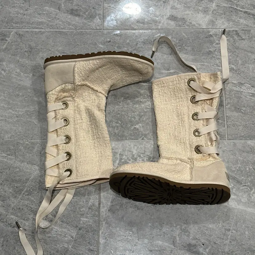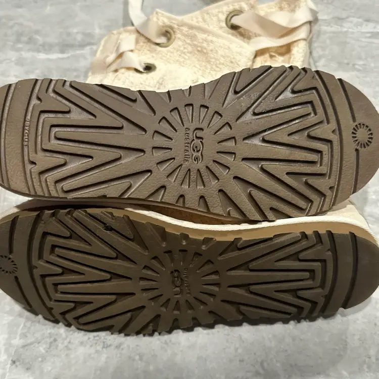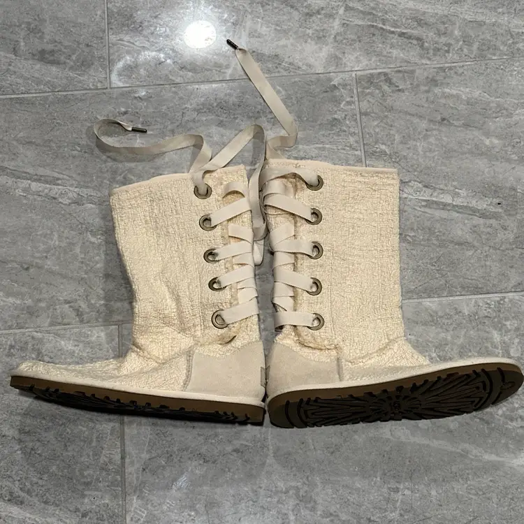 Elevate your style with these beautiful UGG Australia Heirloom boots. The mid-calf slip-on boots feature a round toe and flat heel, making them perfect for travel and casual occasions. The ivory synthetic upper material is accented with a cute bow and lace-up closure for a chic and comfortable fit.