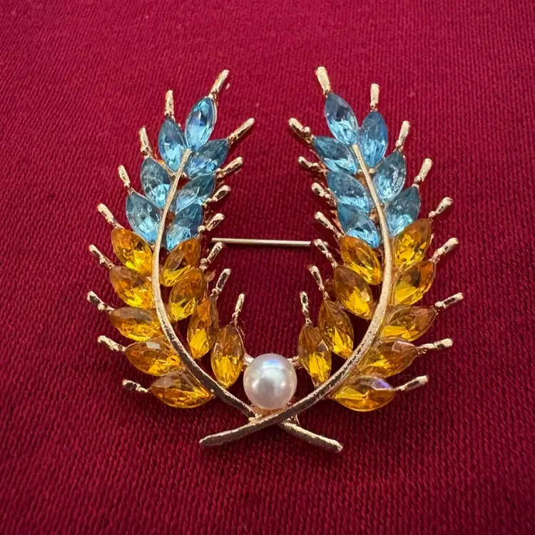 Ukrainian Wheat Sheaf Brooch Blue and yellow rhinestone with faux pearl C clasp Measures 1 3/4 inches tall by 1 1/2 inches wide