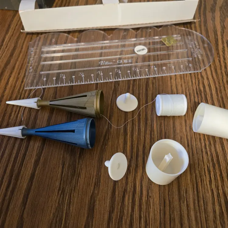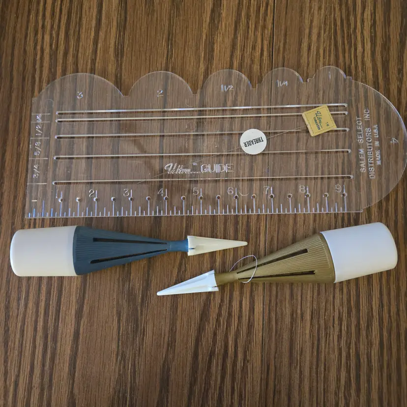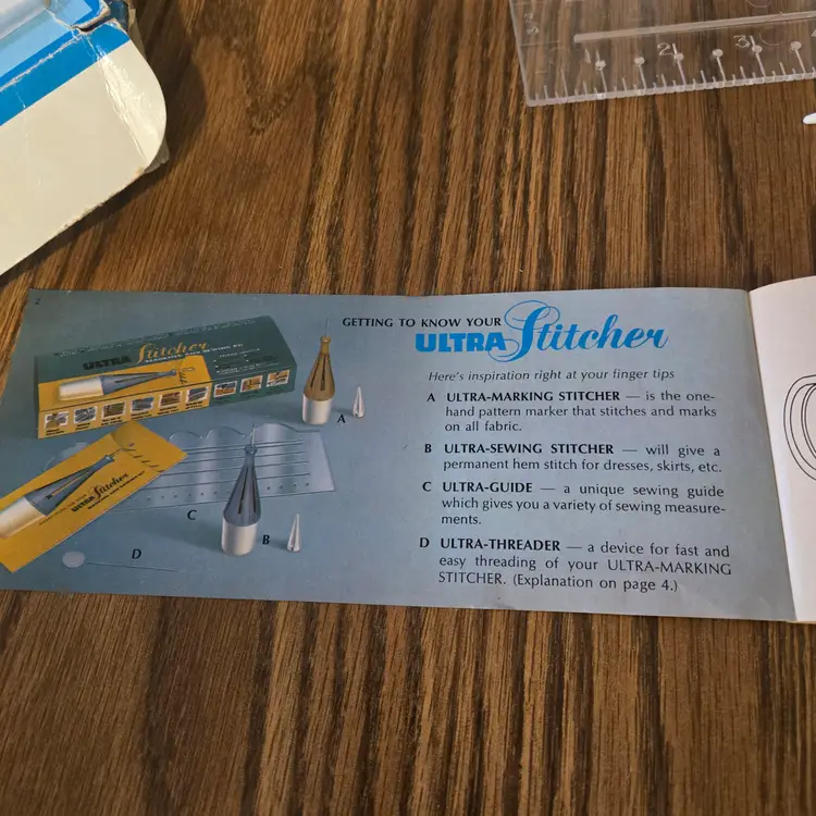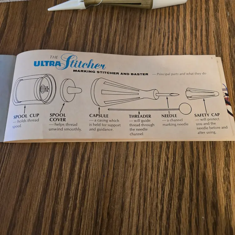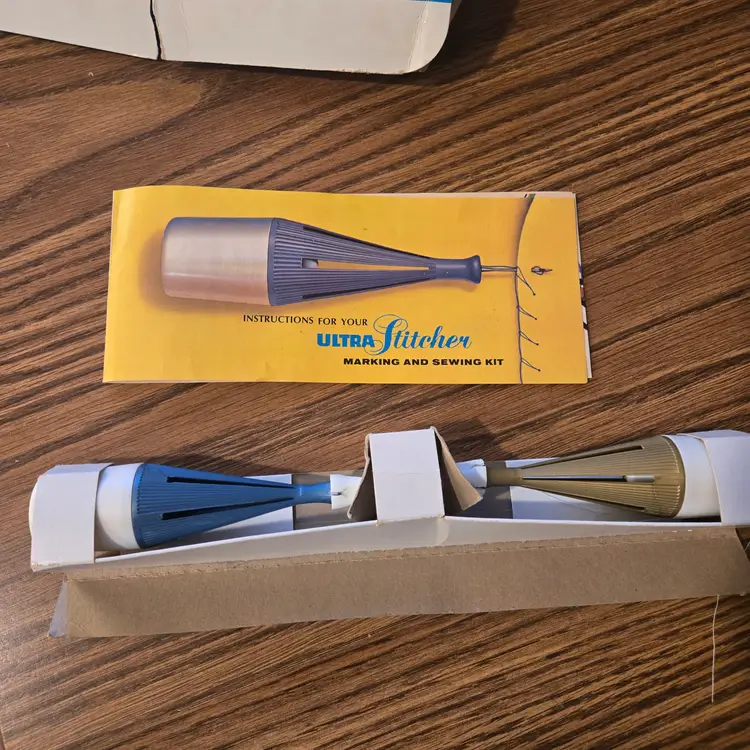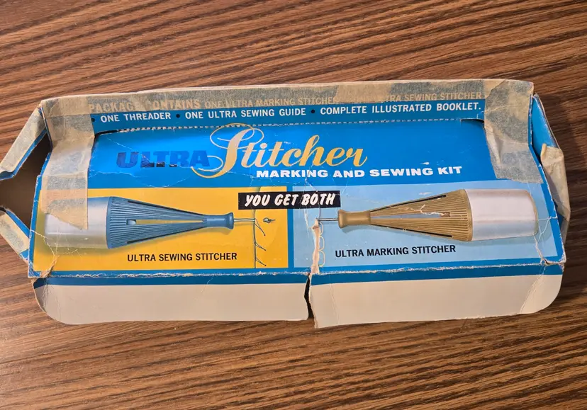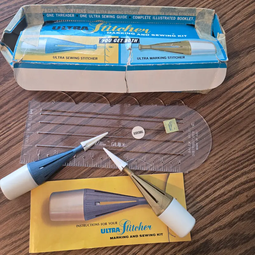 I have had this for many years. The box is a mess because it has been taped up for the several moves I've made since I owned it! The tools are barely used even though the box is messed up. I did obviously attempt to use it at least once because it is threaded for stitching, but I have no memory of using it. The spool of thread comes with it! (see pictures). The set is complete with the instructions, the ultra-sewing stitcher, the ultra-marking stitcher, the plastic ultra-guide and the ultra-threader.