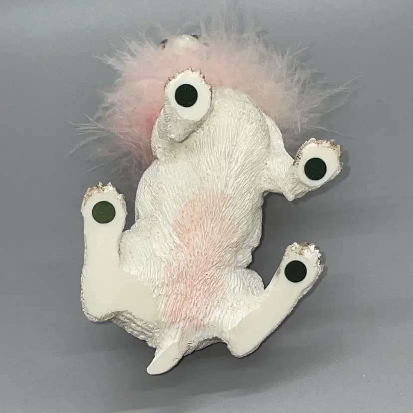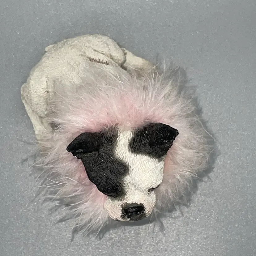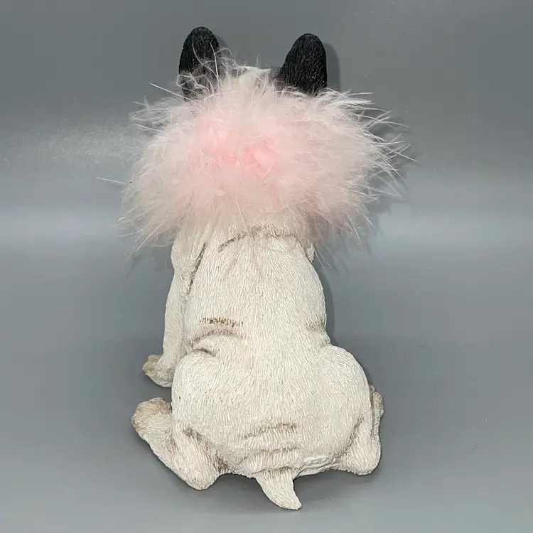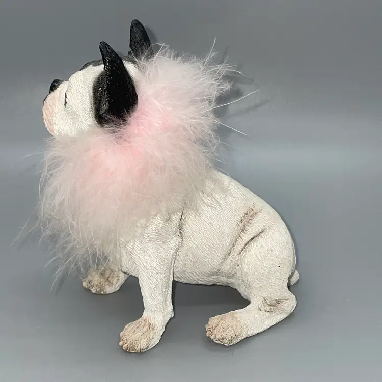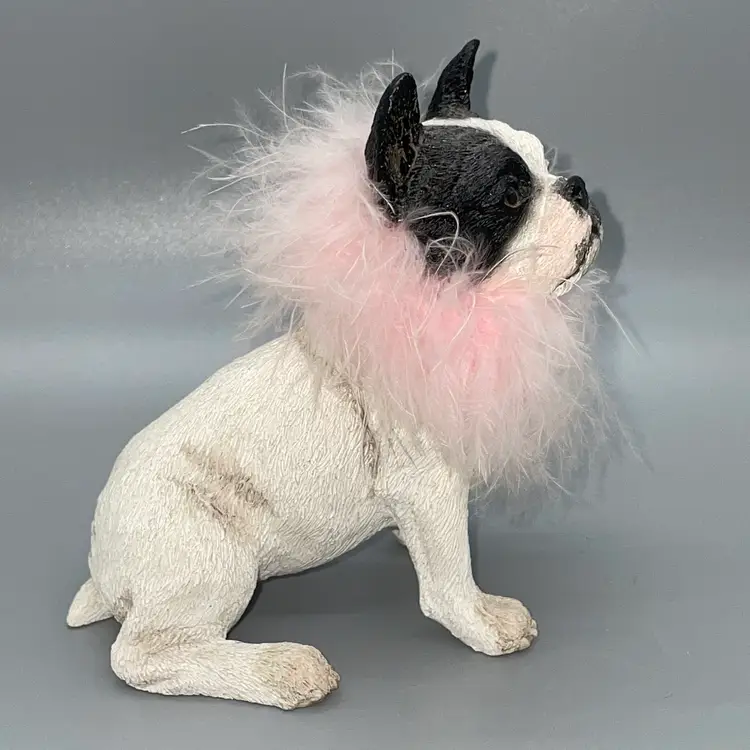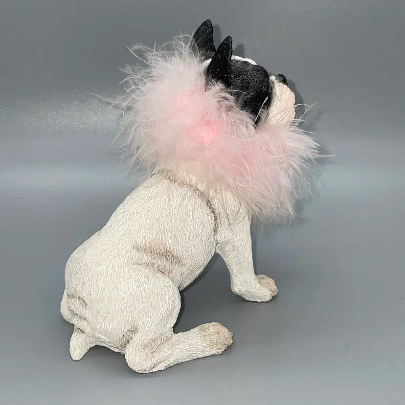 This is an UNBRANDED French Bulldog/Boston Terrier wearing a pink feather boa figurine.