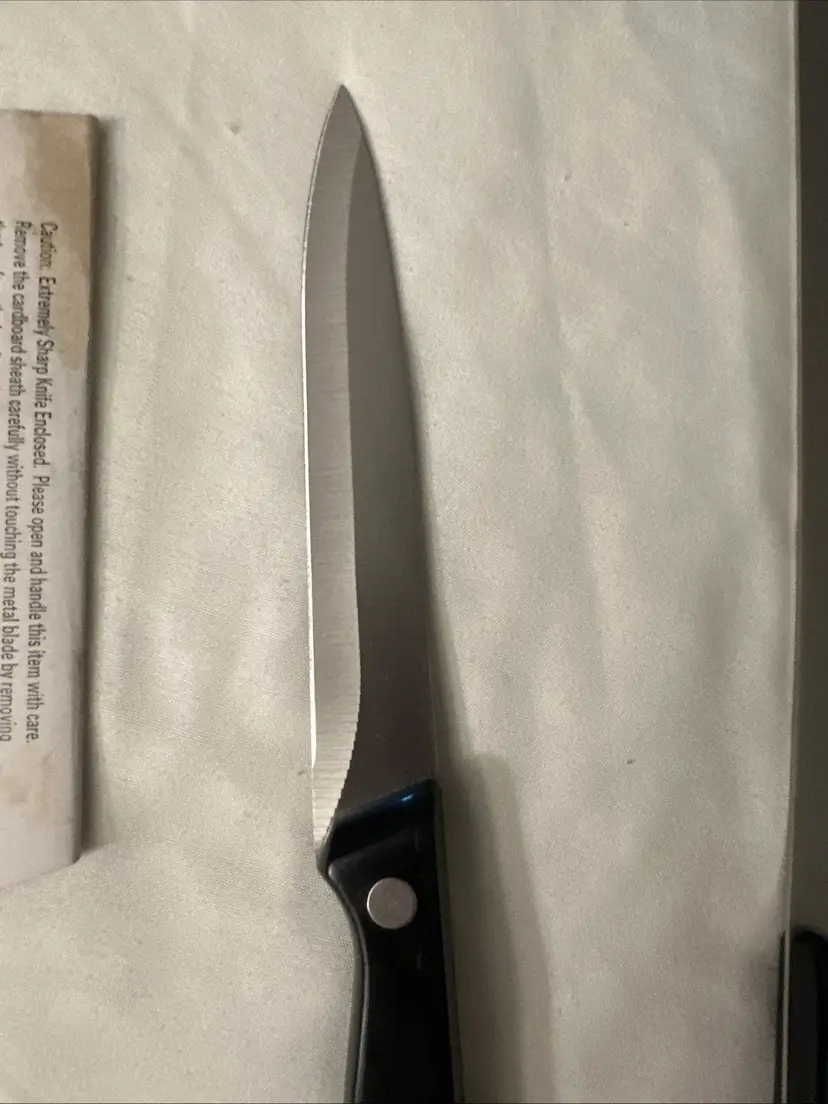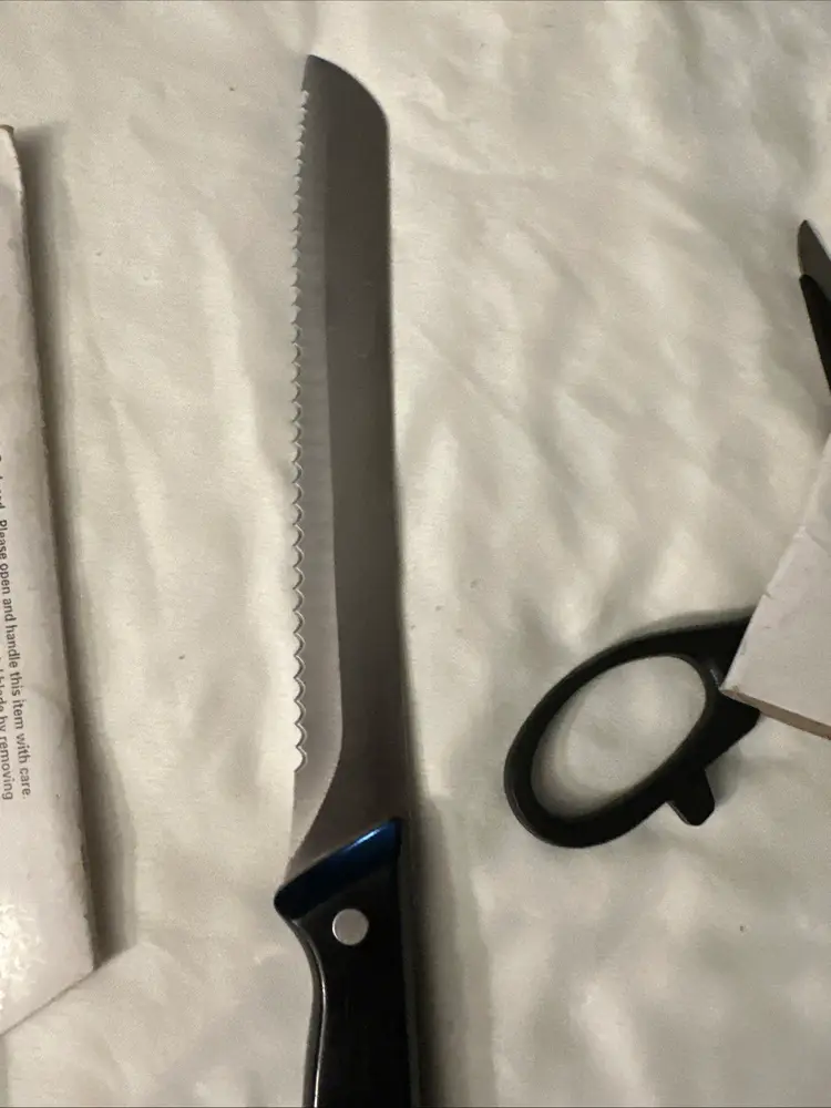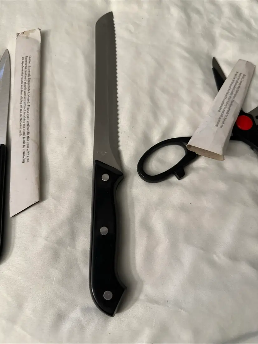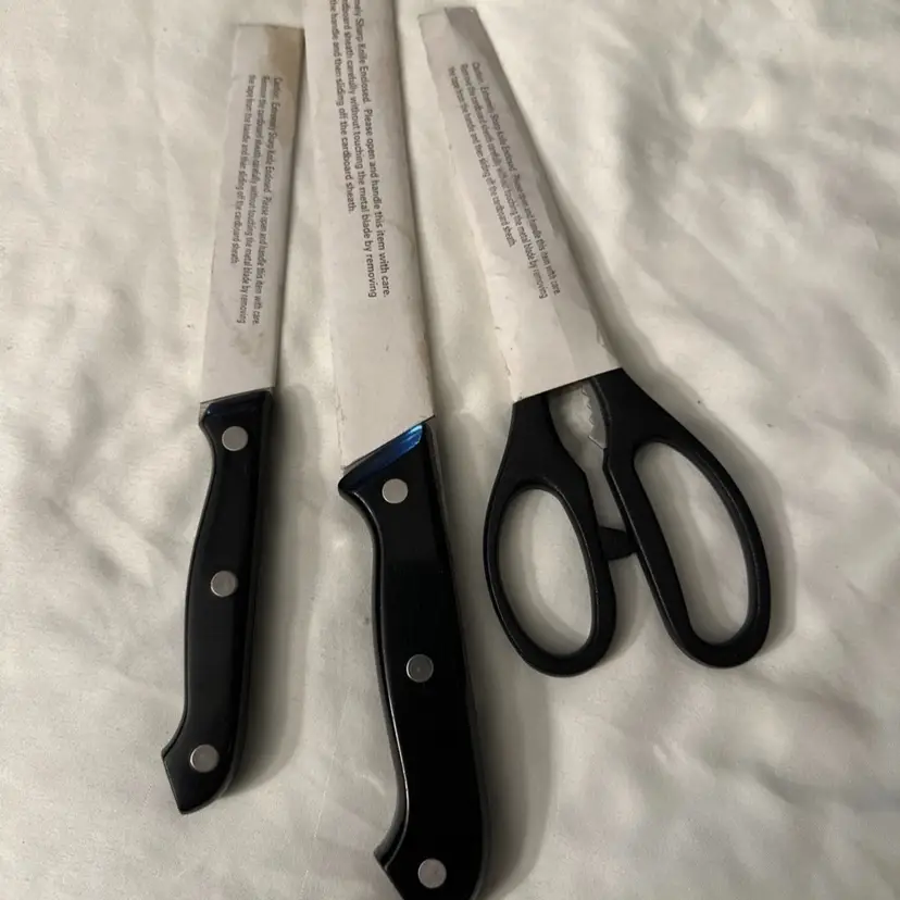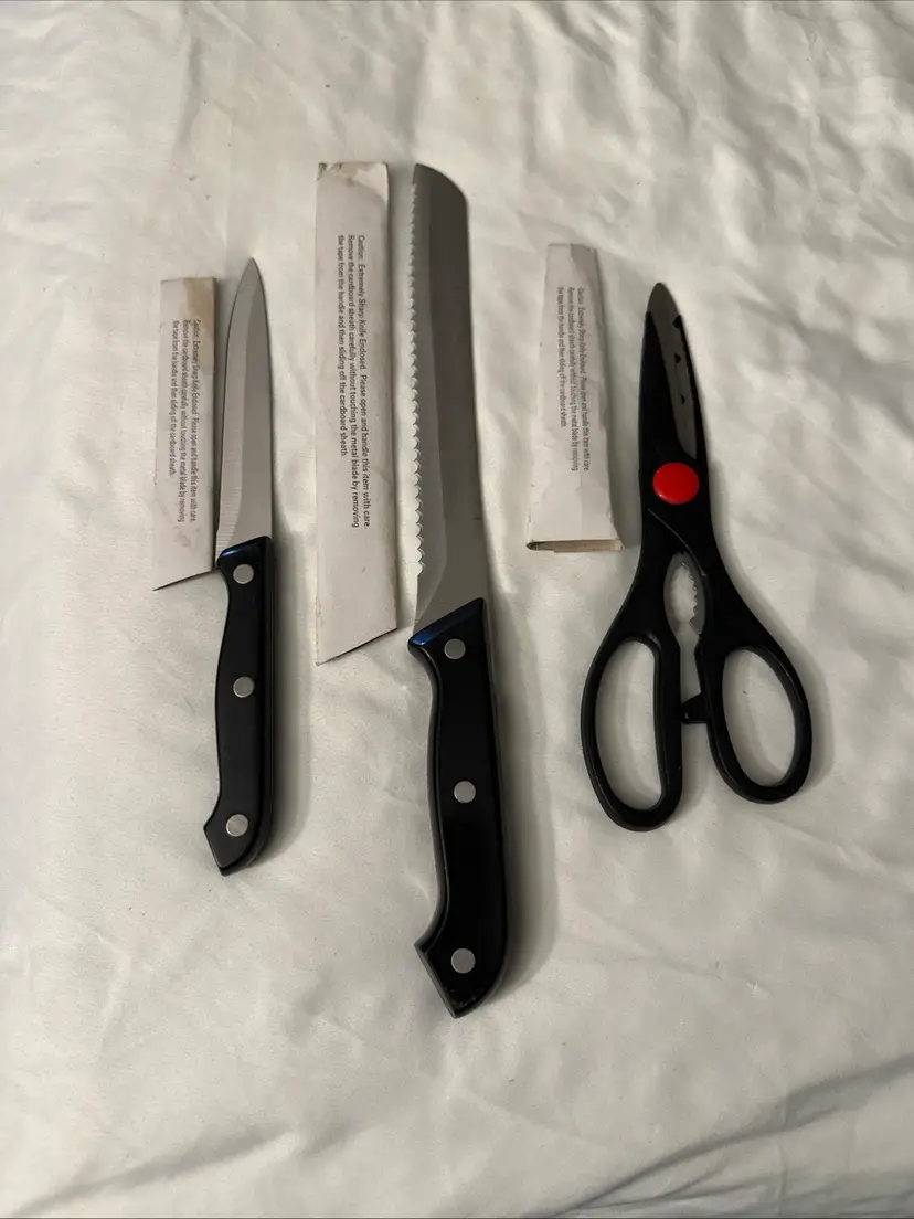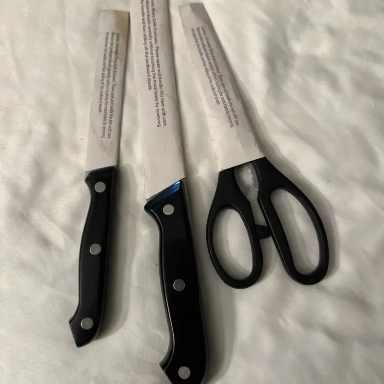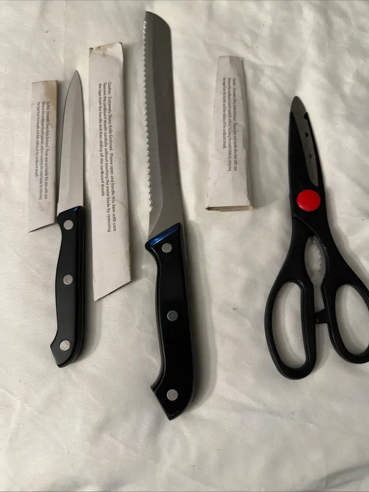 This 3 piece set includes shears, a serrated bread knife and a utility knife, all have blade covers. Rarely used, in great condition.