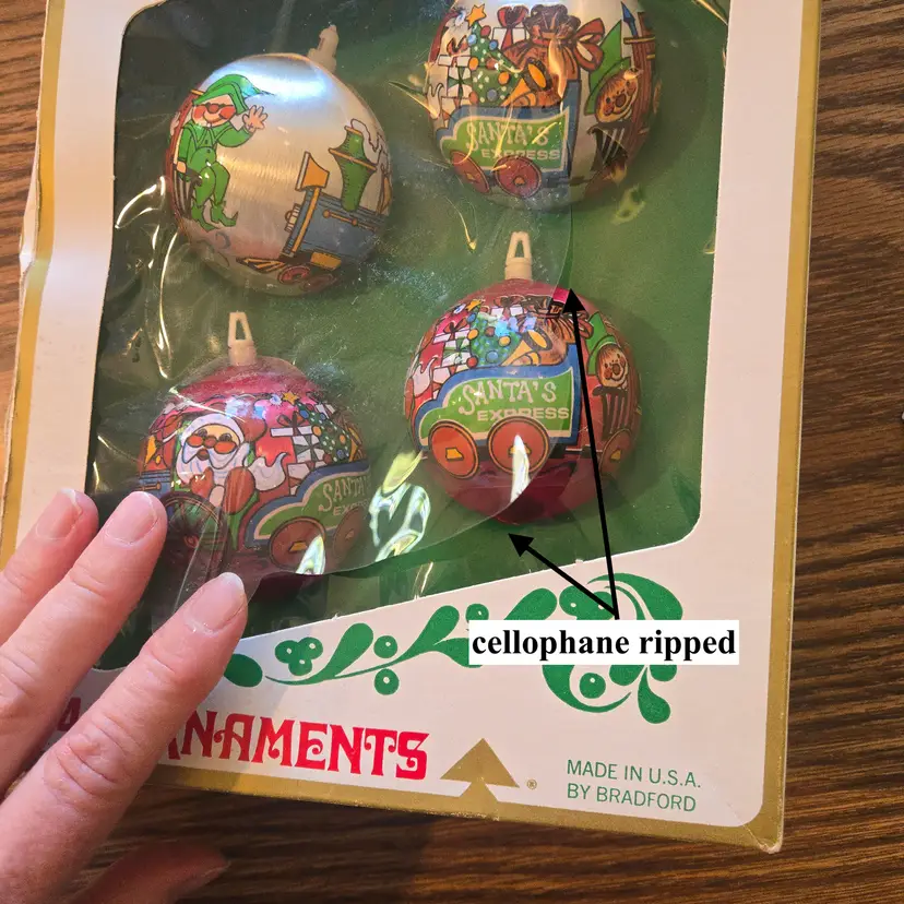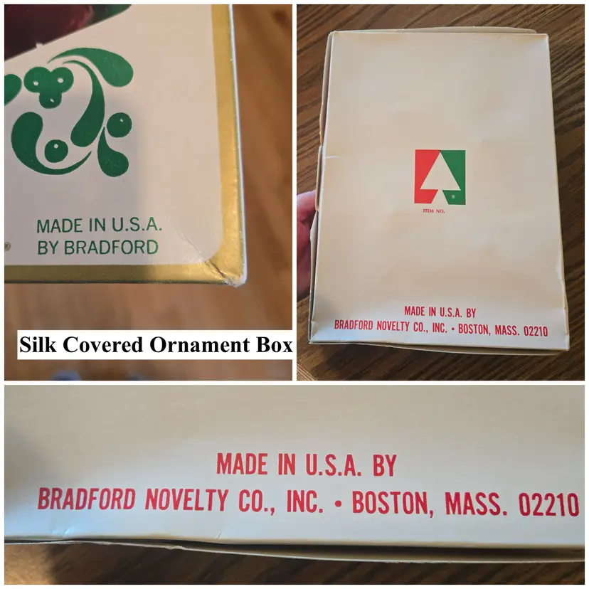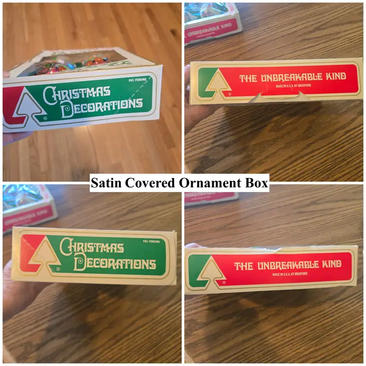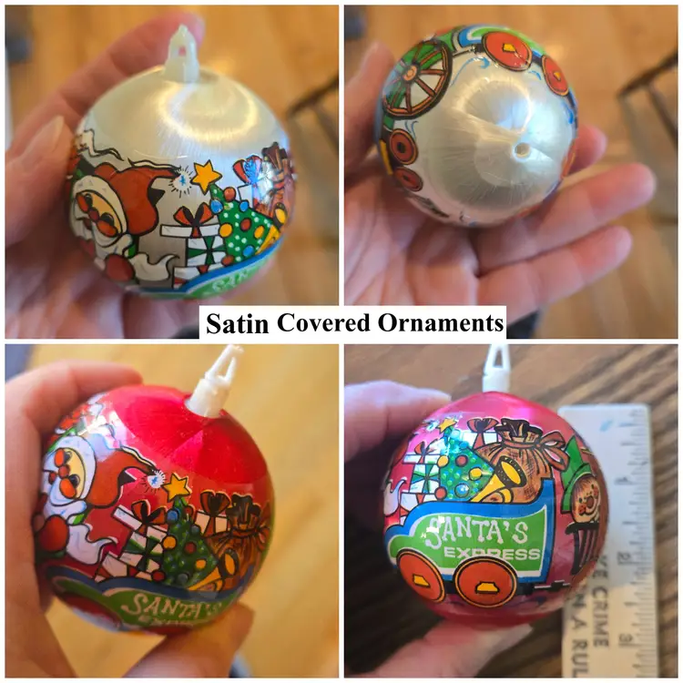 This is a set of four satin covered ornaments with plastic scene overlay. Two are red with the a Santa/elf scene. Two are white with the same Santa/elf scene as the others. The ornaments are in very good condition and the satin is like new (no pulls or snags on it). The box is somewhat damaged and the cellophane is ripped! My fault! I was trying to remove some smudging on the outside and it ripped. The silk covered ornament box is labeled as such in the pictures. I included a cute hanger that I found with these ornaments!
