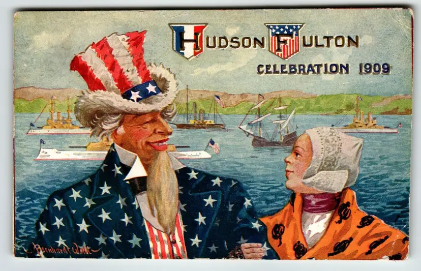 Unit of Sale: Single Unit Artist: Bernhard Wall Number of Items in Set: 1 Signed By: Bernhard Wall Occasion: Hudson Fulton Celebration Size: Standard (5.5 x 3.5 in) Signed: Yes Material: Paper Year Manufactured: 1909 Original/Licensed Reprint: Original Brand/Publisher: Unbranded Subject: Uncle Sam Personalize: No Type: Printed (Lithograph) Era: Pre-War (Pre-1914) Theme: Art, Greetings, Patriotic, People, Celebration, Ships, Boats, Harbor Features: Divided Back Time Period Manufactured: 1900-1919 Country/Region of Manufacture: Unknown Postage Condition: Posted