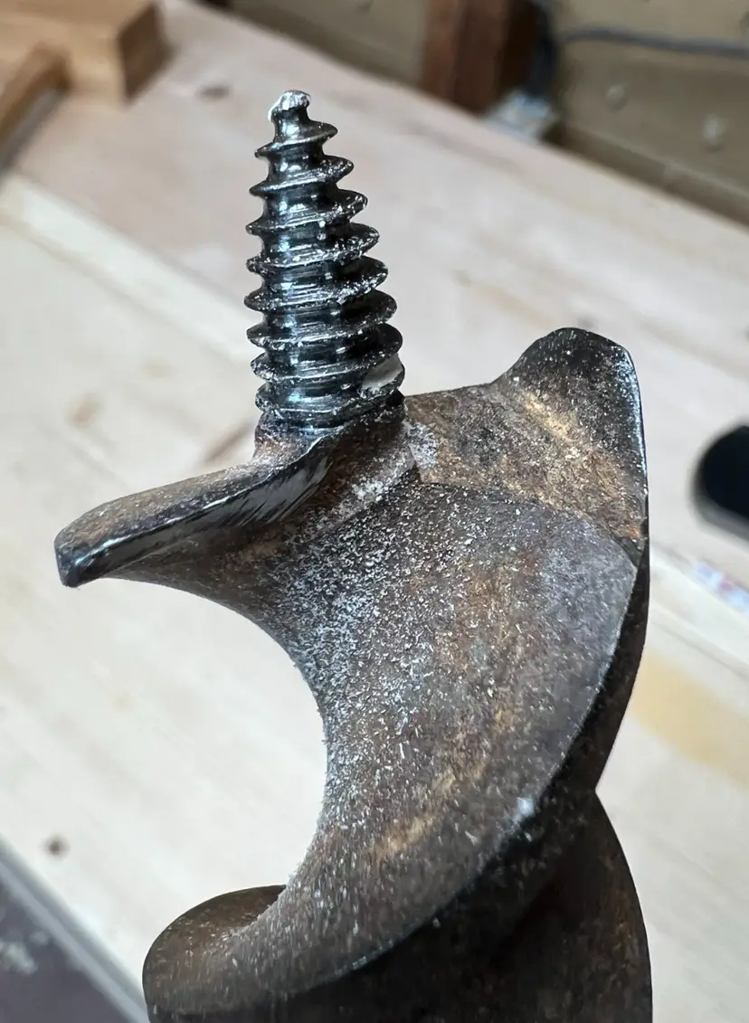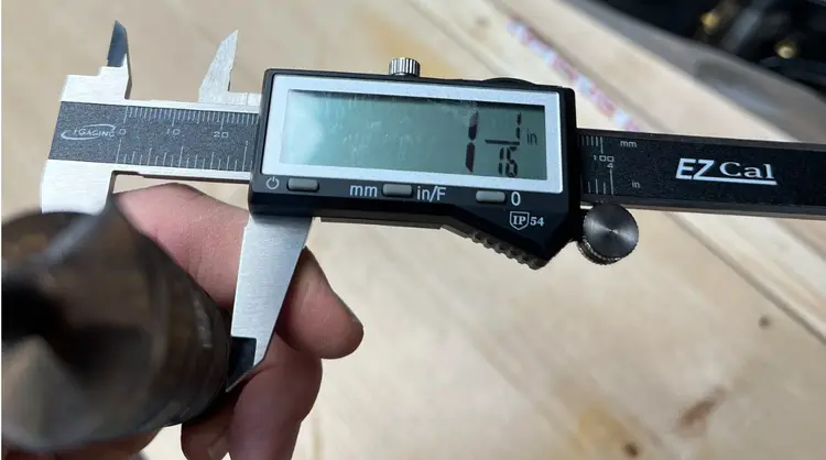 This bit is stamped 18 (1 1/8" size) but the calipers place it at 1 1/16", a less common size. It's ready to go and went through a poplar board no problem on a 14" brace (12" would work fine too).