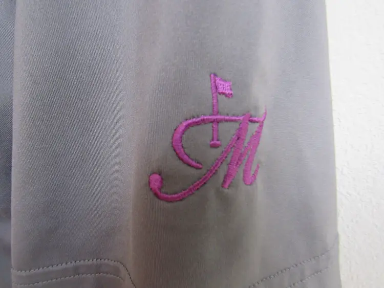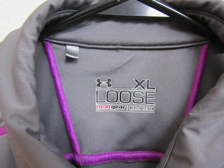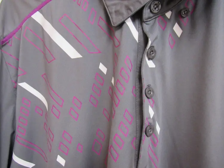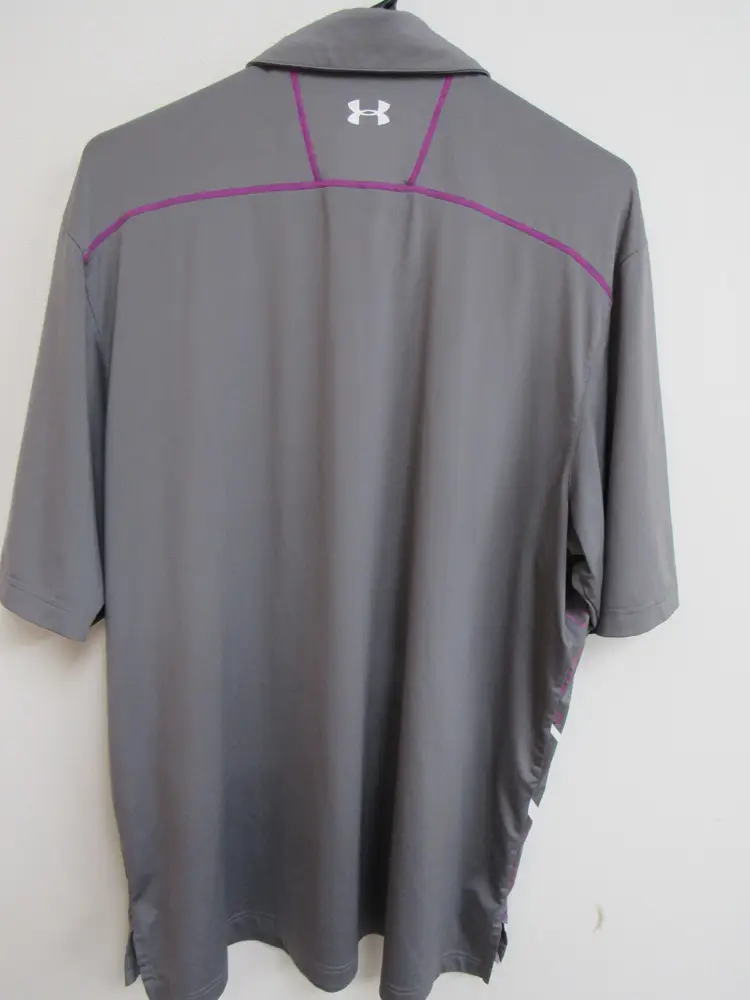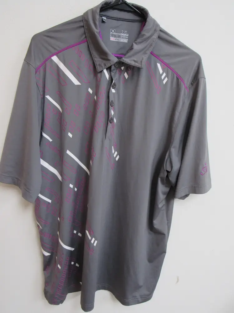 Under Armour Heatgear loose gray/purple geometric pattern short-sleeve golf polo shirt. Size XL. 24" armpit to armpit and 33.5" top of collar to bottom of hem. Nice condition. Golf club logo on one sleeve. 4117
