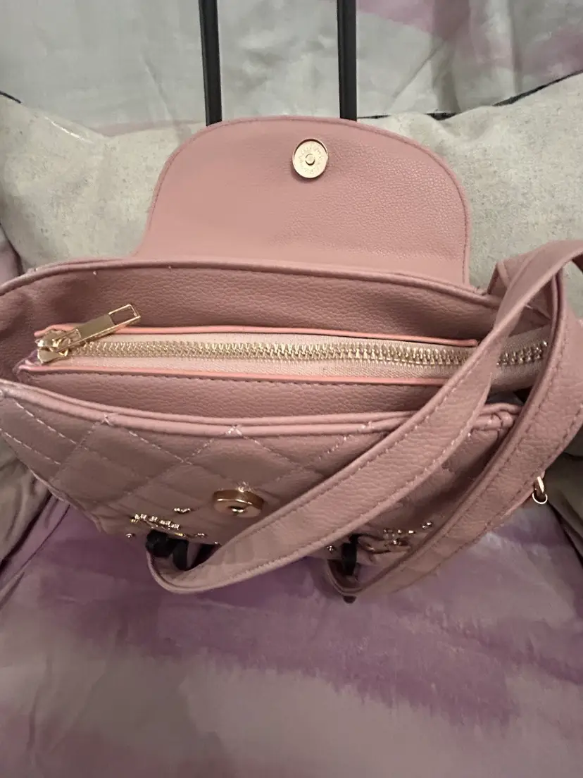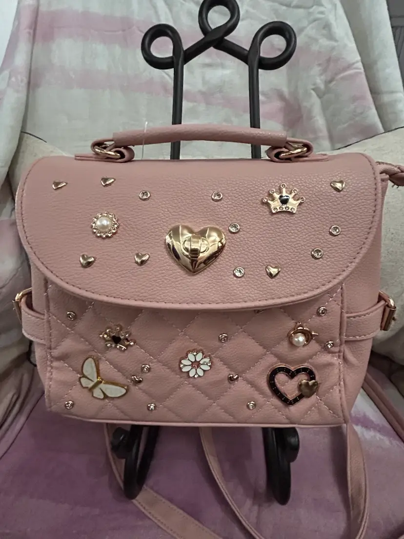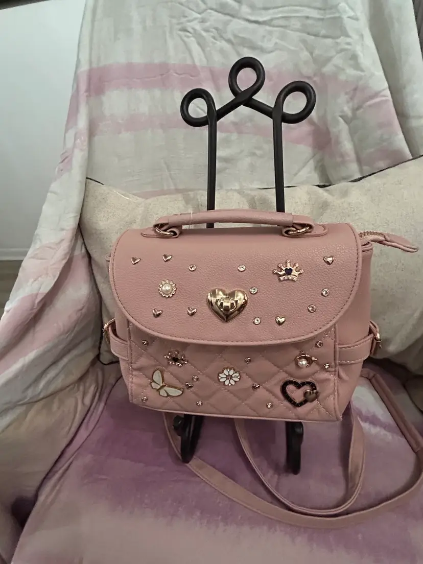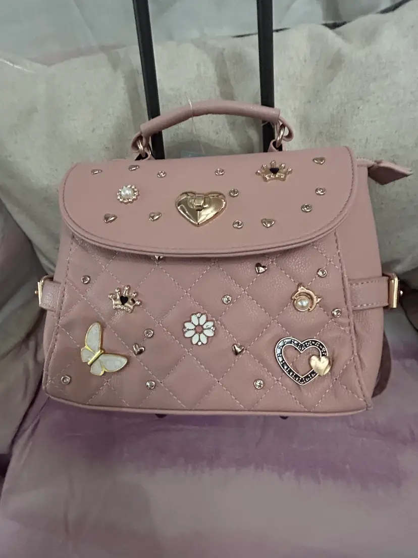 This is most adorable in pink with the cutest charms; butterflies, hearts, crown, daisy, rhinestones and a cat with a pearl. It can be carried as a traditional crossbody or can be used as a backpack style bag for hands free use. Generous size with nice gold buckles and clasps. What young lady wouldn’t love this bag?