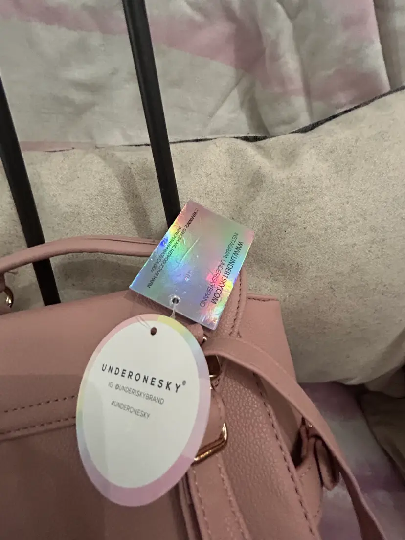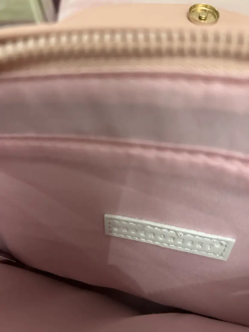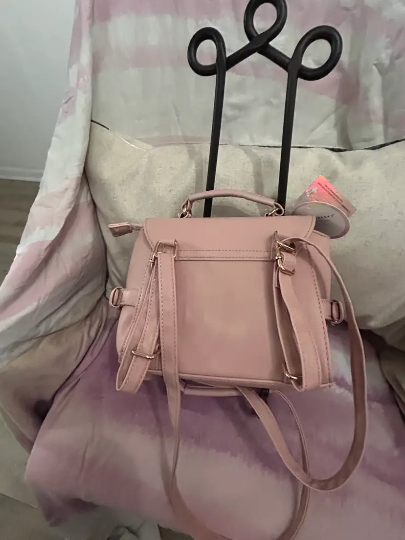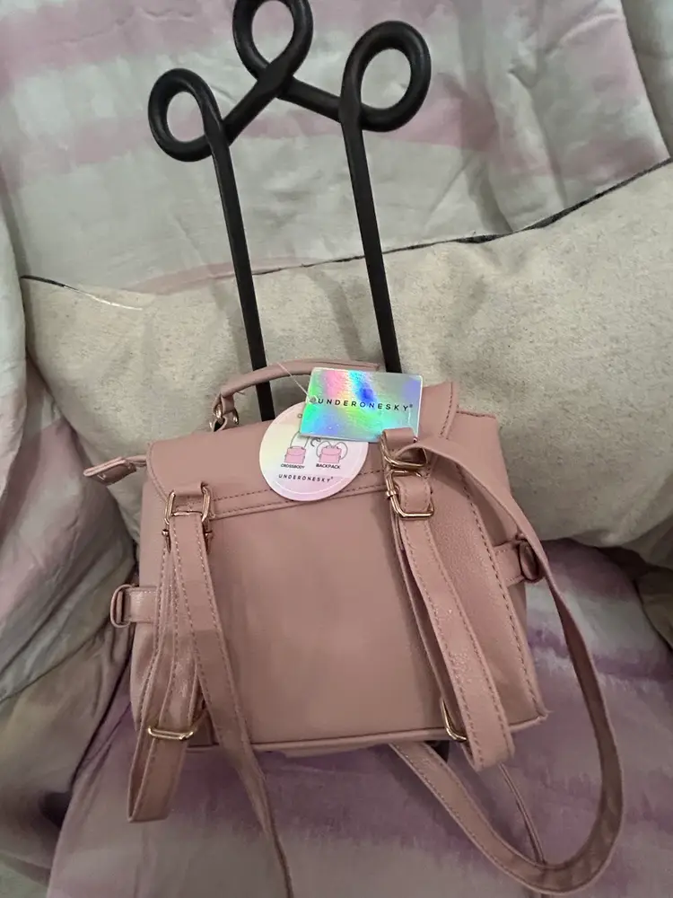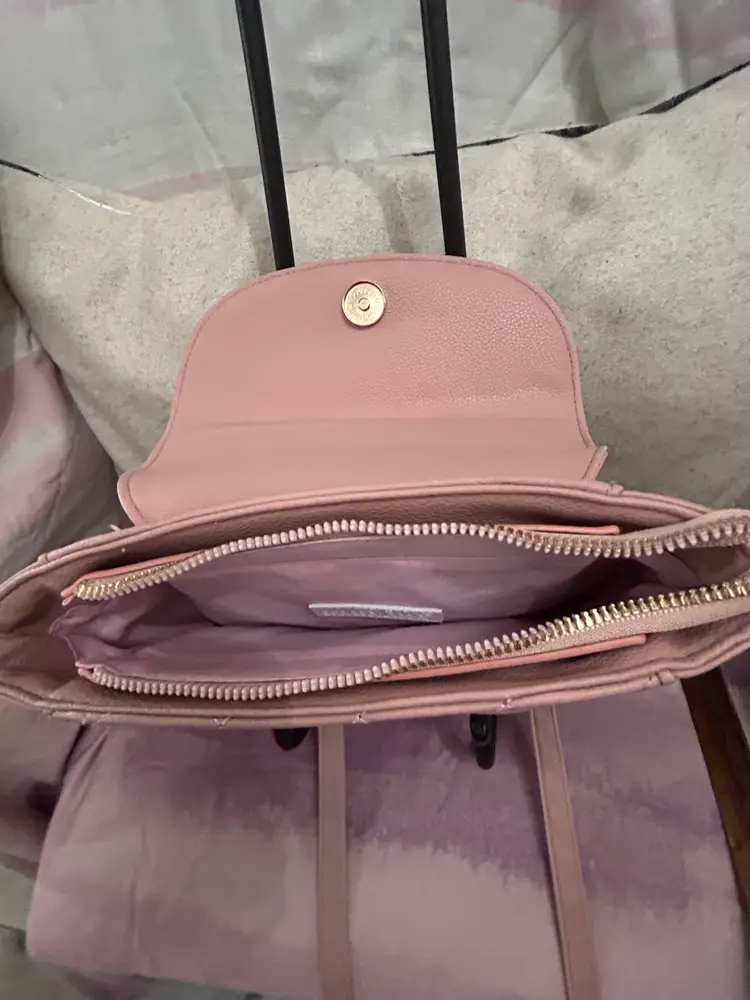 This is most adorable in pink with the cutest charms; butterflies, hearts, crown, daisy, rhinestones and a cat with a pearl. It can be carried as a traditional crossbody or can be used as a backpack style bag for hands free use. Generous size with nice gold buckles and clasps. What young lady wouldn’t love this bag?