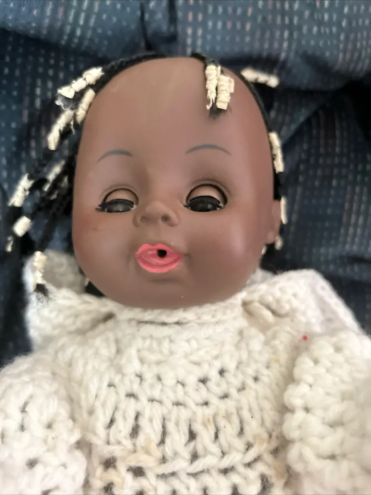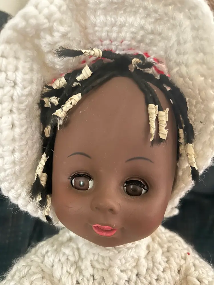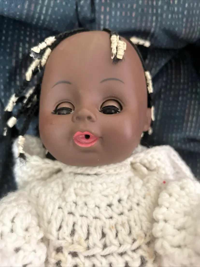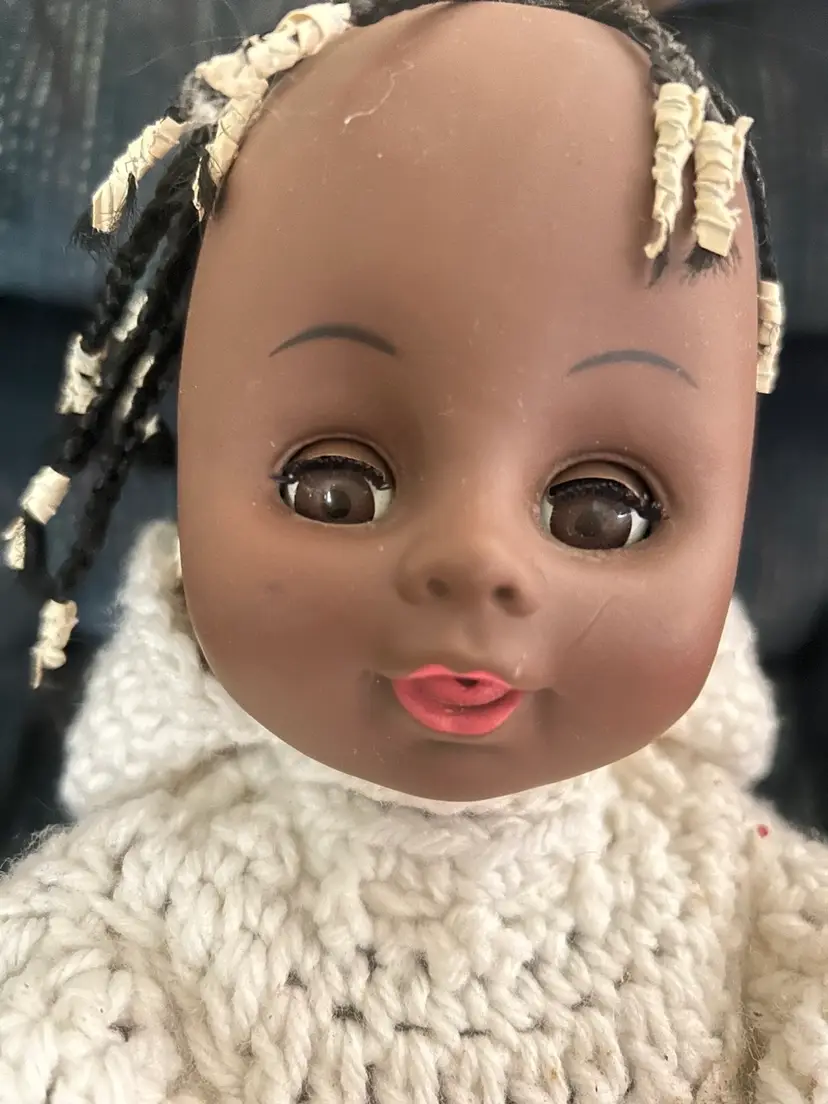 Beautiful Doll. Marked Uneeda Doll Co Inc 1979 on her back . Looks like she has some original shoes on. Her outfit is homemade & a little dirty. Her hair has been braided. She does have a hole in her mouth maybe possibly for a bottle at one time. Otherwise the doll is in great shape for her age. She stands about 15 inches tall.