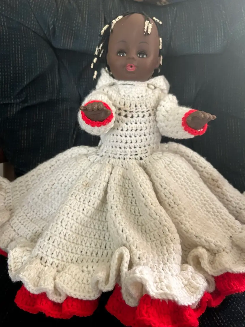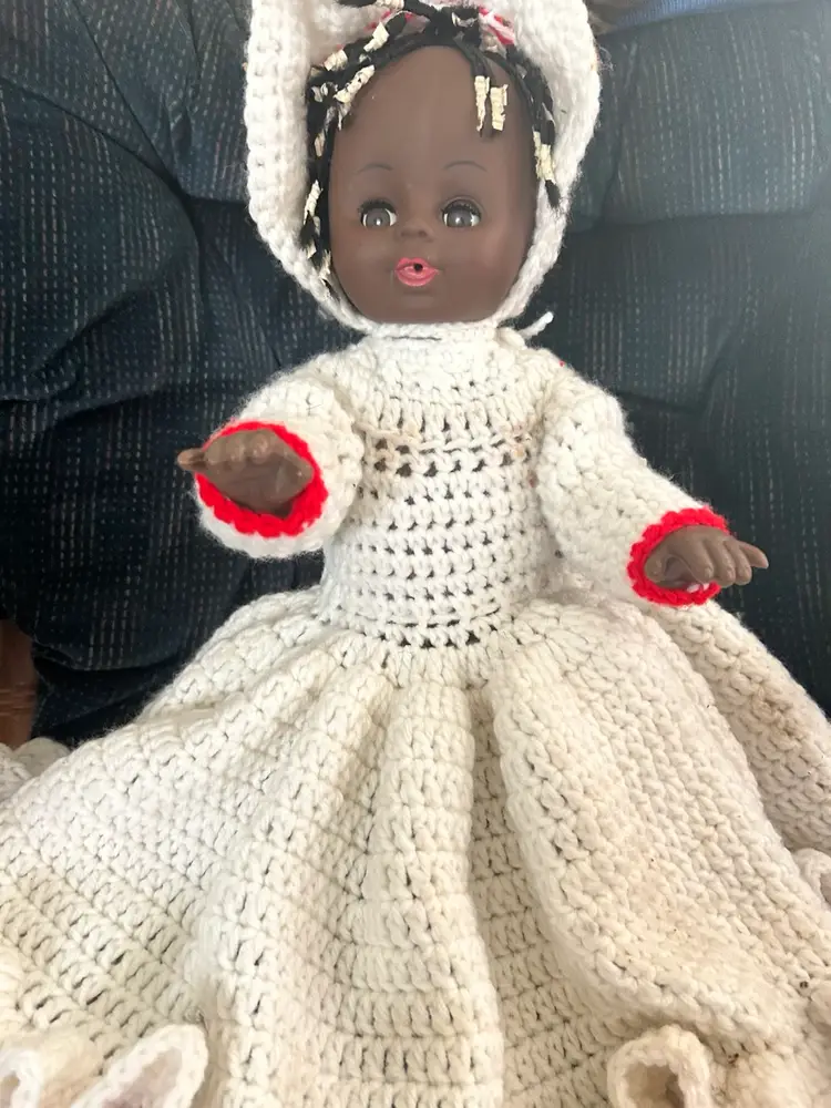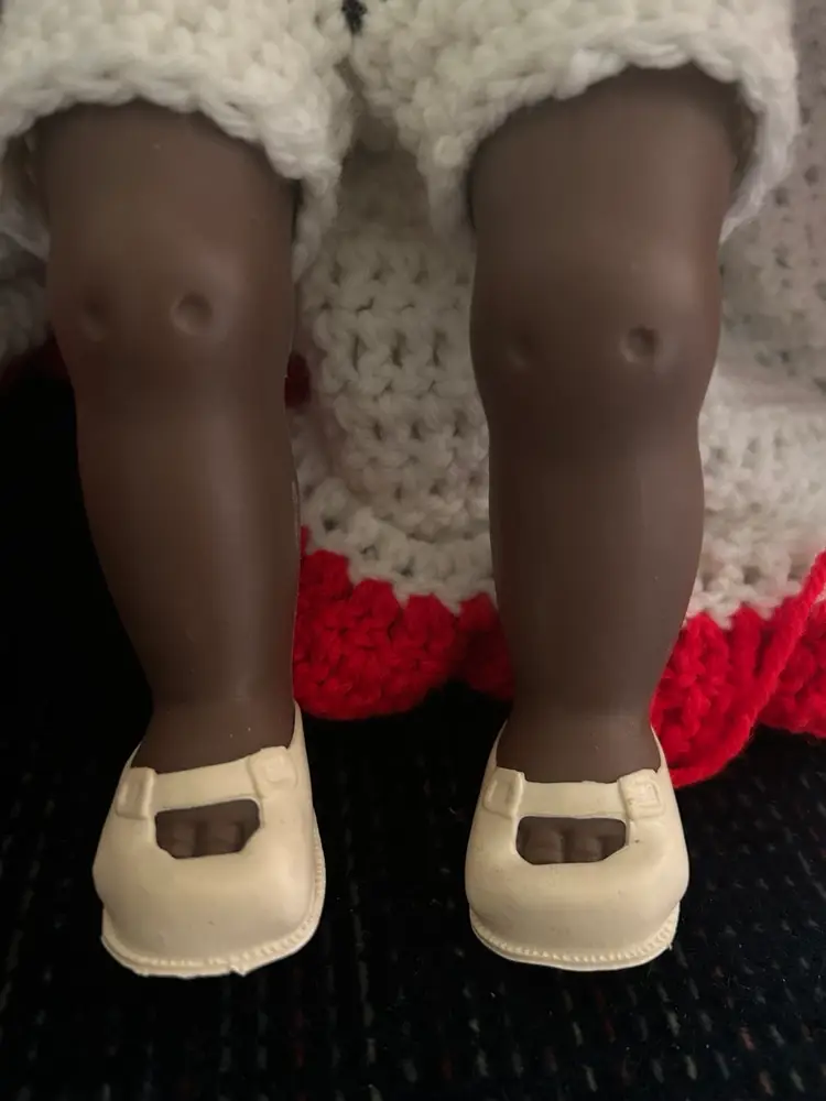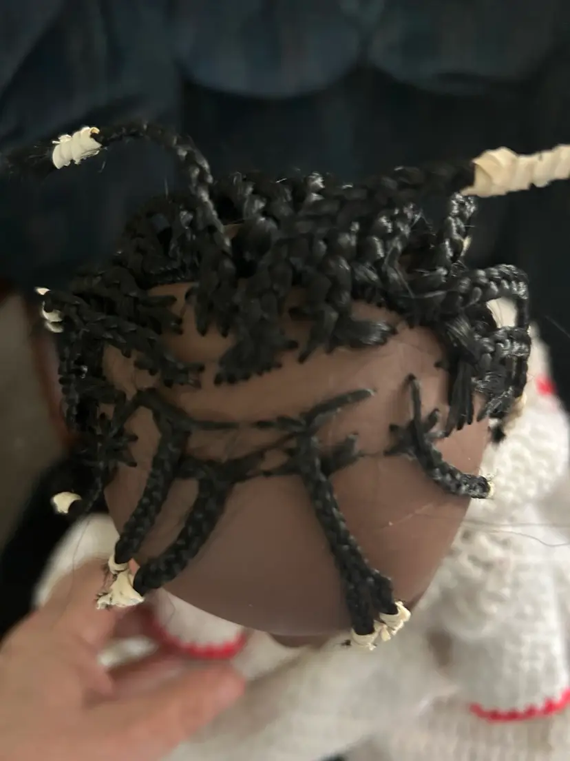 Beautiful Doll. Marked Uneeda Doll Co Inc 1979 on her back . Looks like she has some original shoes on. Her outfit is homemade & a little dirty. Her hair has been braided. She does have a hole in her mouth maybe possibly for a bottle at one time. Otherwise the doll is in great shape for her age. She stands about 15 inches tall.