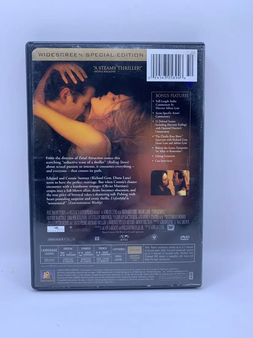 A New York city couple s lives go dangerously awry when when the wife indulges in an adulterous affair. Starring Diane Lane and Richard Gere. Special features: Audio commentary by director Adrian Lyne; Audio commentary by stars Diane Lane and Richard Gere; 11 deleted scenes and alternate ending with optional commentary; An Affair to Remember and Scene Editing with Editor Anne Coates feature; Charlie Rose Show interviews; Director s script notes; Rose Show interviews; Director s script notes; Still gallery; Theatrical trailer.Size: Unisex OS