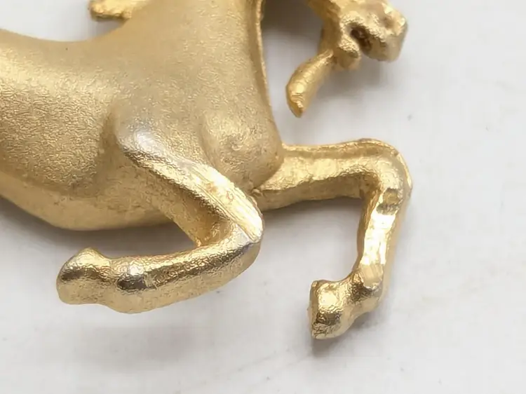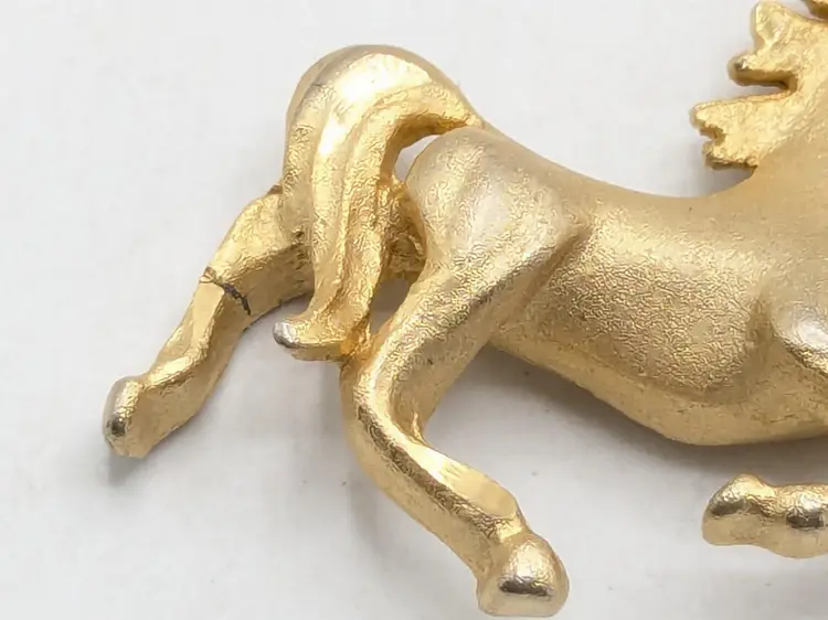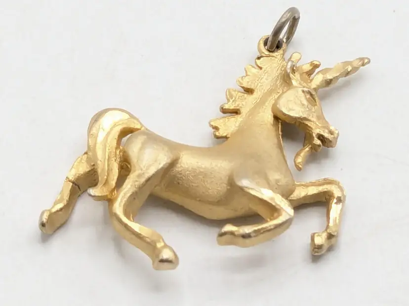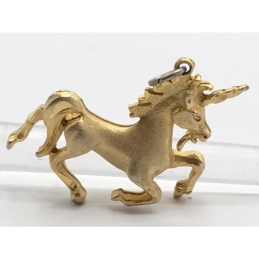 Charming unicorn pendant in gold tone. Perfect for adding a touch of magic to any necklace or bracelet. Good condition with minor wear consistent with age. Measures 1" height and 1 1/2" wide. (EN2)