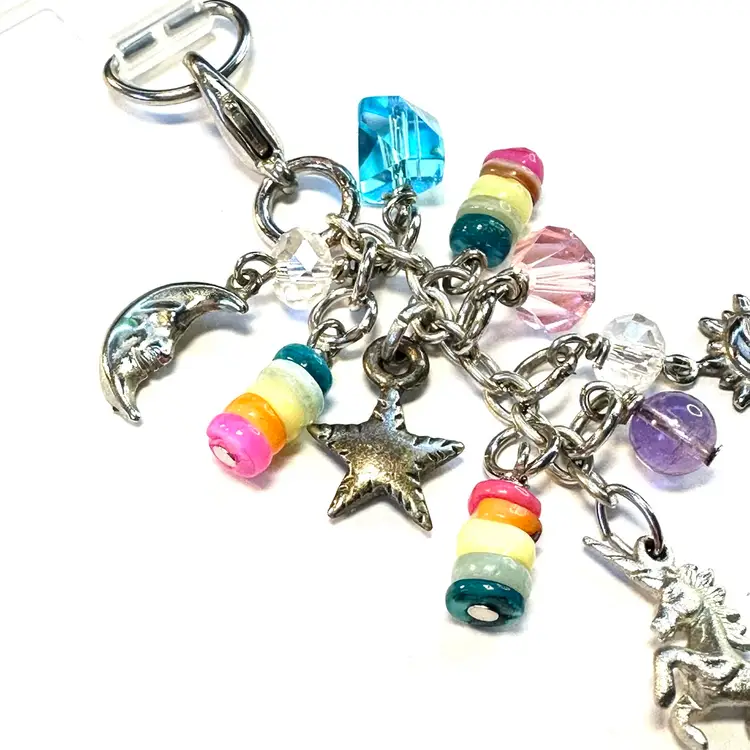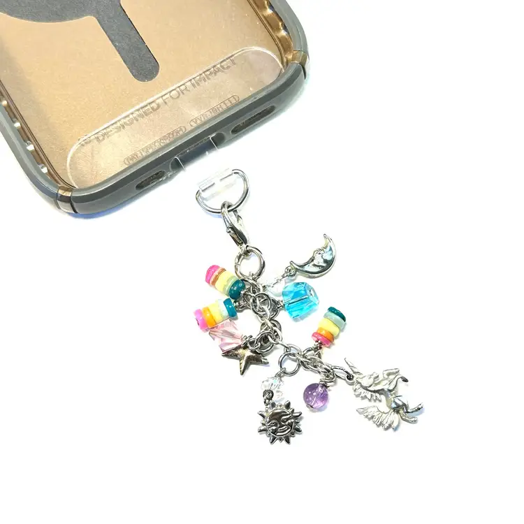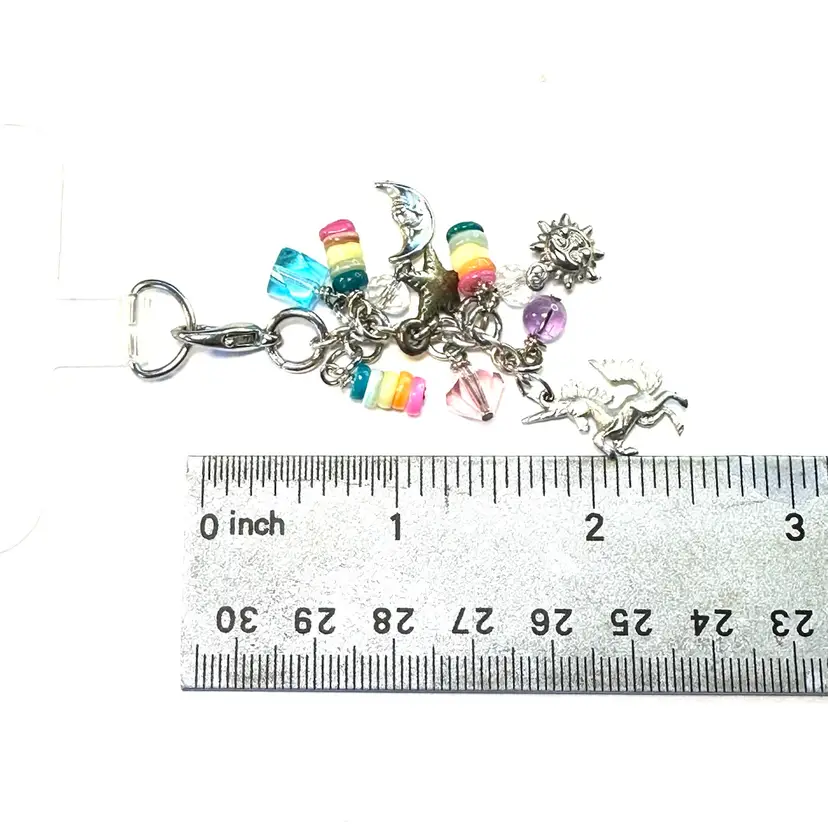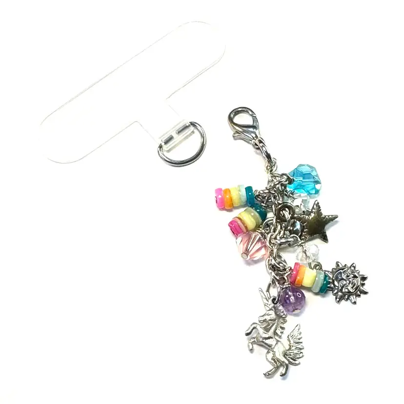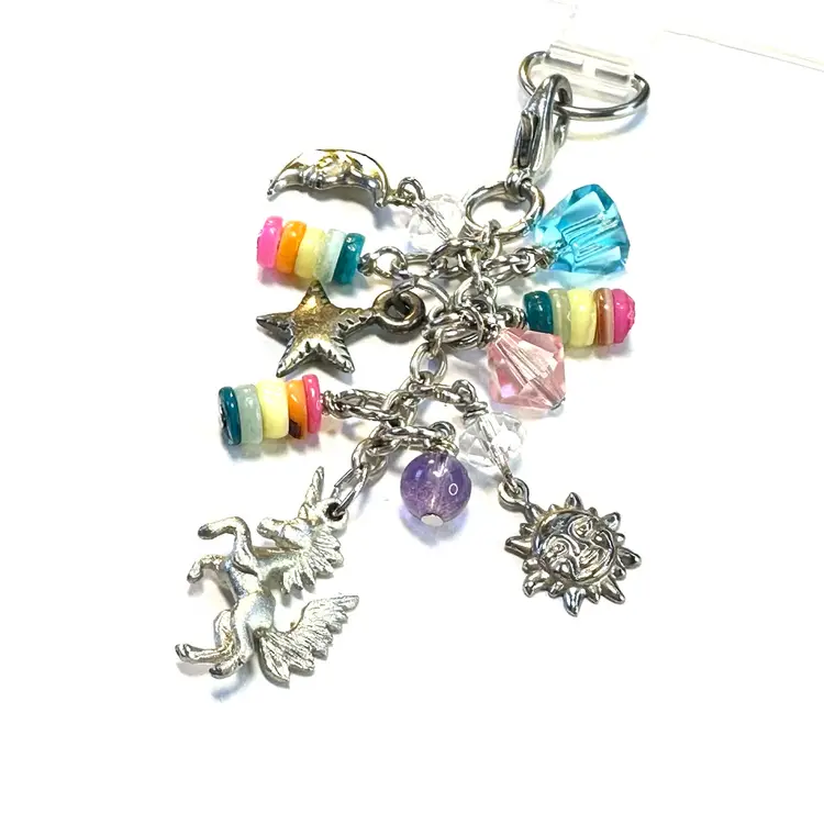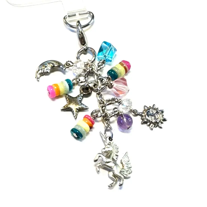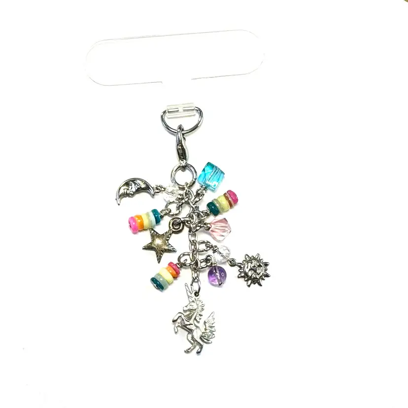 Features unicorn, sun, moon, star charms and faceted glass, rainbow shell disc, and an amethyst bead(s) Silver tone findings Cell phone charm holder which fits between the phone and the case Lobster clasp allows for quick and easy removal when needed without removing case Made by me with repurposed jewelry pieces