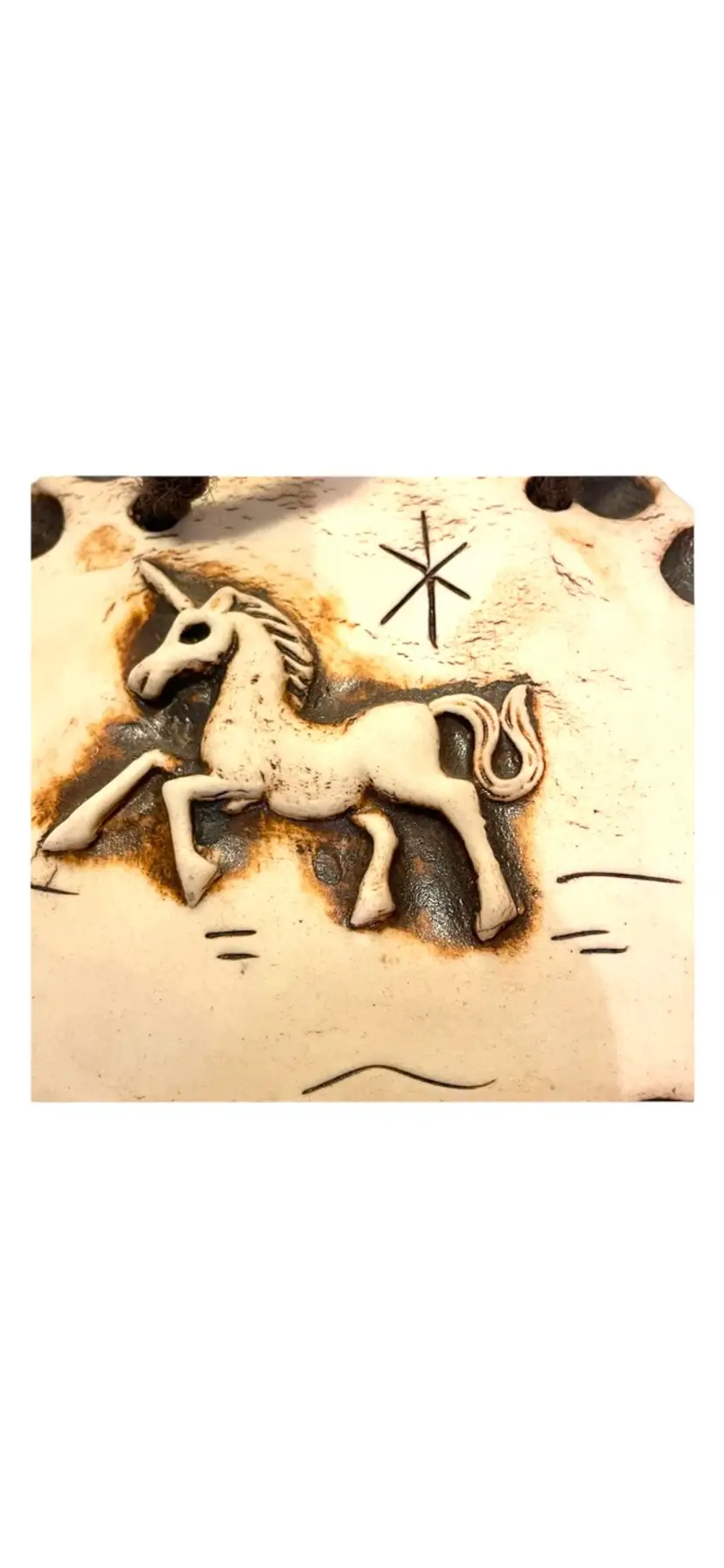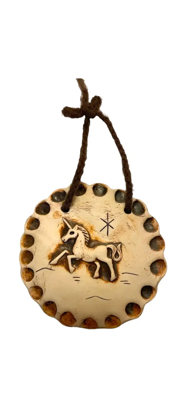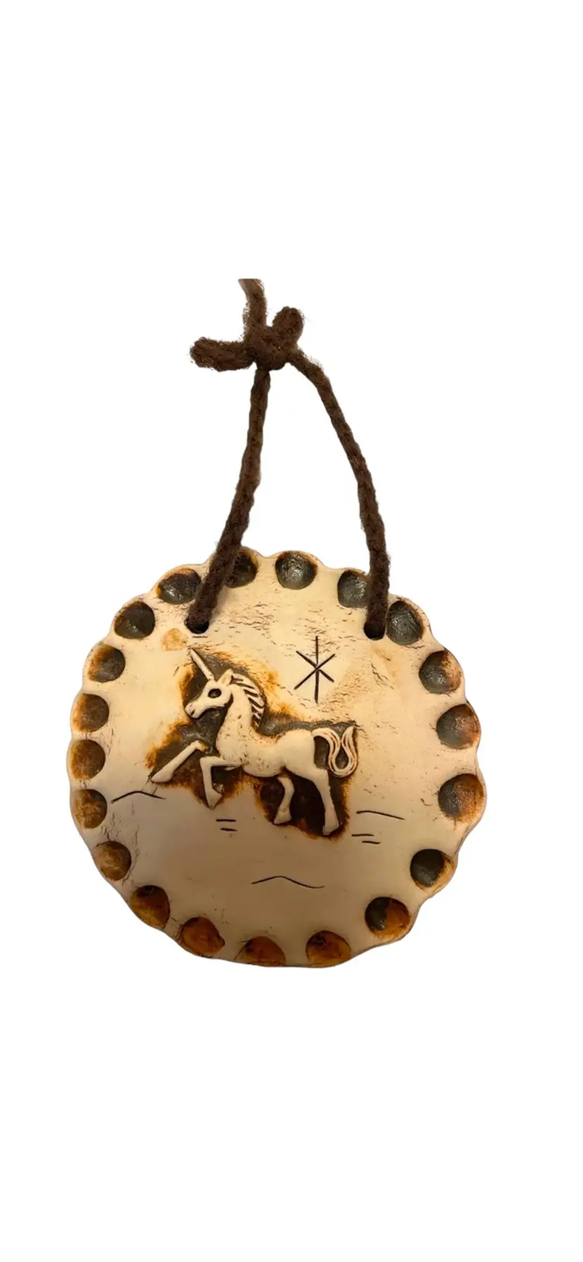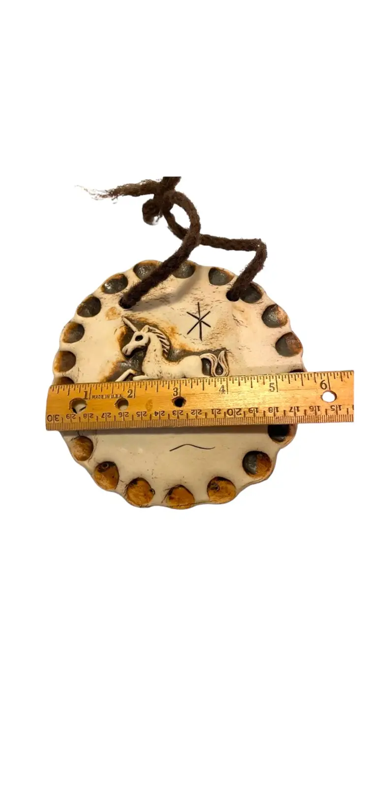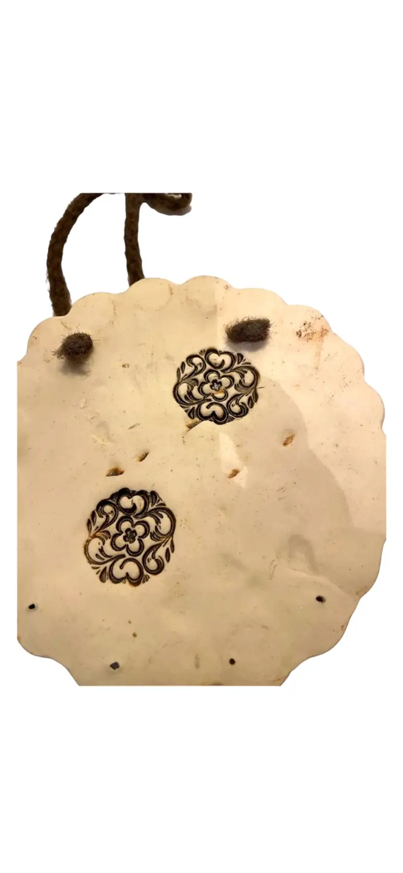 Attached yarn for hanging. Diameter 6”. No chips or cracks