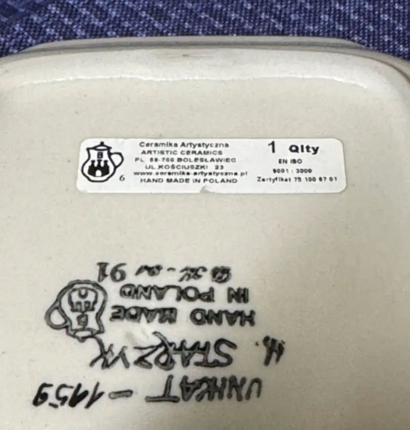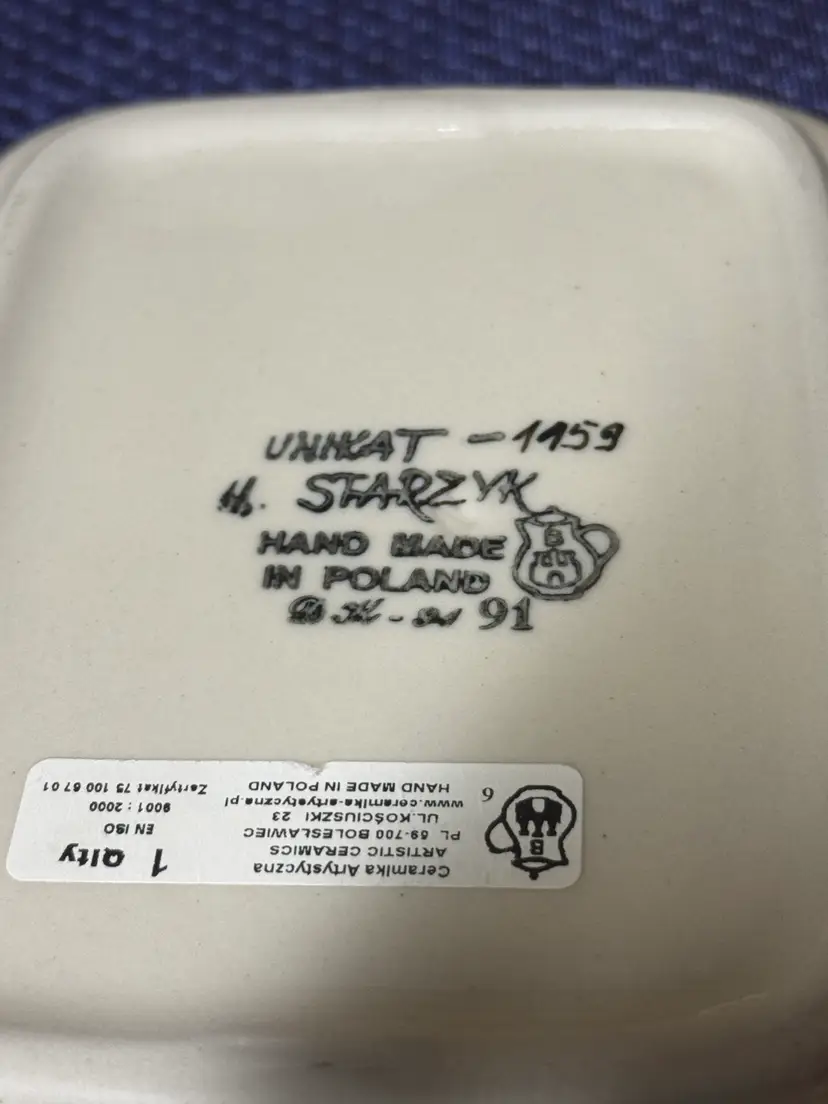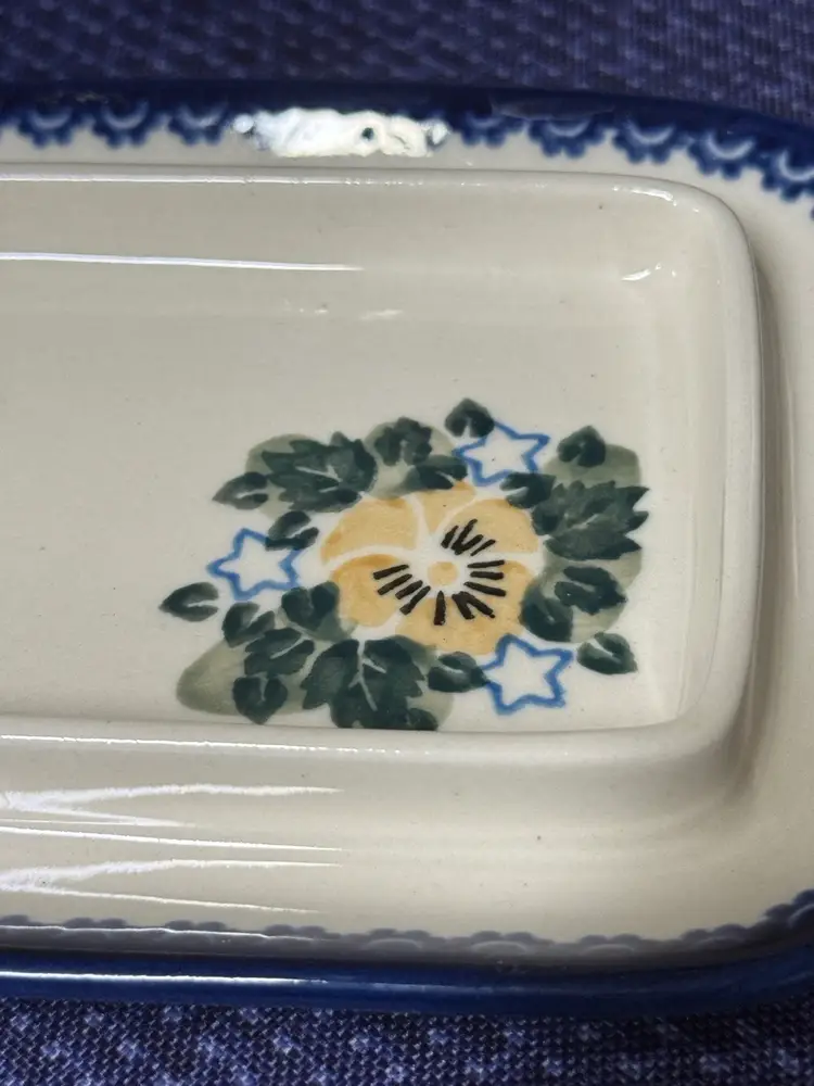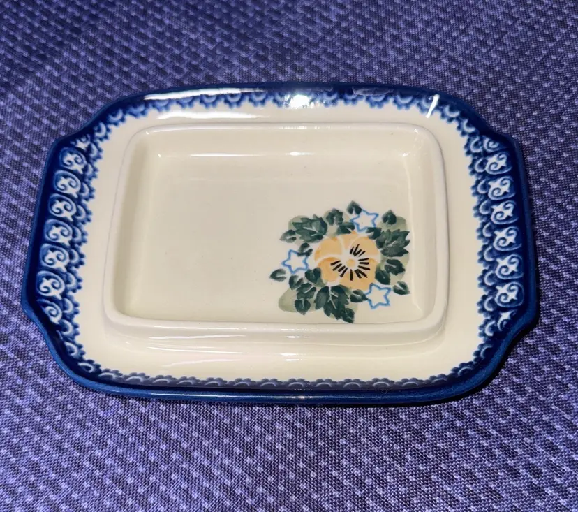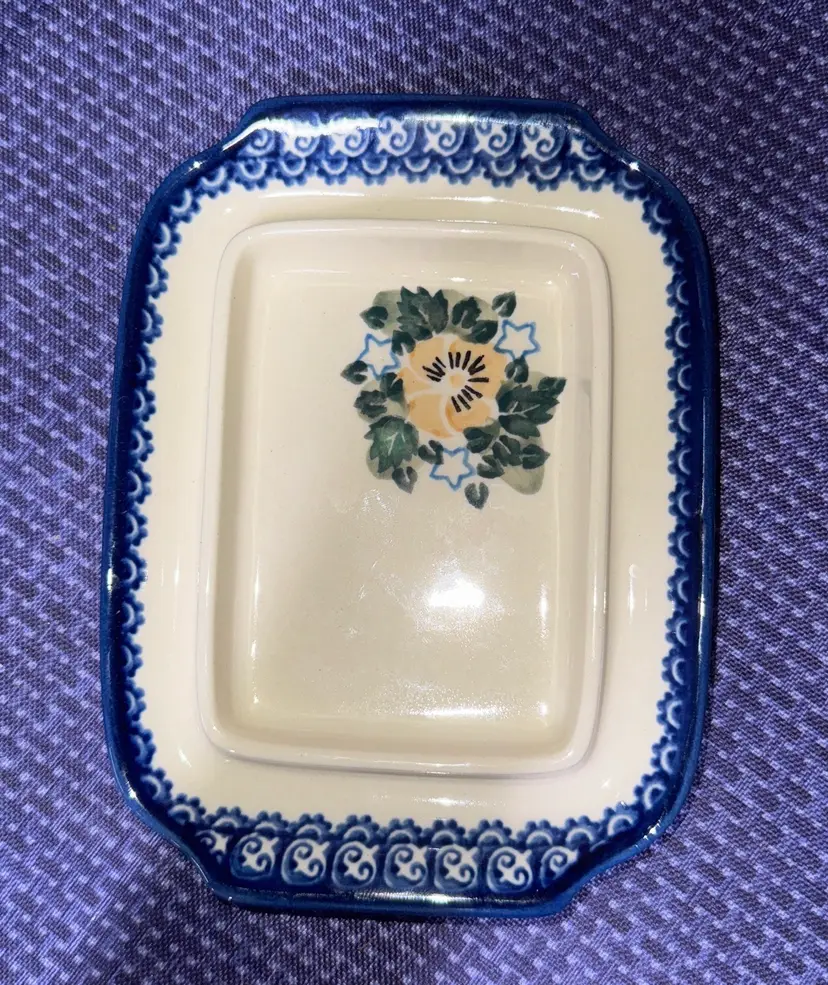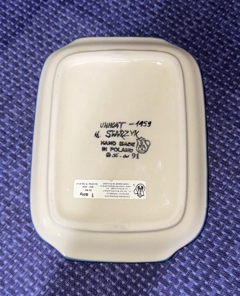 UNIKAT Polish Pottery ~ Butter Dish Bottom ~ H. Starzyk #1159 6.75” by 5” rectangular Excellent condition with no breaks or chips Elegant ceramic tray featuring a floral design with blue accents. Perfect for serving or decor. (11491023252)