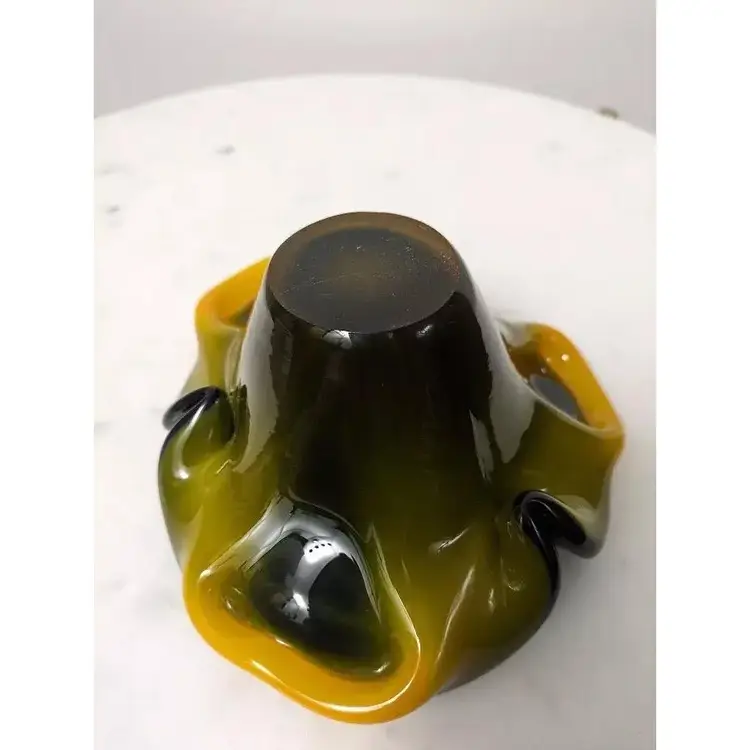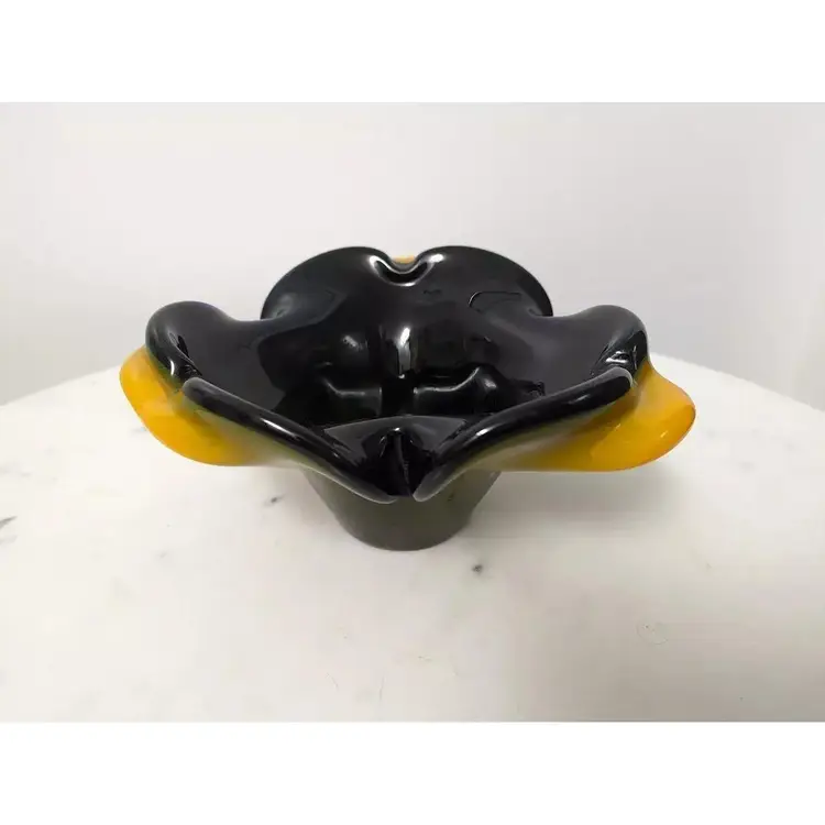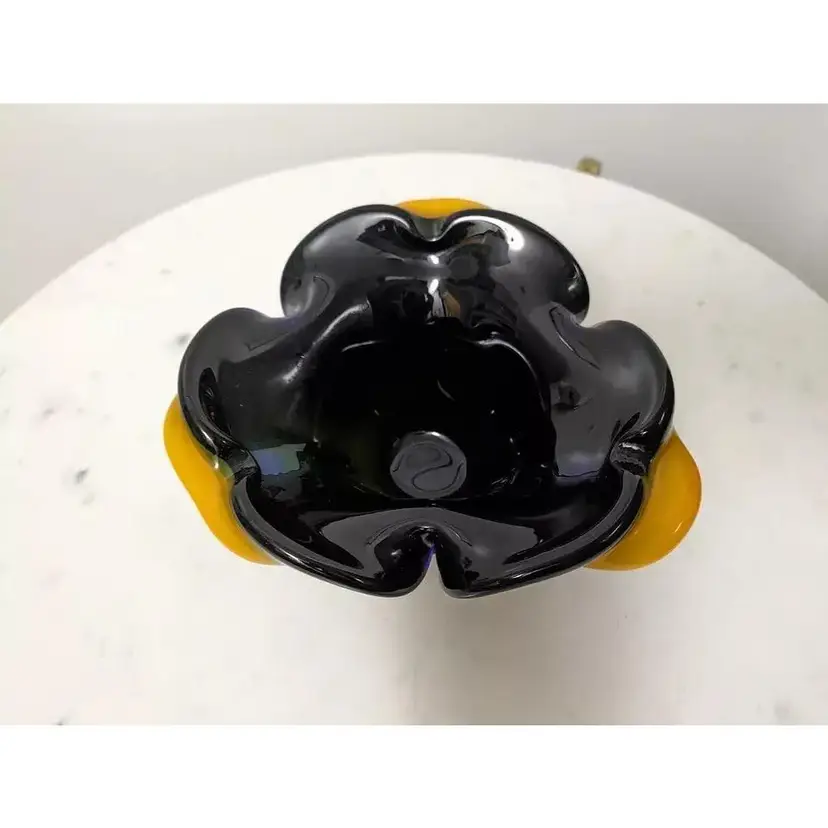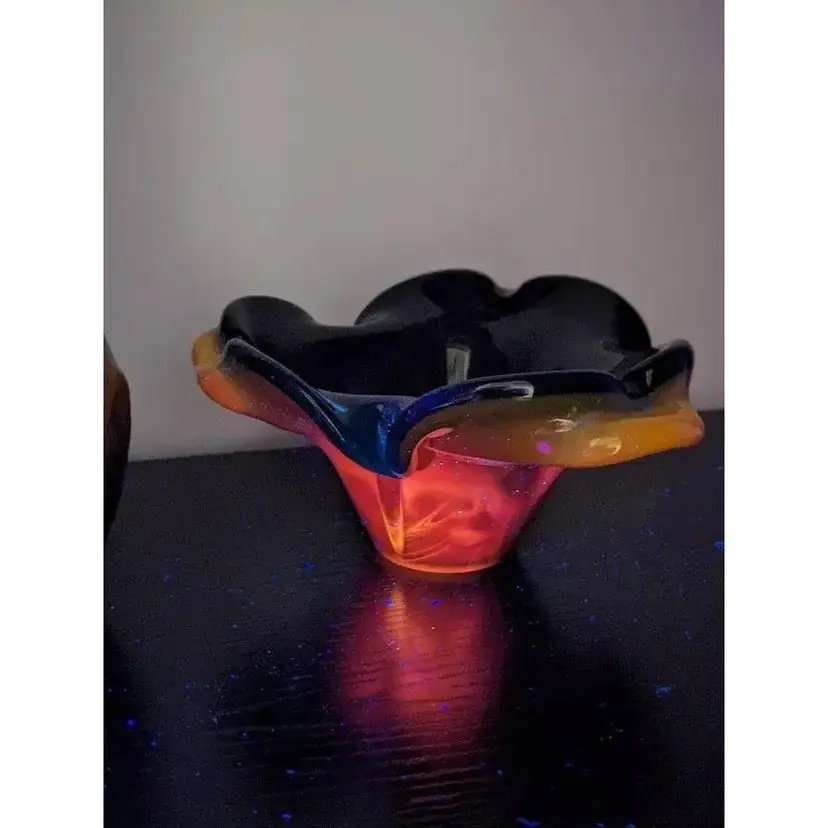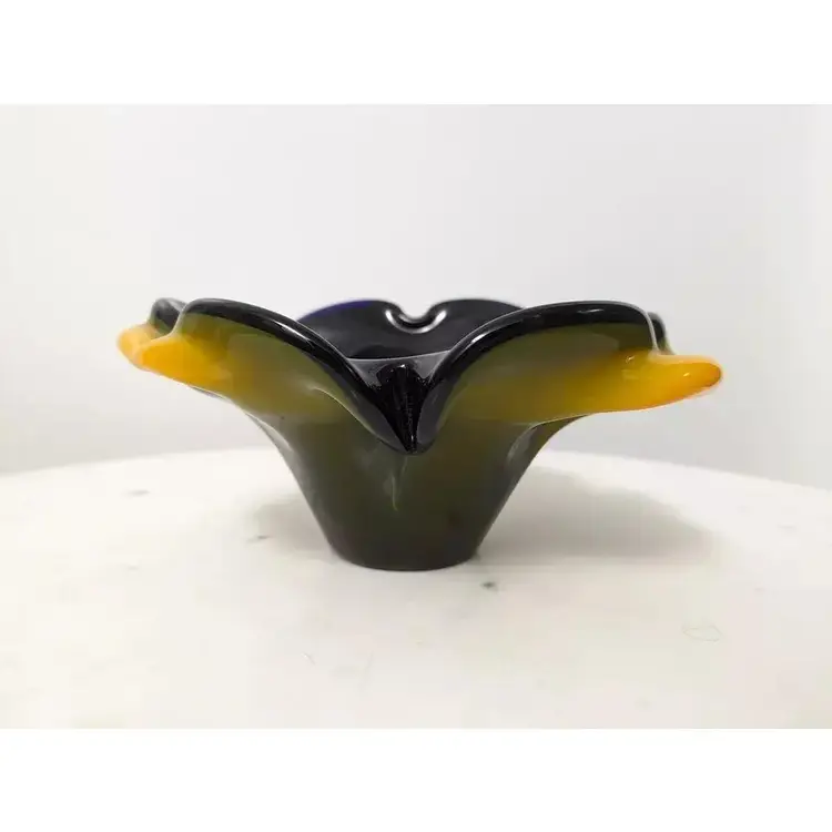 This is a unique glass trinket dish or ashtray with stunning colors of cobalt and yellow. The dish has a contemporary style and is made of cobalt and yellow glass that has been pulled into a three petal design. It is perfect for storing small items like jewelry or keys. It is approximately 3 in high and 6.5 in wide. It is in good used condition with minor scuffing on the base, please see the pictures for condition. Glows under UV 365nm Light.