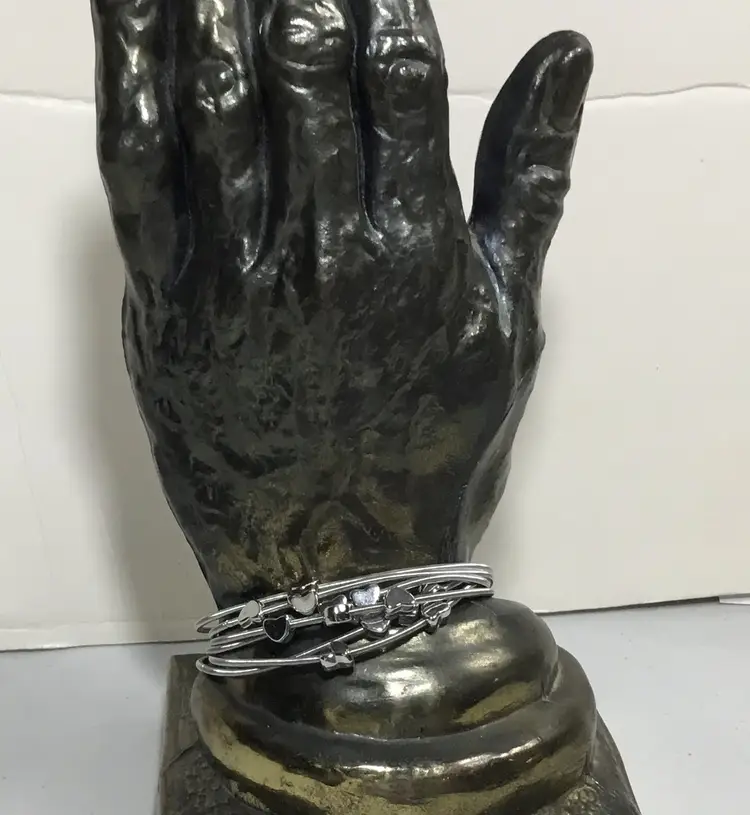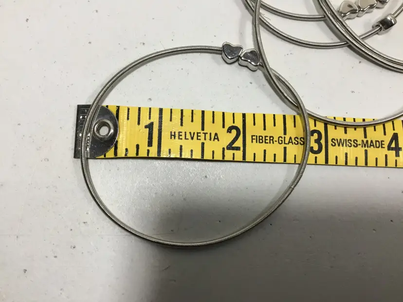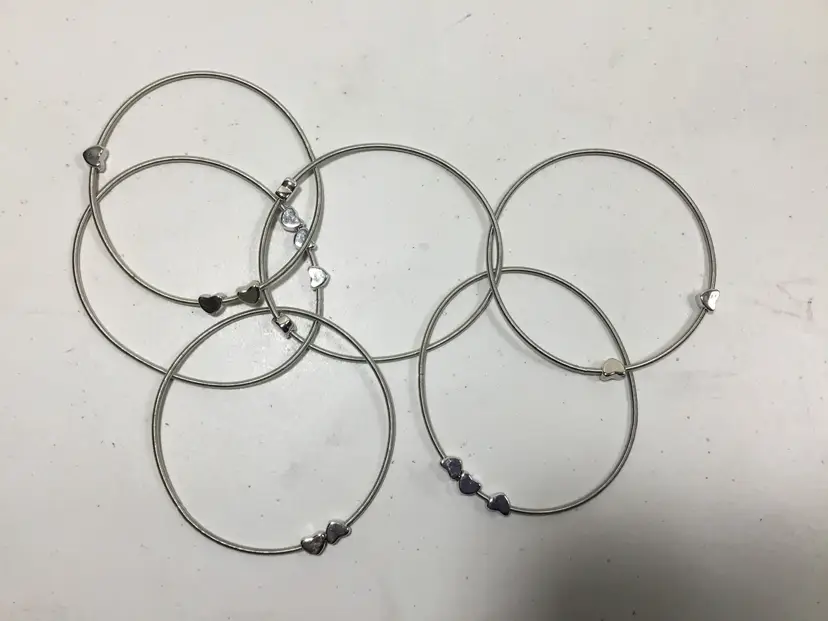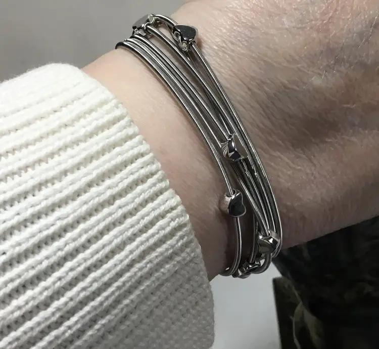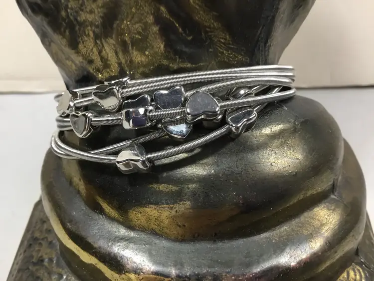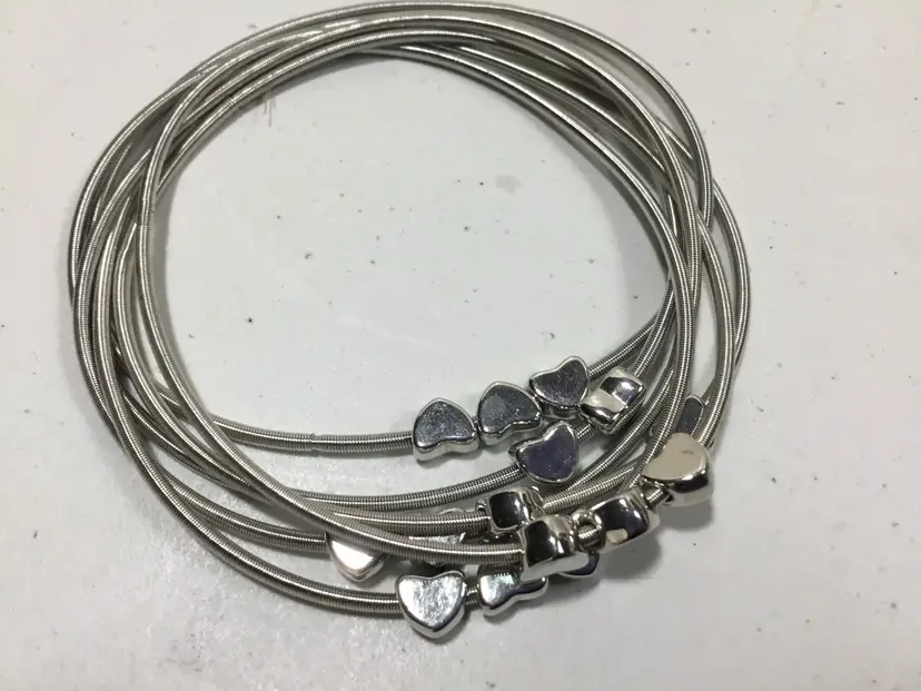 Bracelet made of 7 silver tone, small diameter spring chains. Stretches about an inch to inch and a half. Each spring has 1 to 4 small, silver tone heart beads that slide freely around on the spring chain. Light weight and fun.