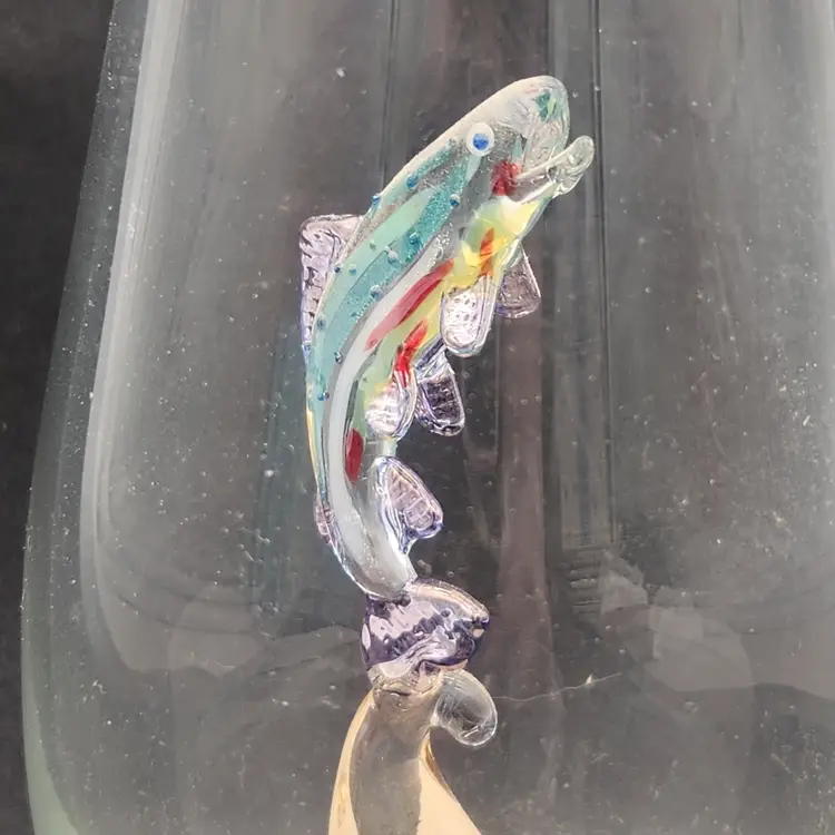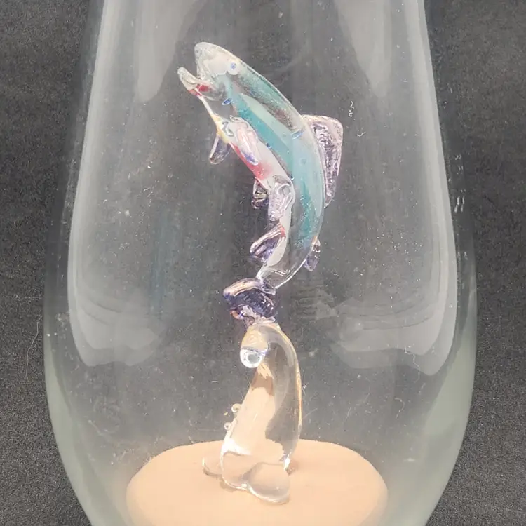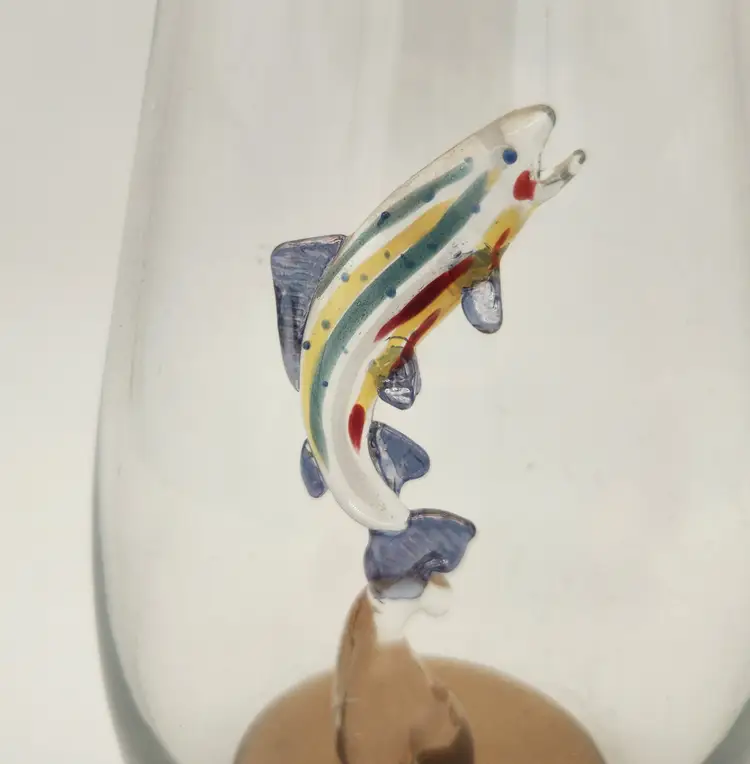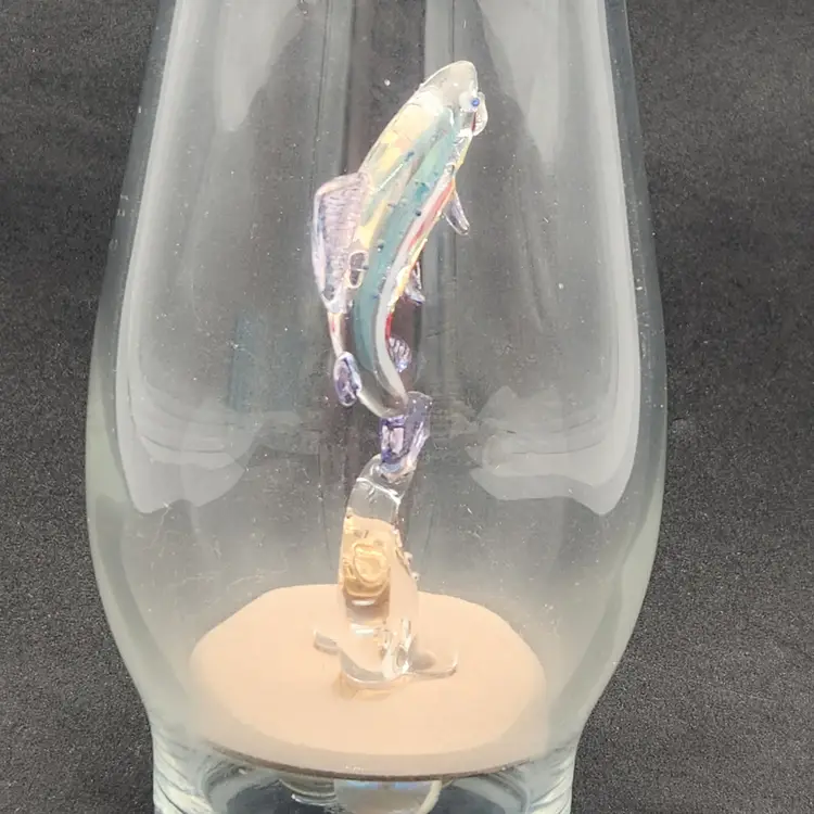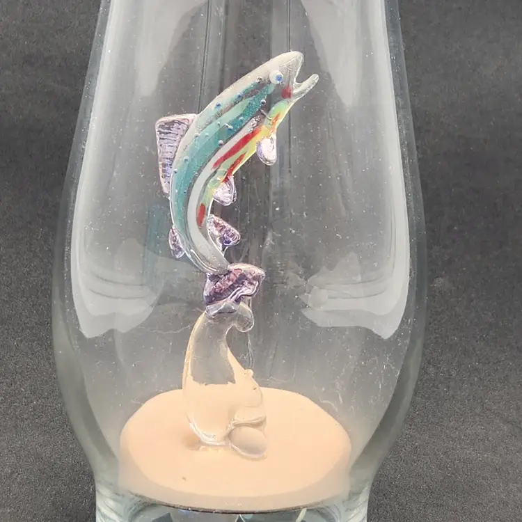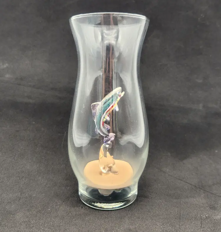 Unique Clear Glass Vase With Multi-Colored Glass Fish Suspended Inside Art Gift This beautiful art glass piece stands 6 1/2" tall. Inside, the iridescent fish is 2" long and reaches for the surface atop a 2" clear wave. The wave sits on gold glass that simulates a bed of sand and this entire structure rests on 3 iridescent globes. Although there is a Maker's Mark on the bottom, it was incredibly hard to photograph or see clearly and I have not been able to find any information on the creation of this beauty (see photo). I have based my price on the very few similar items I have been able to uncover. Excellent condition: no chips, or cracks. From a Smoke Free Environment. Item shown is the exact item you will receive. Ships from Northeast Ohio.