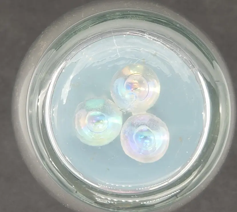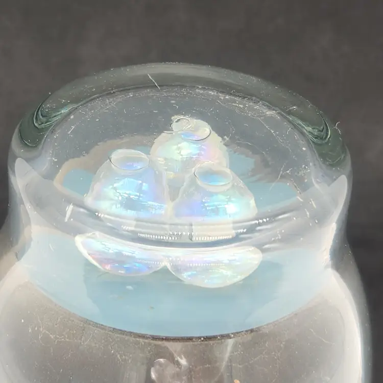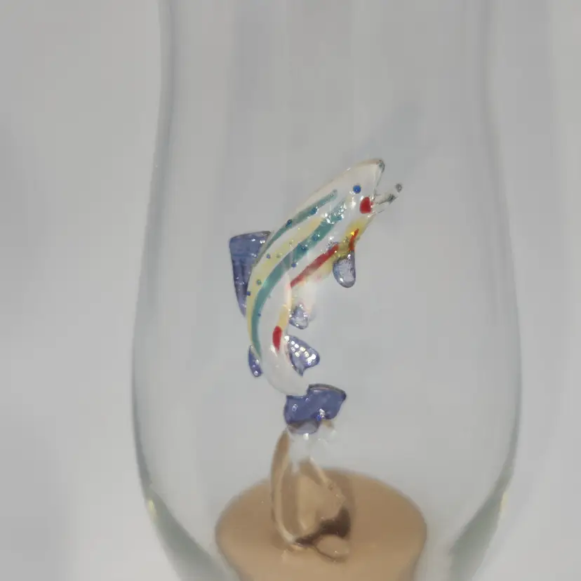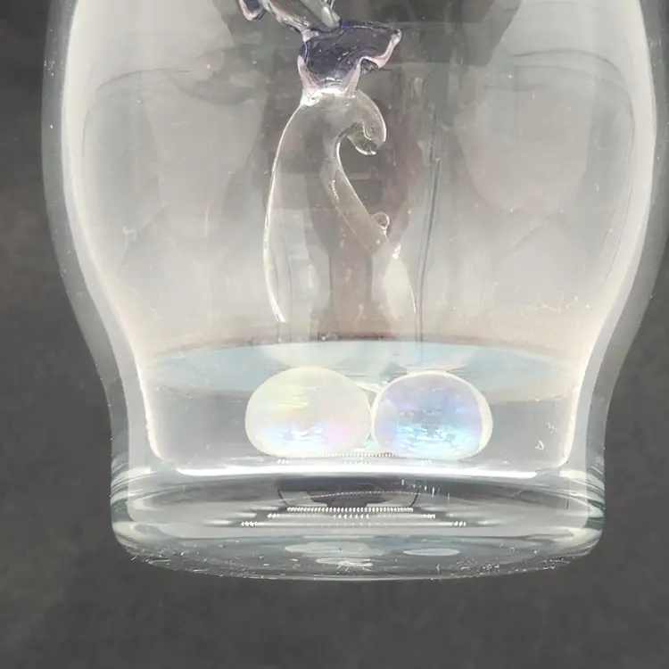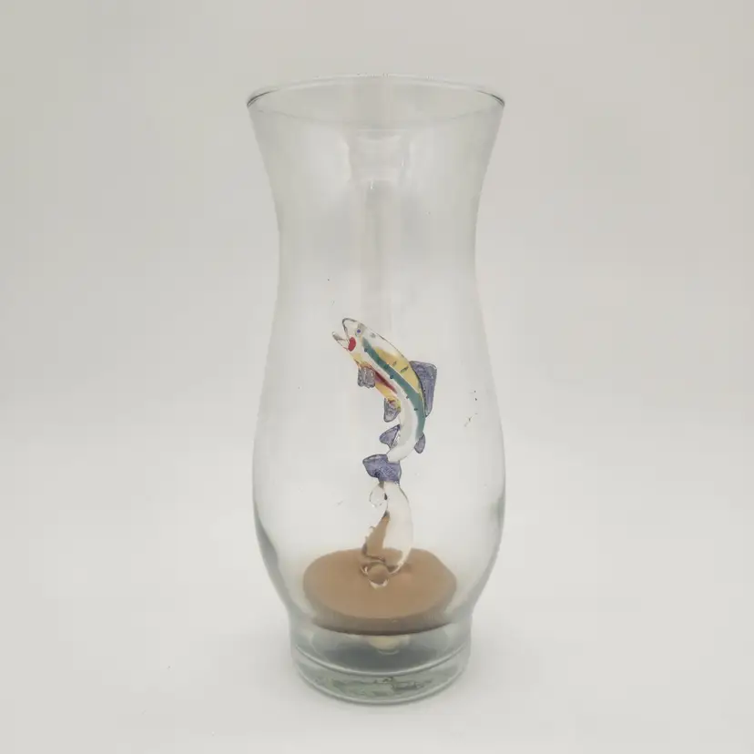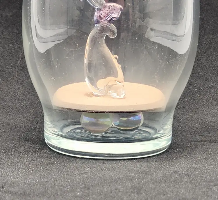 Unique Clear Glass Vase With Multi-Colored Glass Fish Suspended Inside Art Gift This beautiful art glass piece stands 6 1/2" tall. Inside, the iridescent fish is 2" long and reaches for the surface atop a 2" clear wave. The wave sits on gold glass that simulates a bed of sand and this entire structure rests on 3 iridescent globes. Although there is a Maker's Mark on the bottom, it was incredibly hard to photograph or see clearly and I have not been able to find any information on the creation of this beauty (see photo). I have based my price on the very few similar items I have been able to uncover. Excellent condition: no chips, or cracks. From a Smoke Free Environment. Item shown is the exact item you will receive. Ships from Northeast Ohio.