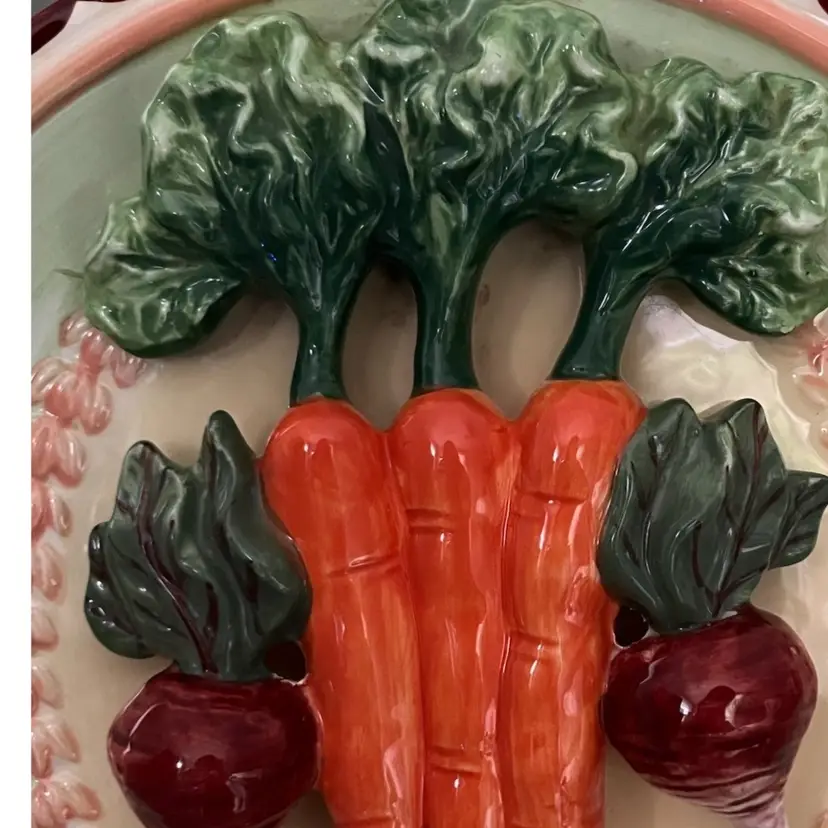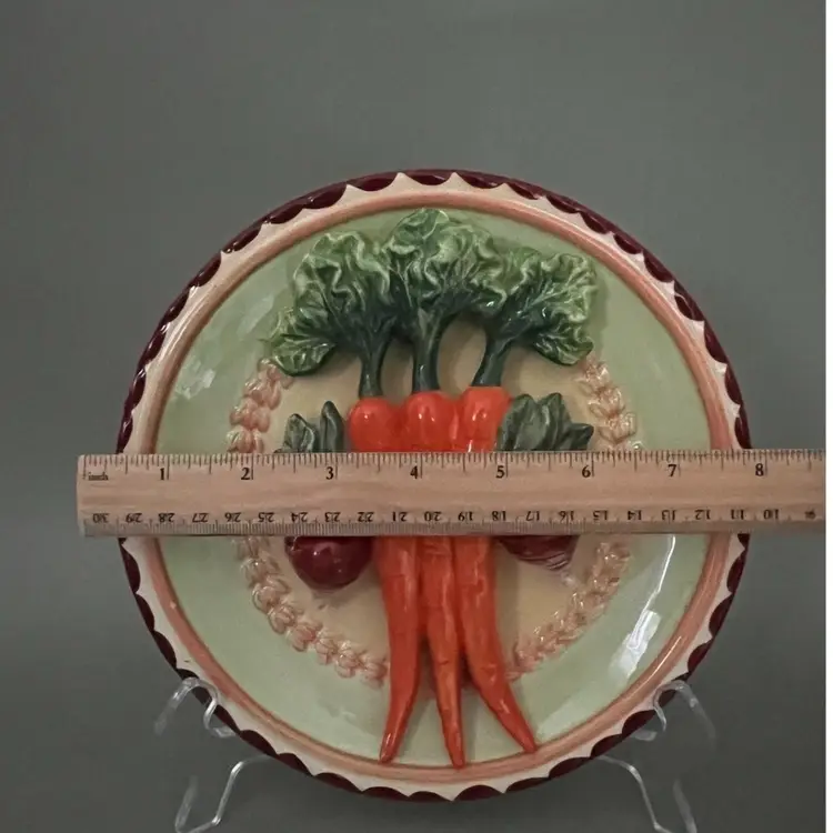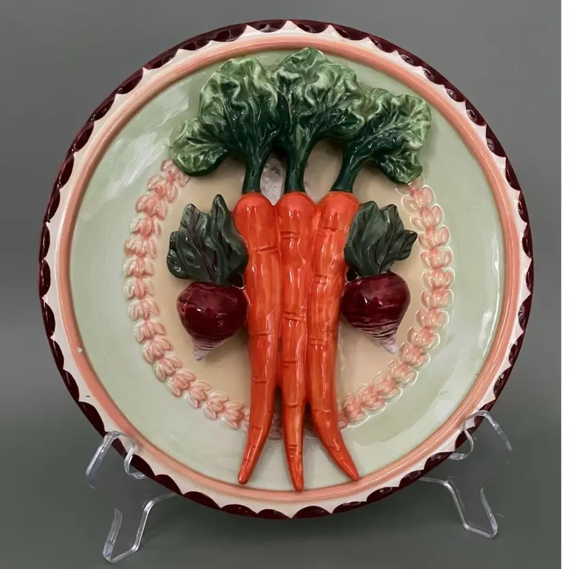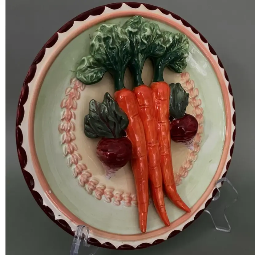The Unique Decorative 3D Carrot Plate by Bella Casa by Ganz is a charming collector's item that adds a touch of whimsy to any decor. Bella Casa by Ganz is known for Unique 3D design Wall plates or platters with trompe l'oeil (optical illusion) effects. The hand-painted, sculpted, fruit and vegetables appear to be on the plate. These are the most distinctive of the collection.