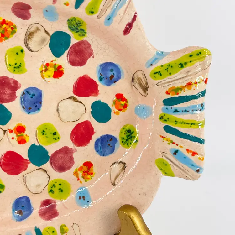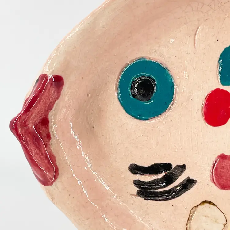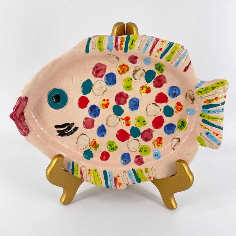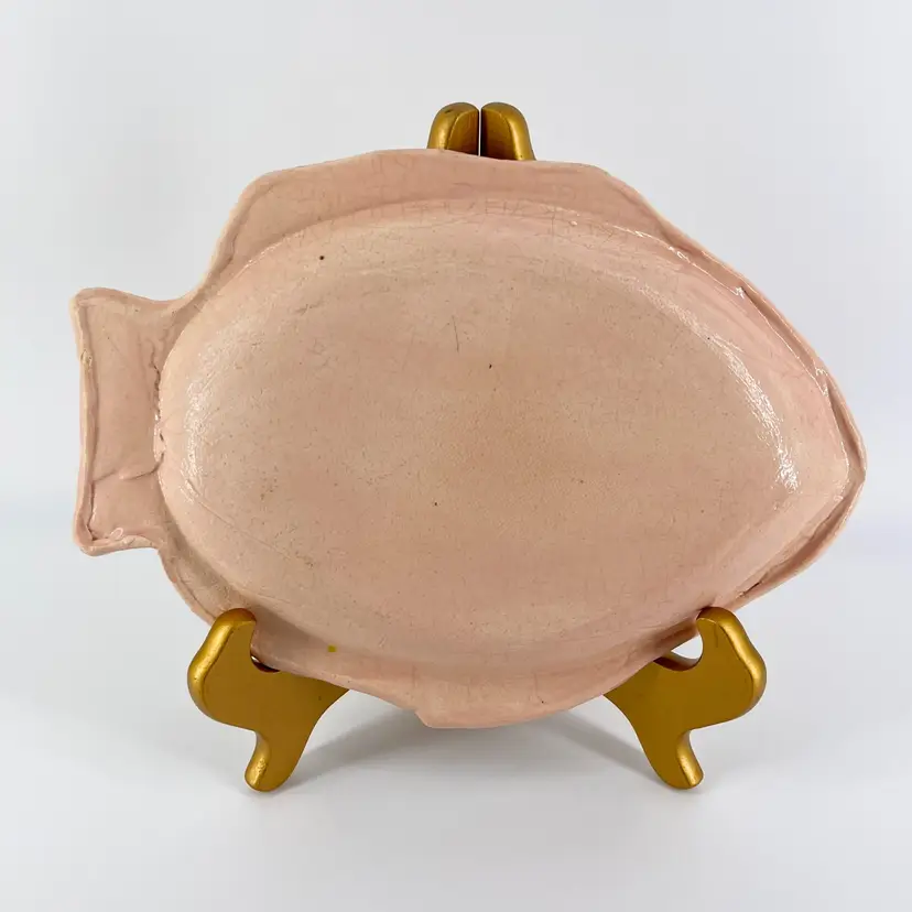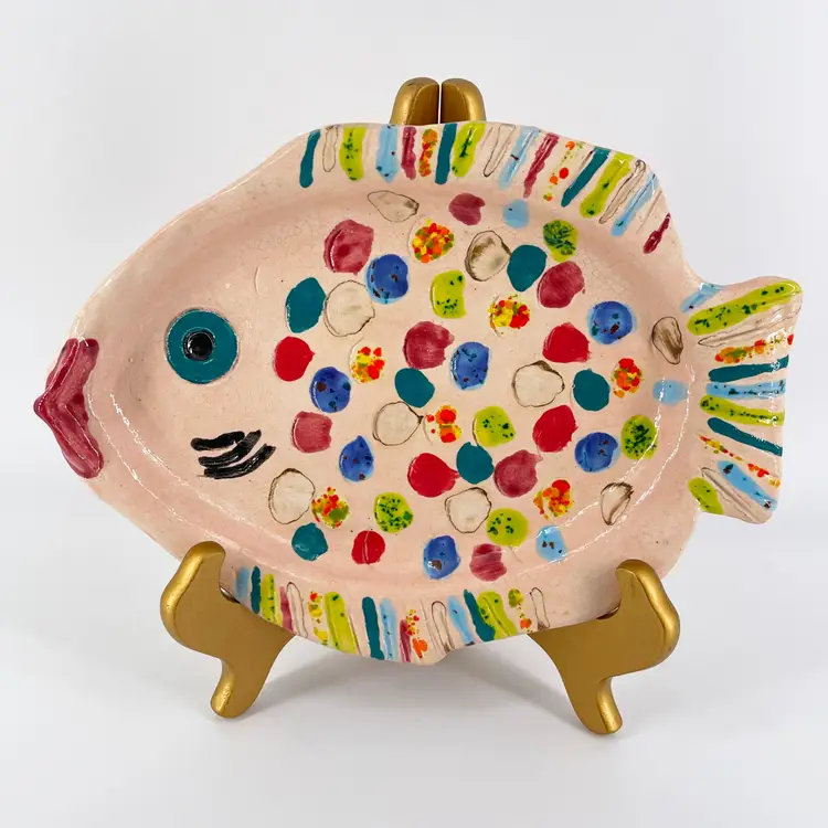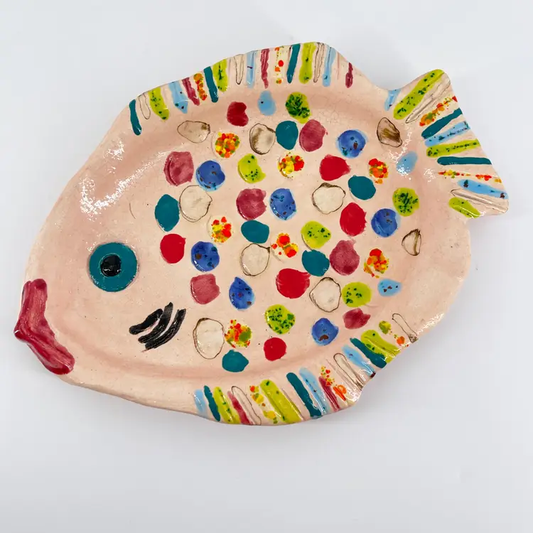 This handcrafted fish shaped plate features an etched and hand painted multicolored design. It measures 10.5"x8" and is in great condition. There are no cracks, breaks or repairs. There are 2 small chips on the underside of the plate. (See photos).