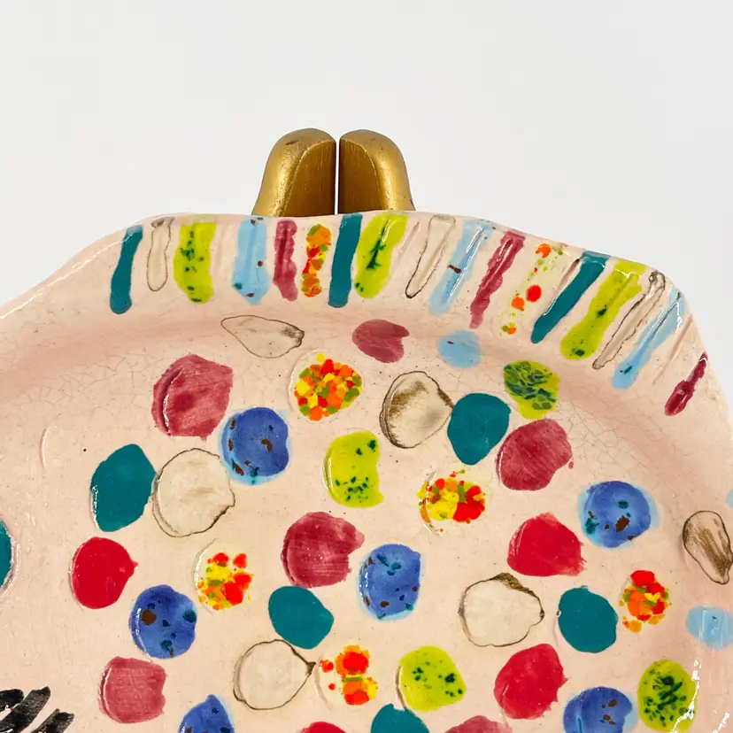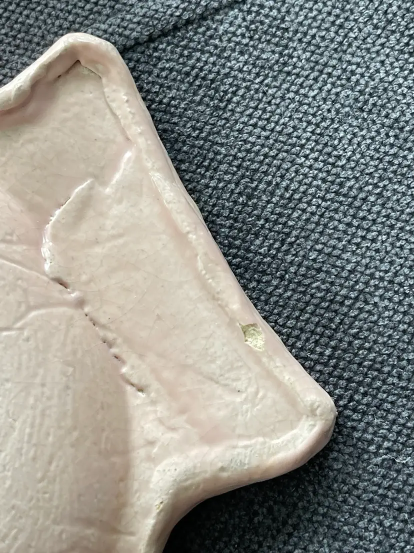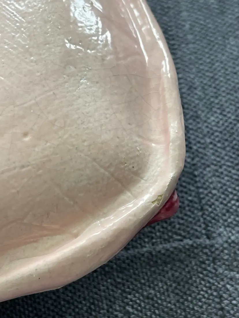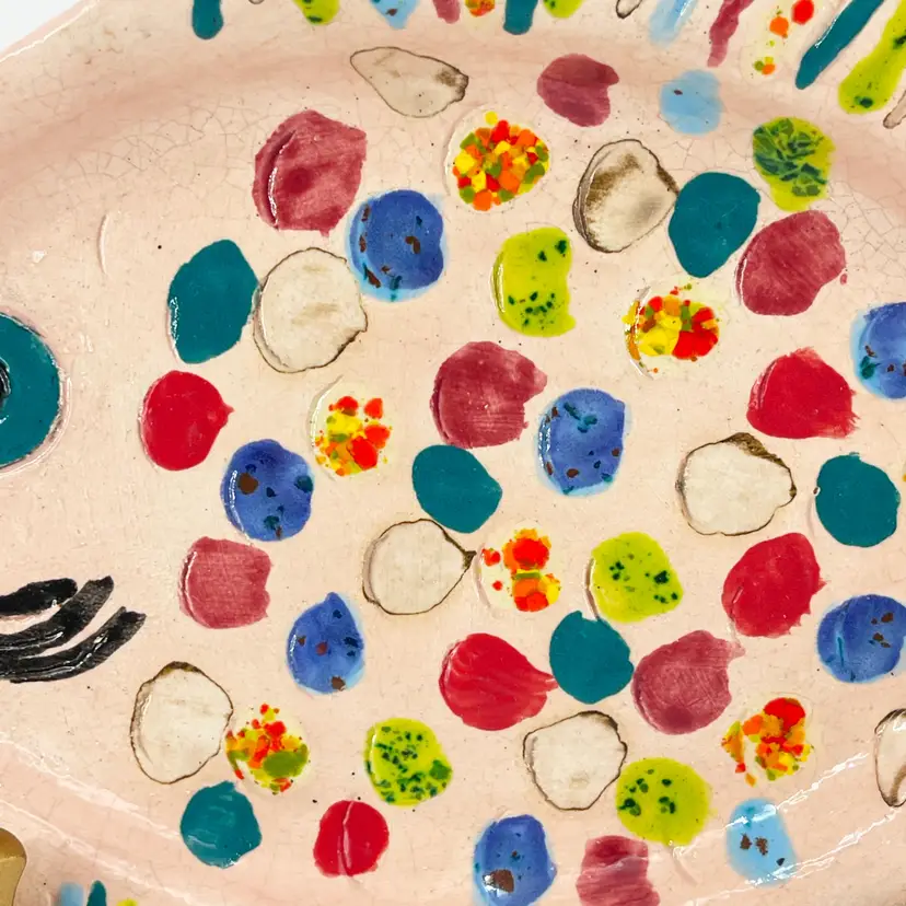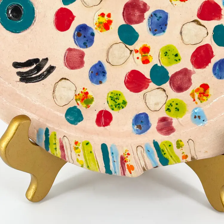 This handcrafted fish shaped plate features an etched and hand painted multicolored design. It measures 10.5"x8" and is in great condition. There are no cracks, breaks or repairs. There are 2 small chips on the underside of the plate. (See photos).